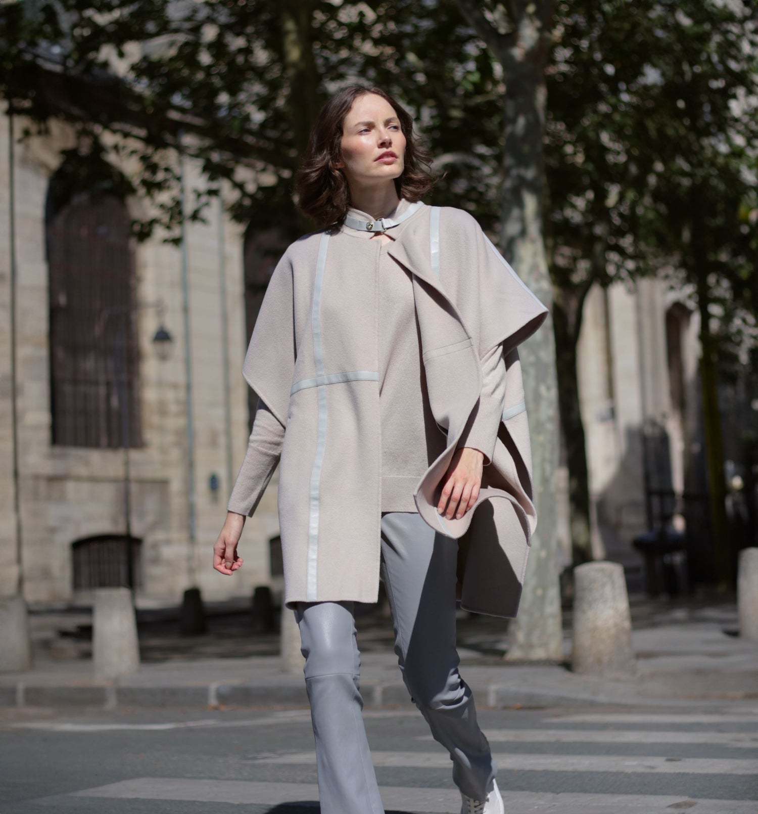 Confectionnée dans une laine luxueuse rehaussée de bandes en cuir contrastées, notre cape pour femme VAZILI incarne la modernité des lignes MAX&MOI.
