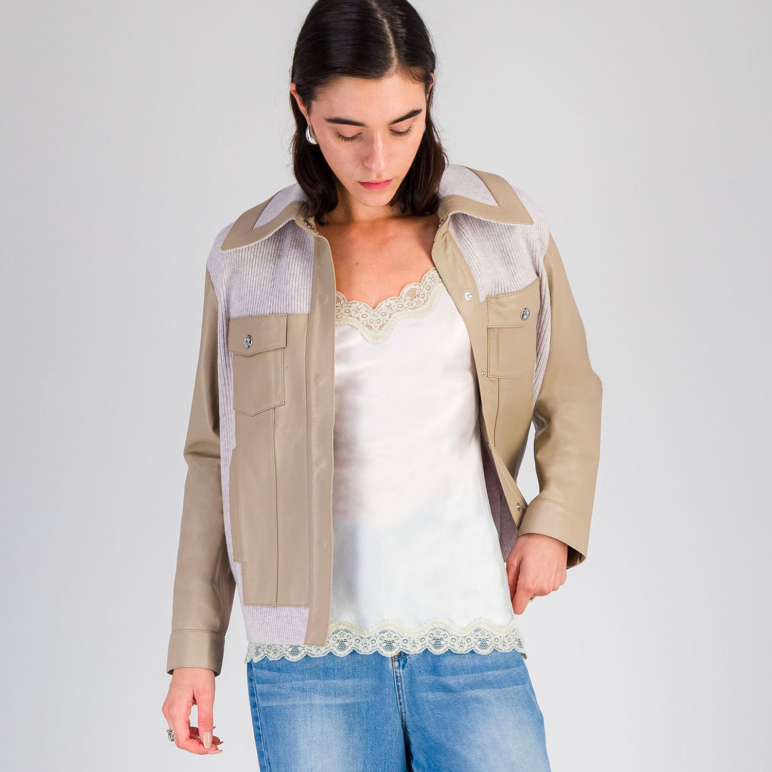 Inspired by the timeless denim jacket, our two-tone VESSIA jacket reimagines this classic piece of women’s wardrobe in a luxurious version combining soft lamb leather, wool, and cashmere. Its structured lines and interplay of textures create a modern silhouette, offering a fresh interpretation of contemporary chic according to MAX&MOI. The ultimate chic-casual autumn jacket.