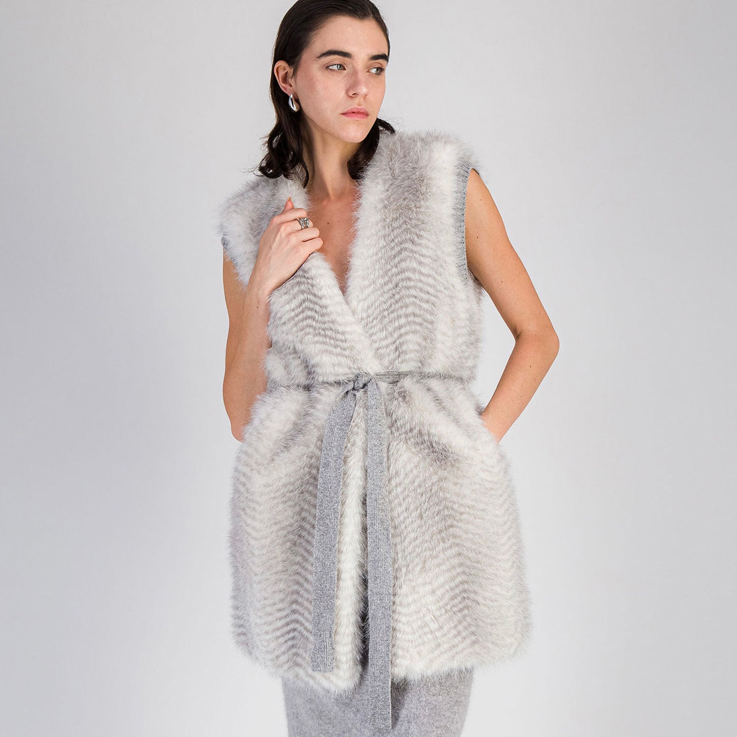 Crafted in Furever faux fur with a soft, plush texture, it charms with its chevron pattern and sleeveless cut that modernizes the silhouette. Its knitted belt cinches the waist, allowing you to adjust the look to your liking.