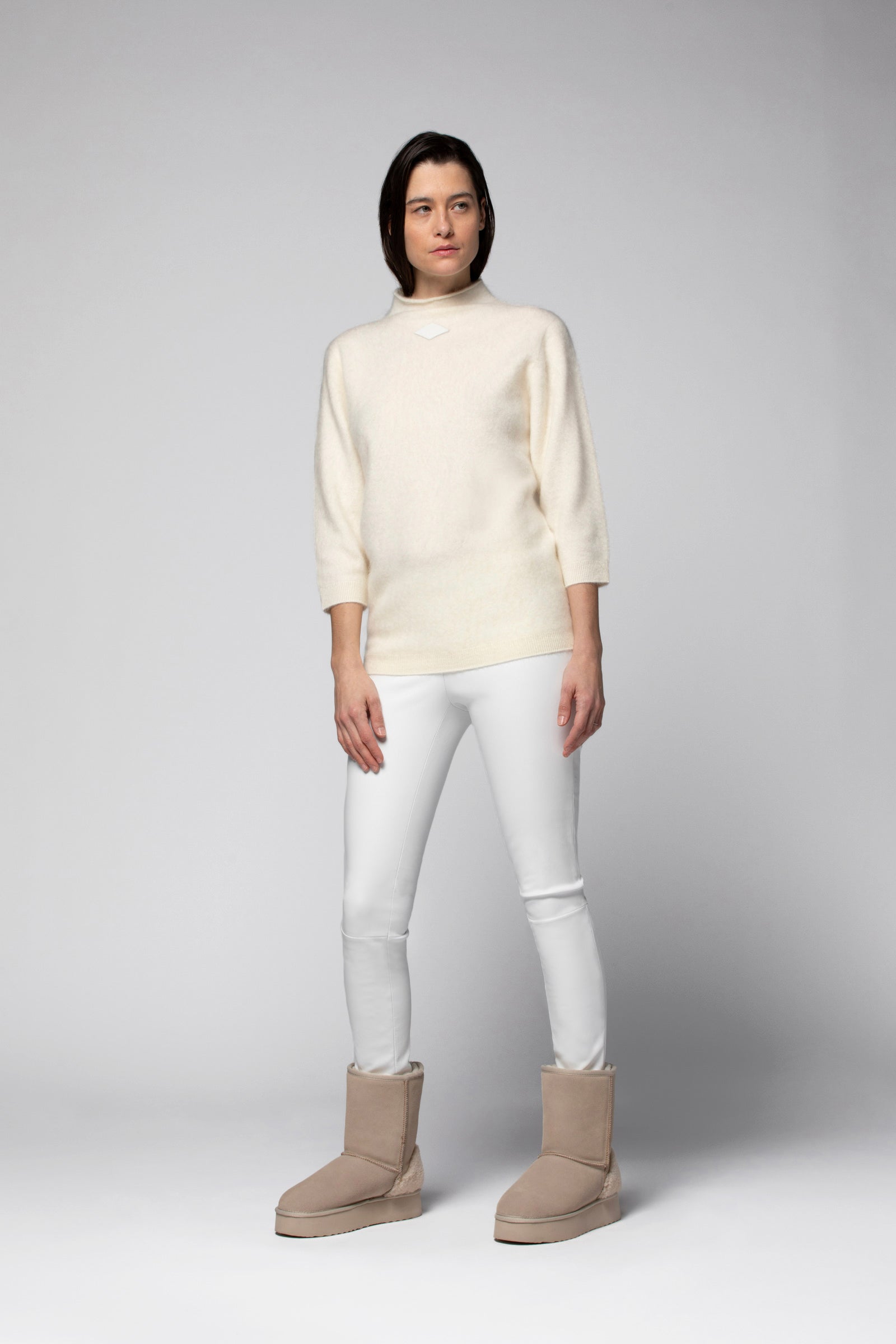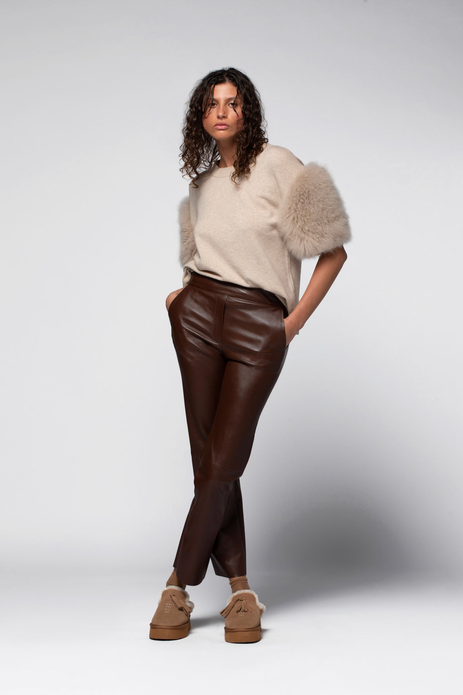 • Closed over soft leather pants, one of MAX&MOI’s iconic pieces, it creates a look that is both relaxed and confident. The contrast between the soft knit and smooth leather highlights the modernity of the style.