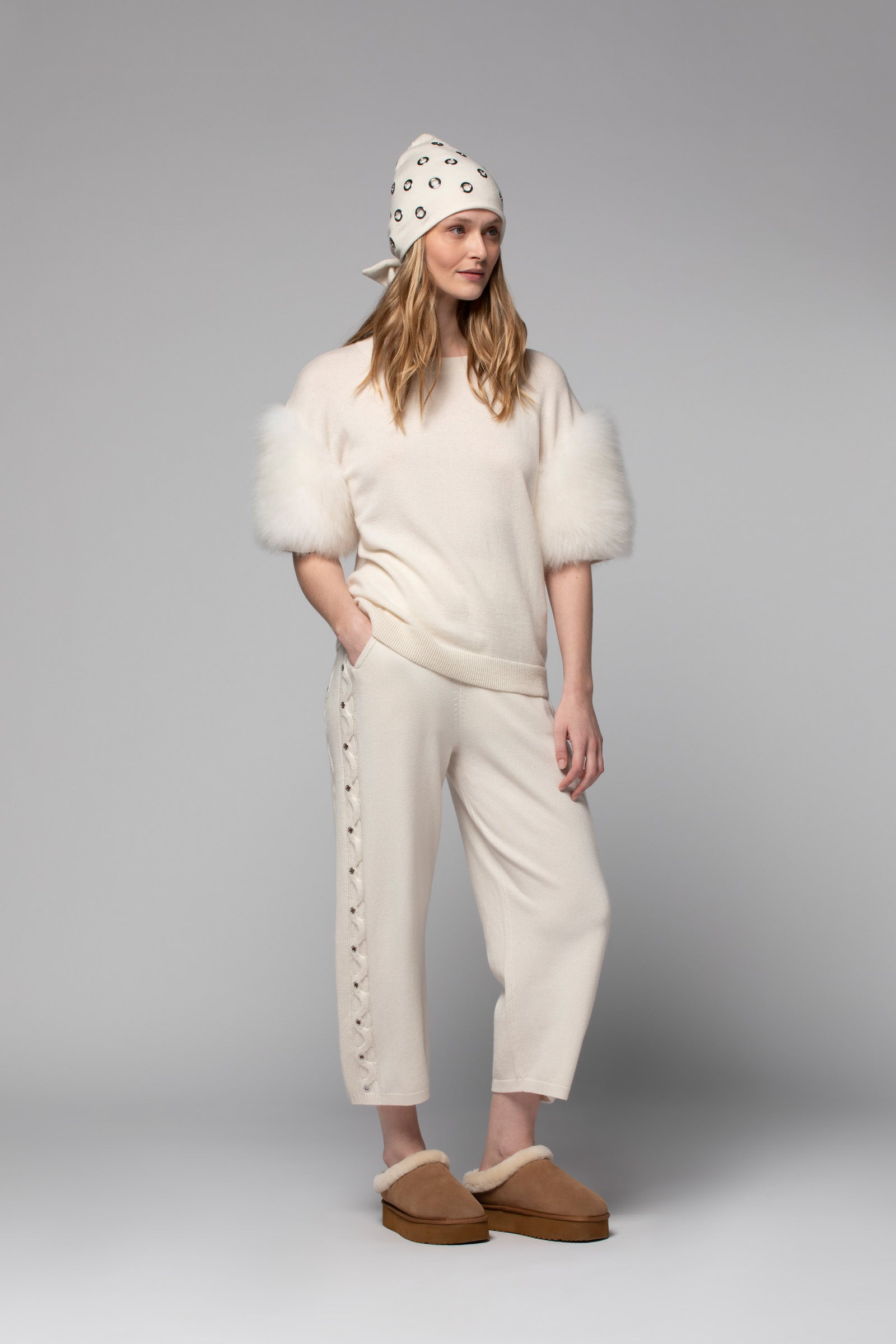 This short-sleeved sweater will quickly become a standout in your winter wardrobe. For a sophisticated monochrome look, pair it with cashmere pants from the MAX&MOI collection. For a more urban feel, offset its ultra-chic lines with jeans or our iconic lambskin leather leggings.