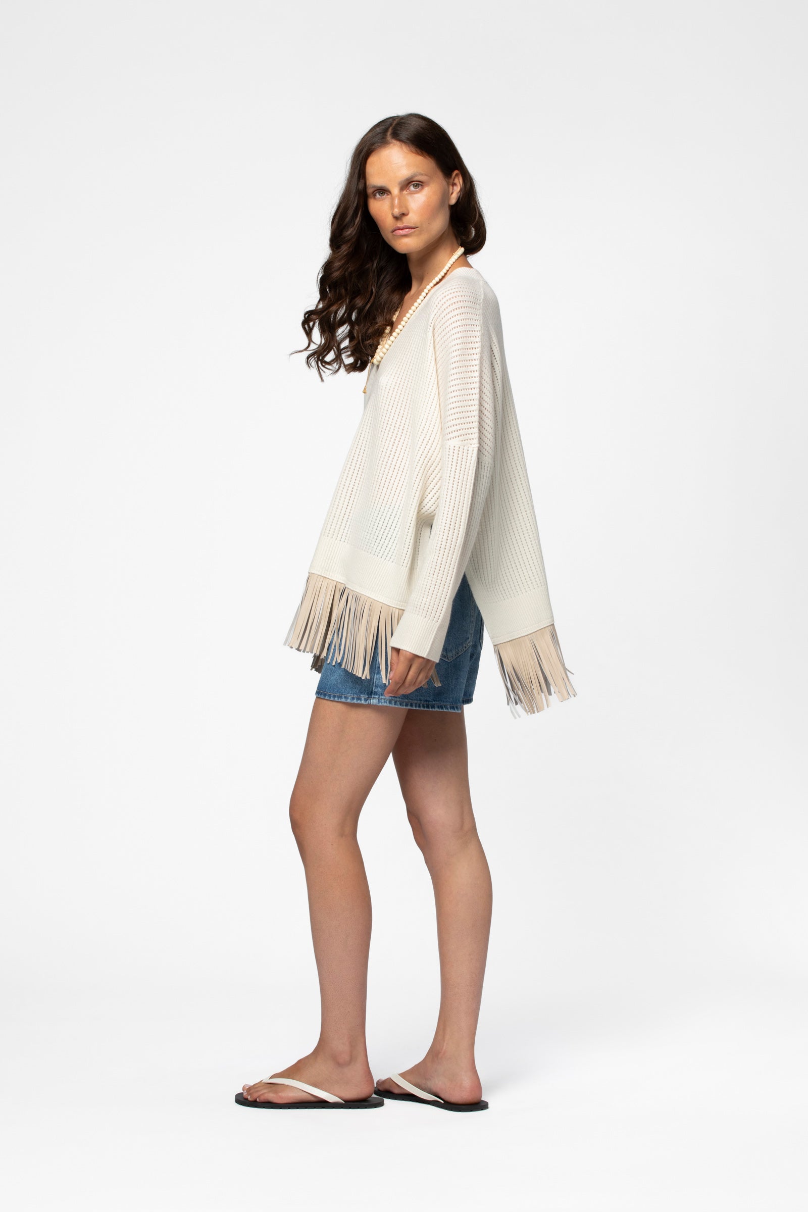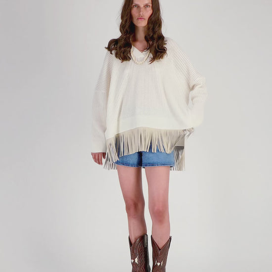 V-neck openwork sweater with leather fringes