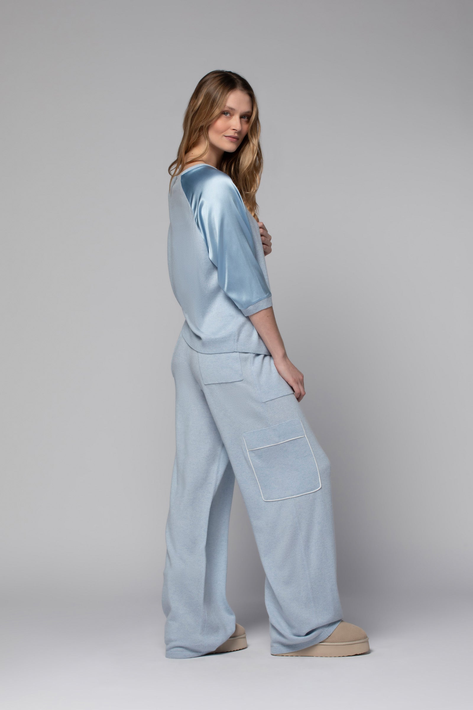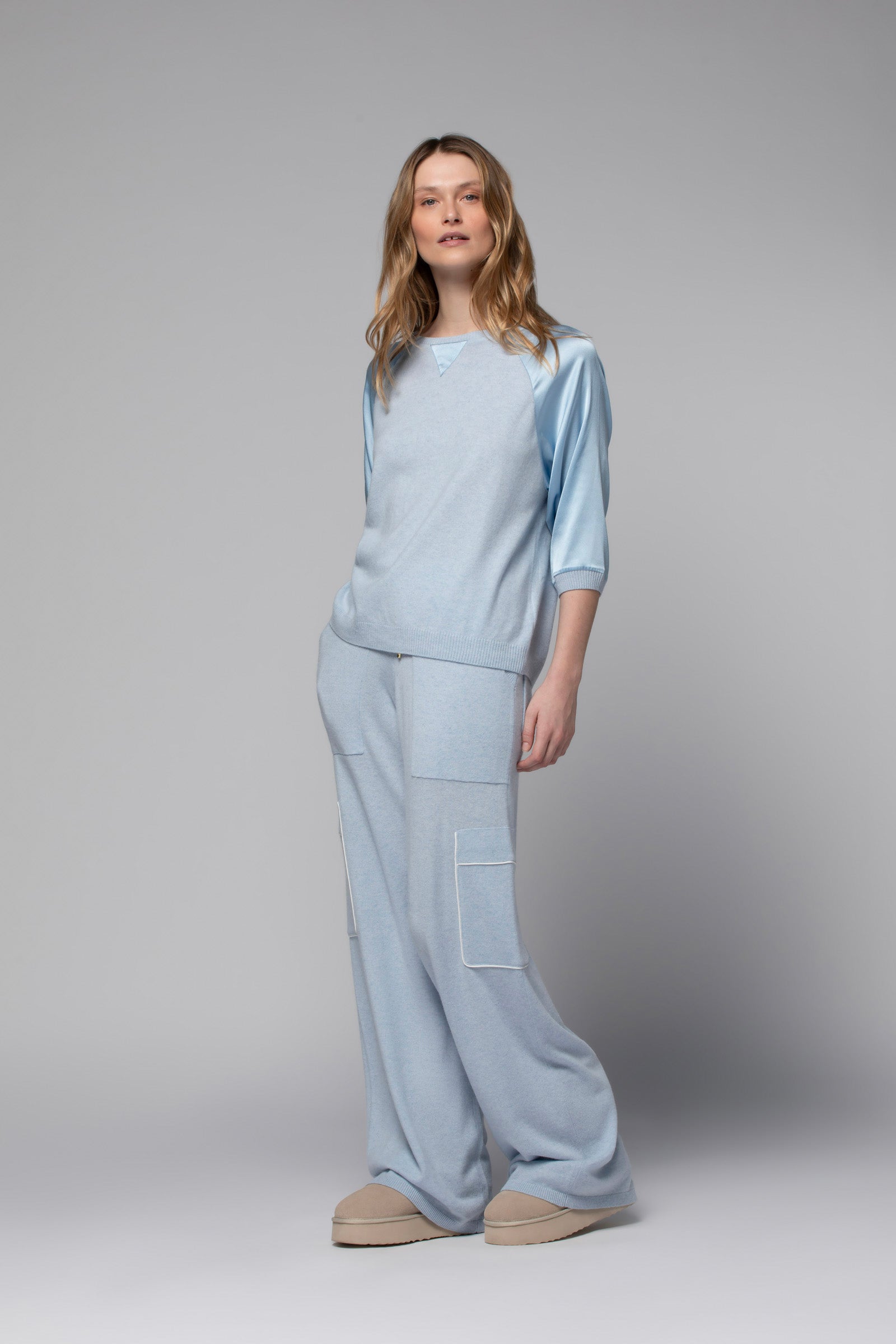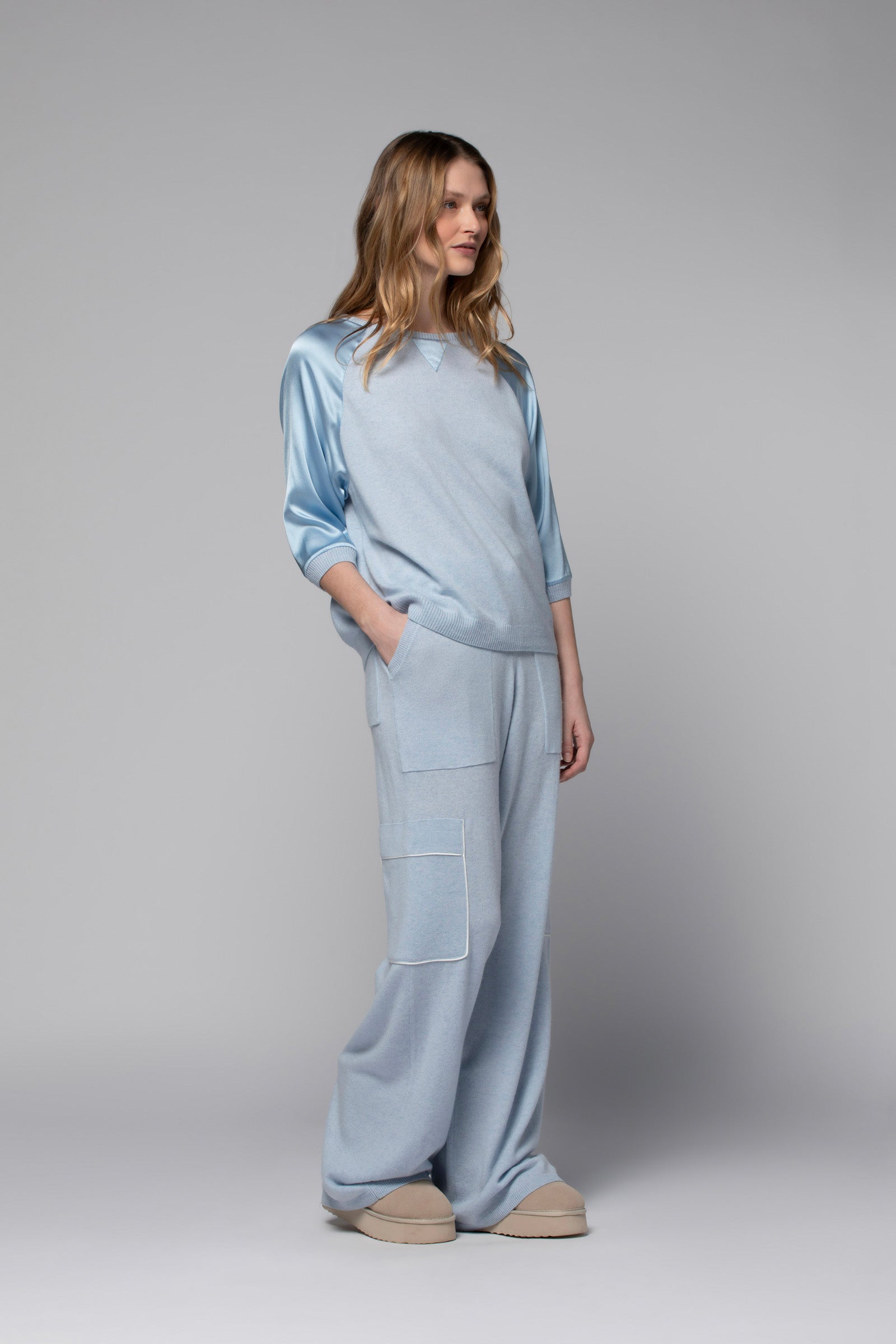 - Three-quarter raglan silk sleeves