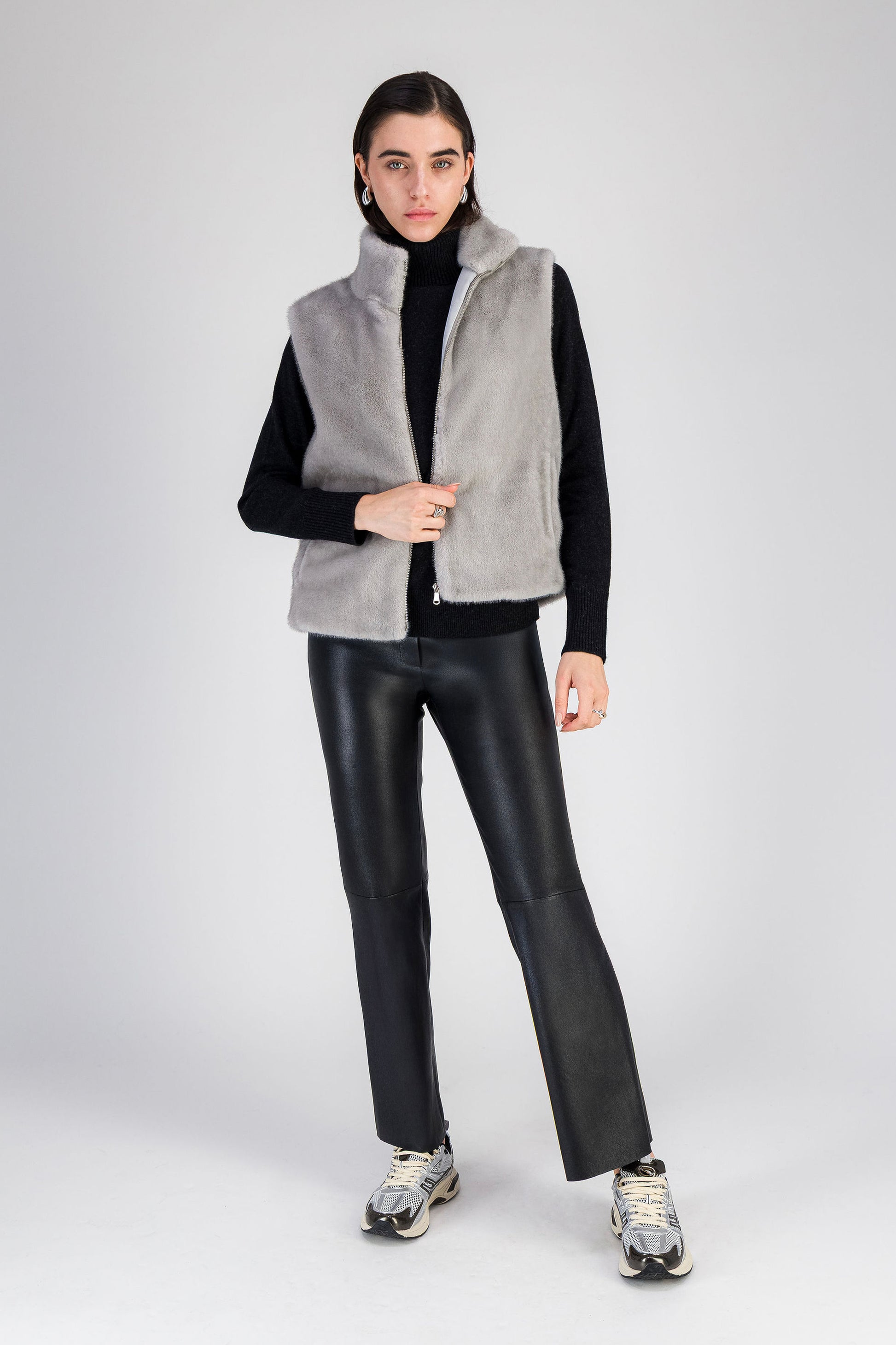 The sleeveless design makes it easy to layer over a women’s silk shirt, a cashmere sweater, or a knitted dress. Paired with denim pants, it becomes the perfect companion for a city look, and worn with our iconic lambskin leather leggings, it transforms into a glamorous piece ideal for a more sophisticated silhouette.