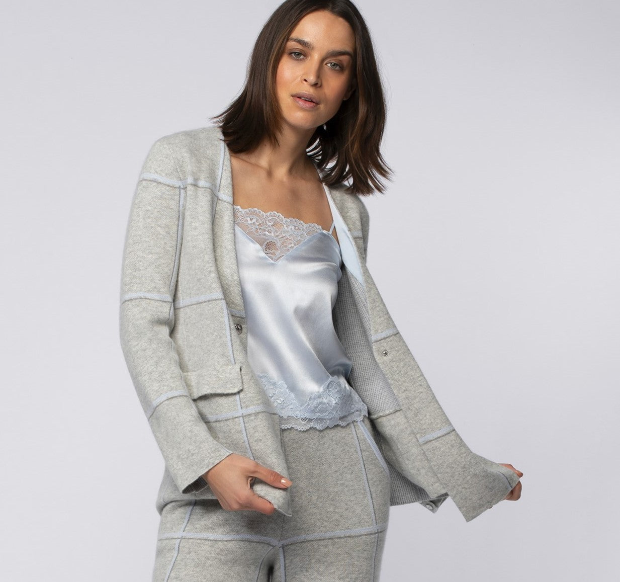 As for the pinstripe suit, reimagined in cashmere, it is one of the season's favorites. Featuring a plaid pattern borrowed from menswear and enhanced with lurex threads, it provides a modern and elegant take on officewear. Worn as a complete look with a silk and lace camisole, this jacket-and-pant ensemble feminizes the timeless suit, allowing you to reinvent your style.