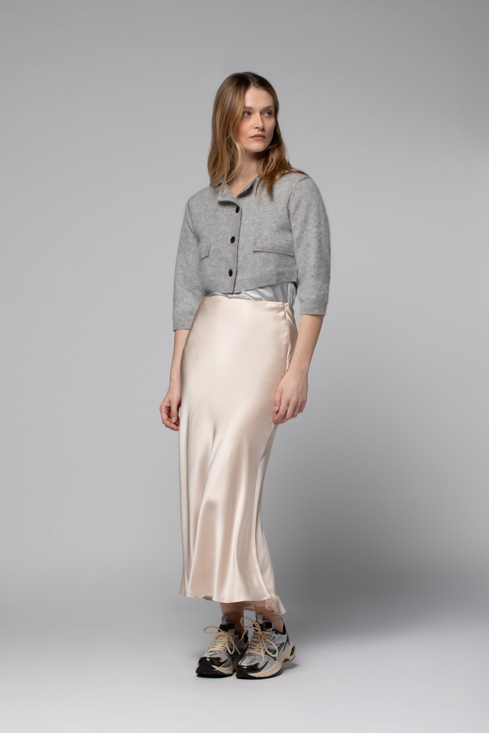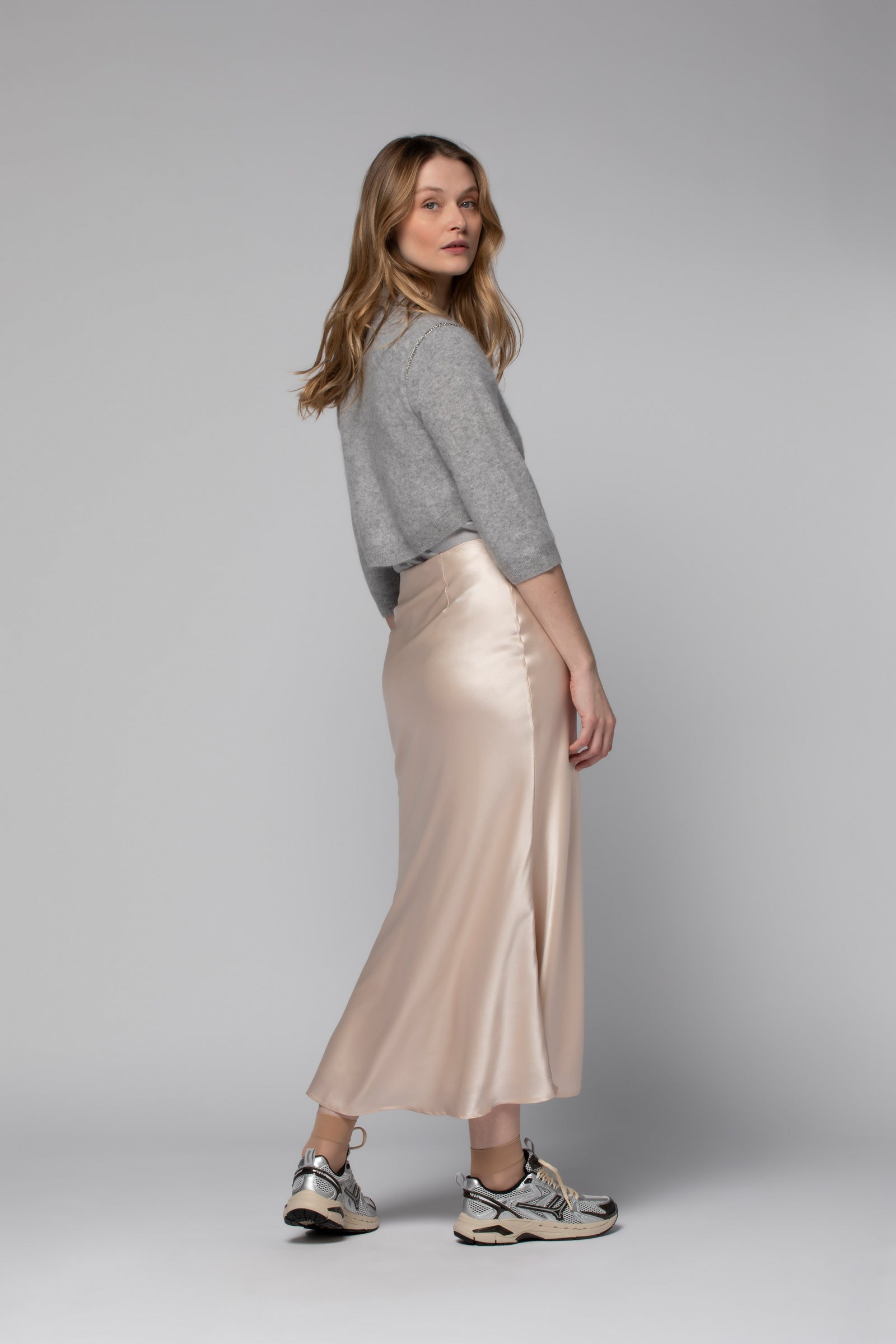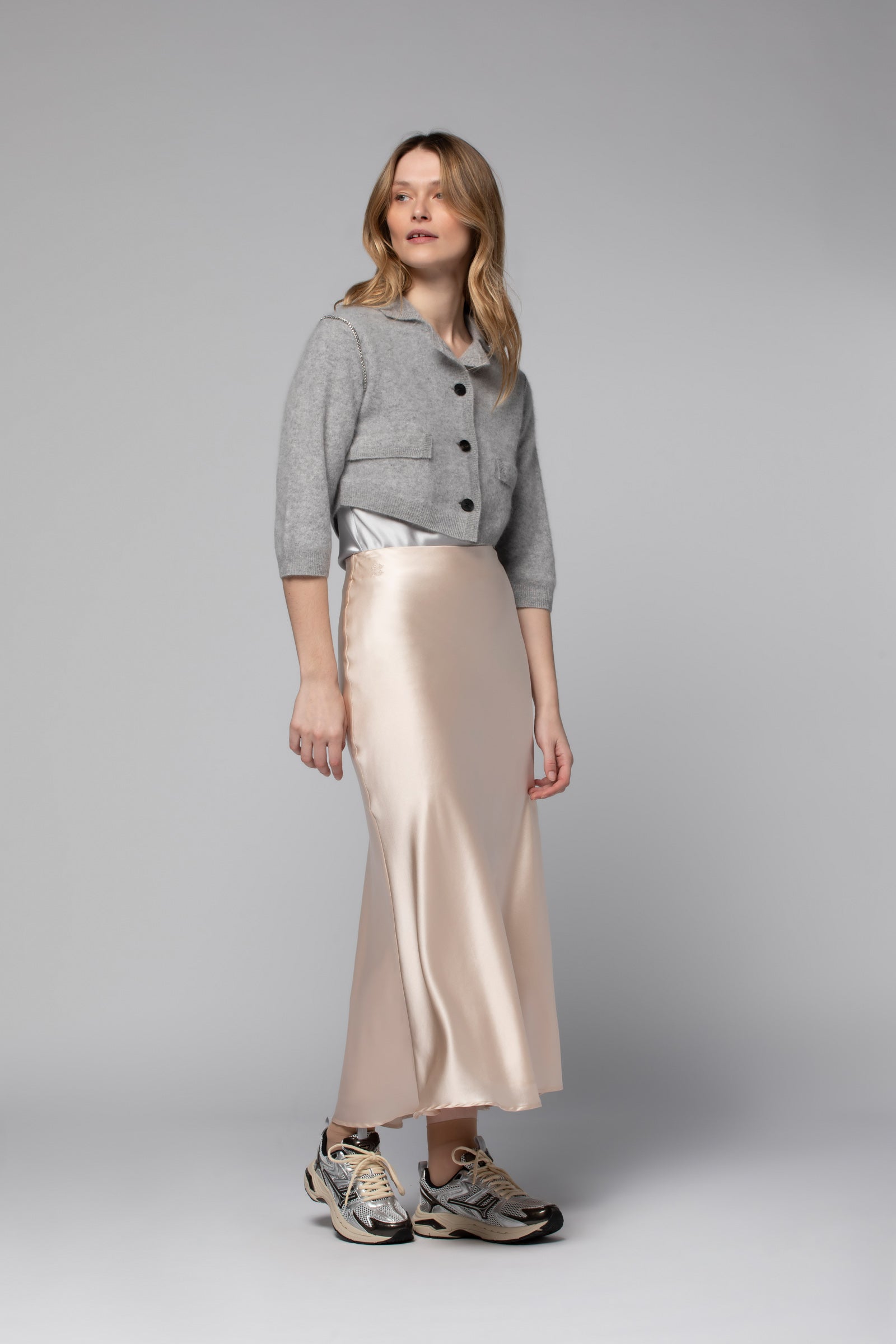 For a sophisticated look, pair it with a silk blouse or top from the MAX\&MOI collection for a full silk ensemble. For a more urban twist, style it with a cashmere sweater or a seasonal jacket for a modern, elegant contrast.