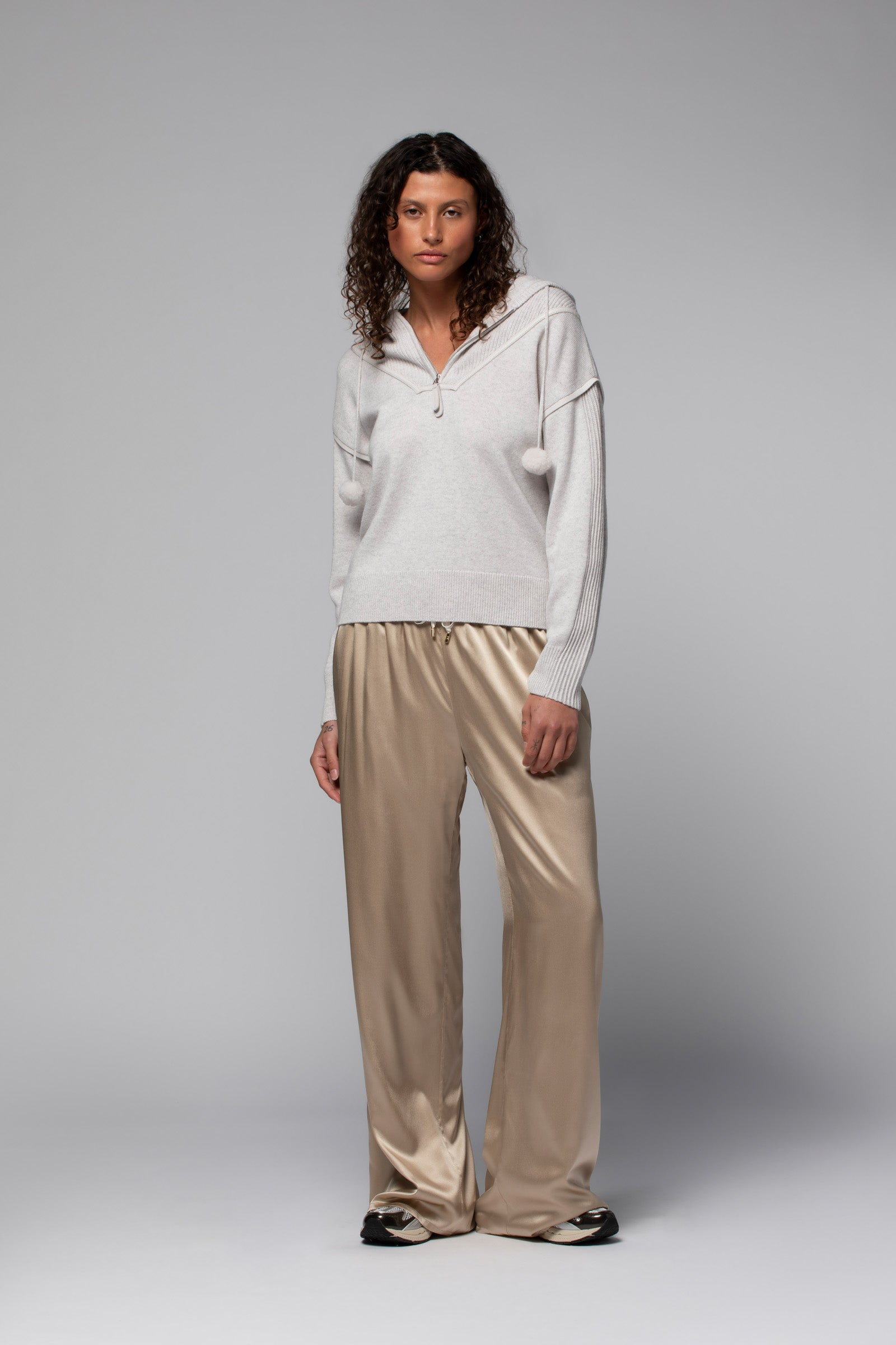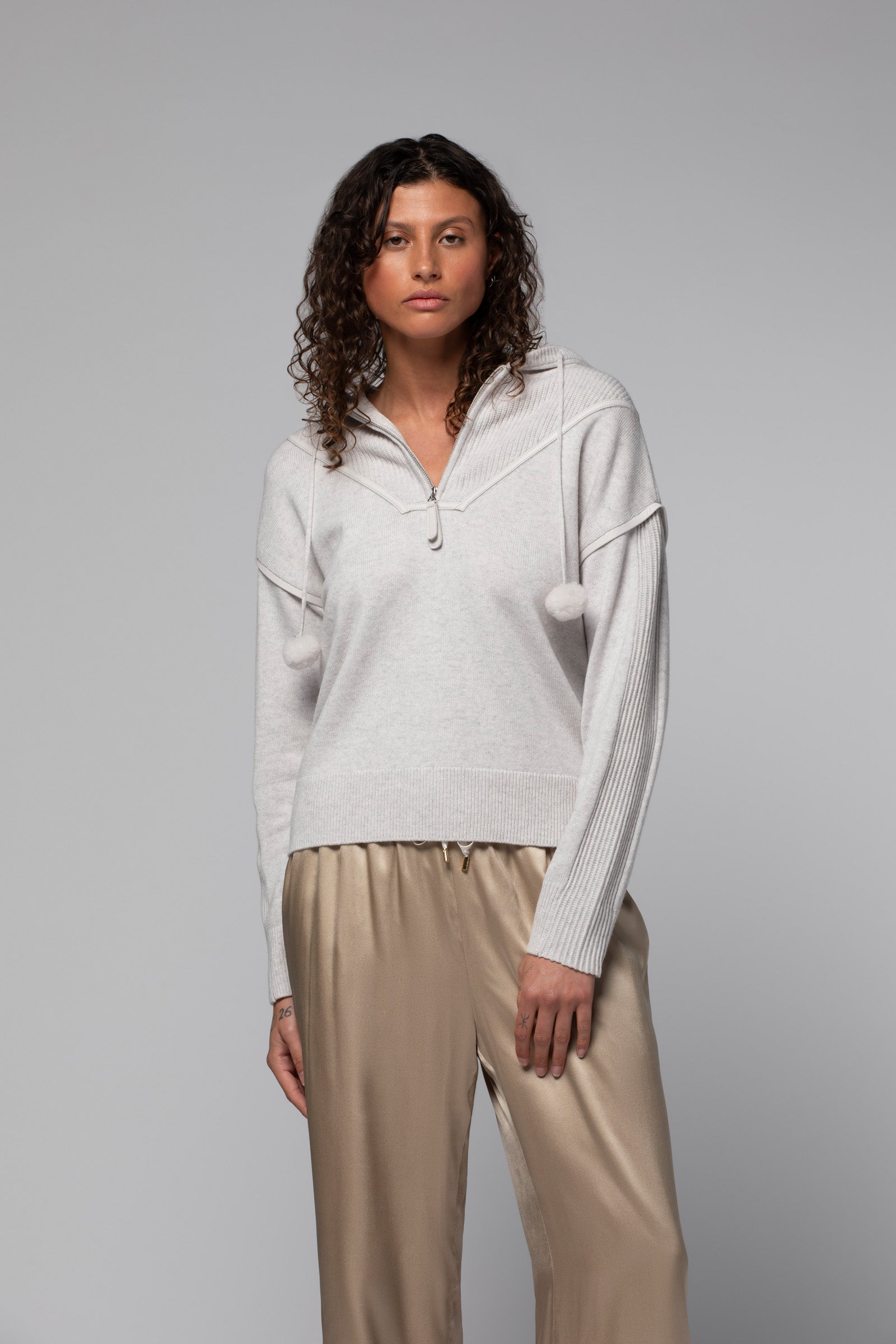 Our PELOISE hoodie is an irresistibly charming piece, adorned with removable Furever faux fur pom-poms. Crafted from a luxurious wool and cashmere blend, it gently hugs the body, offering exceptional softness and comfort. The zipped collar reveals a decorative knit bib that also accents the sleeves, adding a subtle graphic touch. True to the MAX\&MOI savoir-faire, it’s enhanced with elegant leather trims that define the silhouette and lend a resolutely modern edge. With its generous hood, this women’s cashmere sweater perfectly blends style and practicality.
