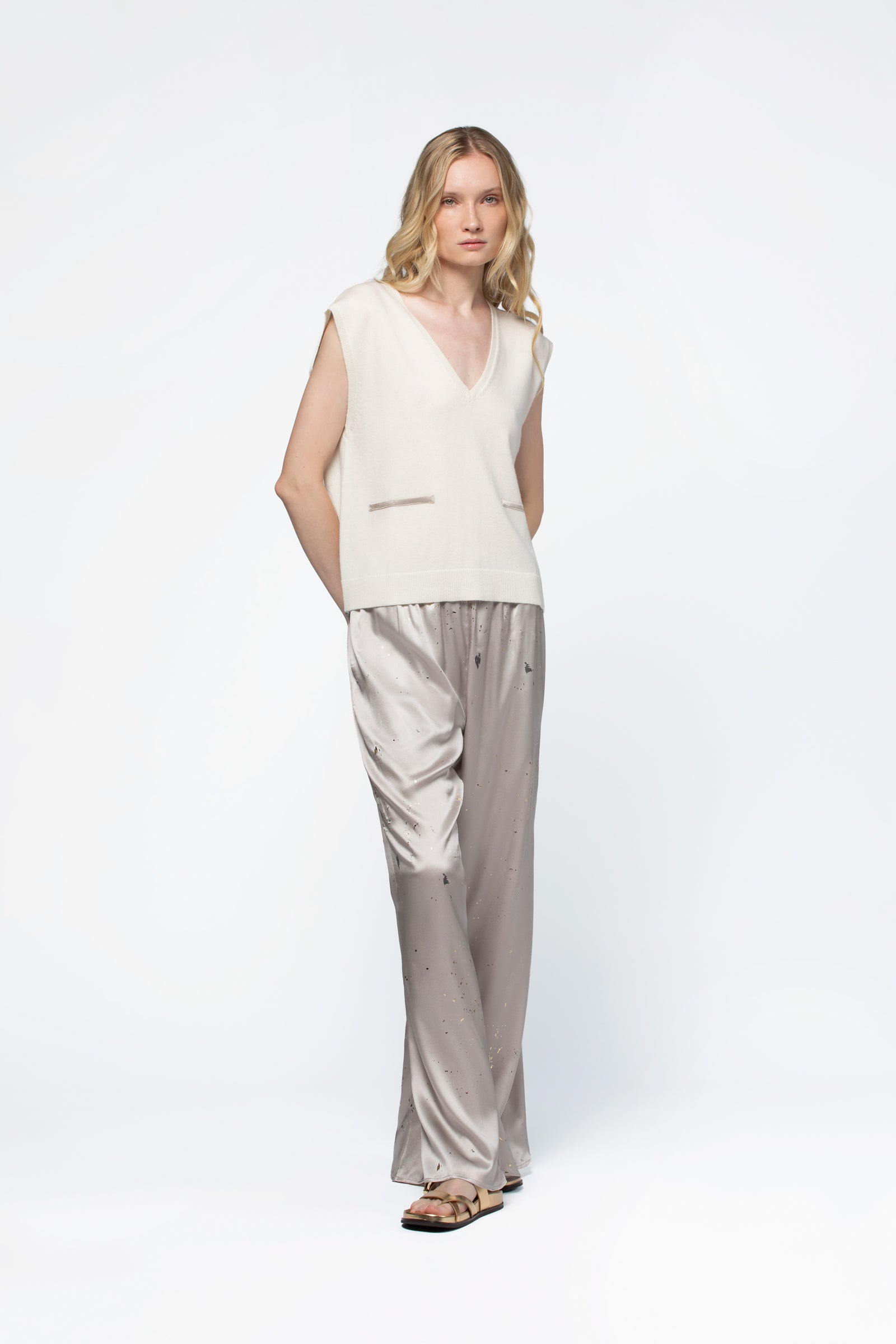 This relaxed-fit sleeveless knit features a feminine, structured V-neck, enhanced by two decorative silk piped pockets at the front, adding a refined and subtly contrasting touch.