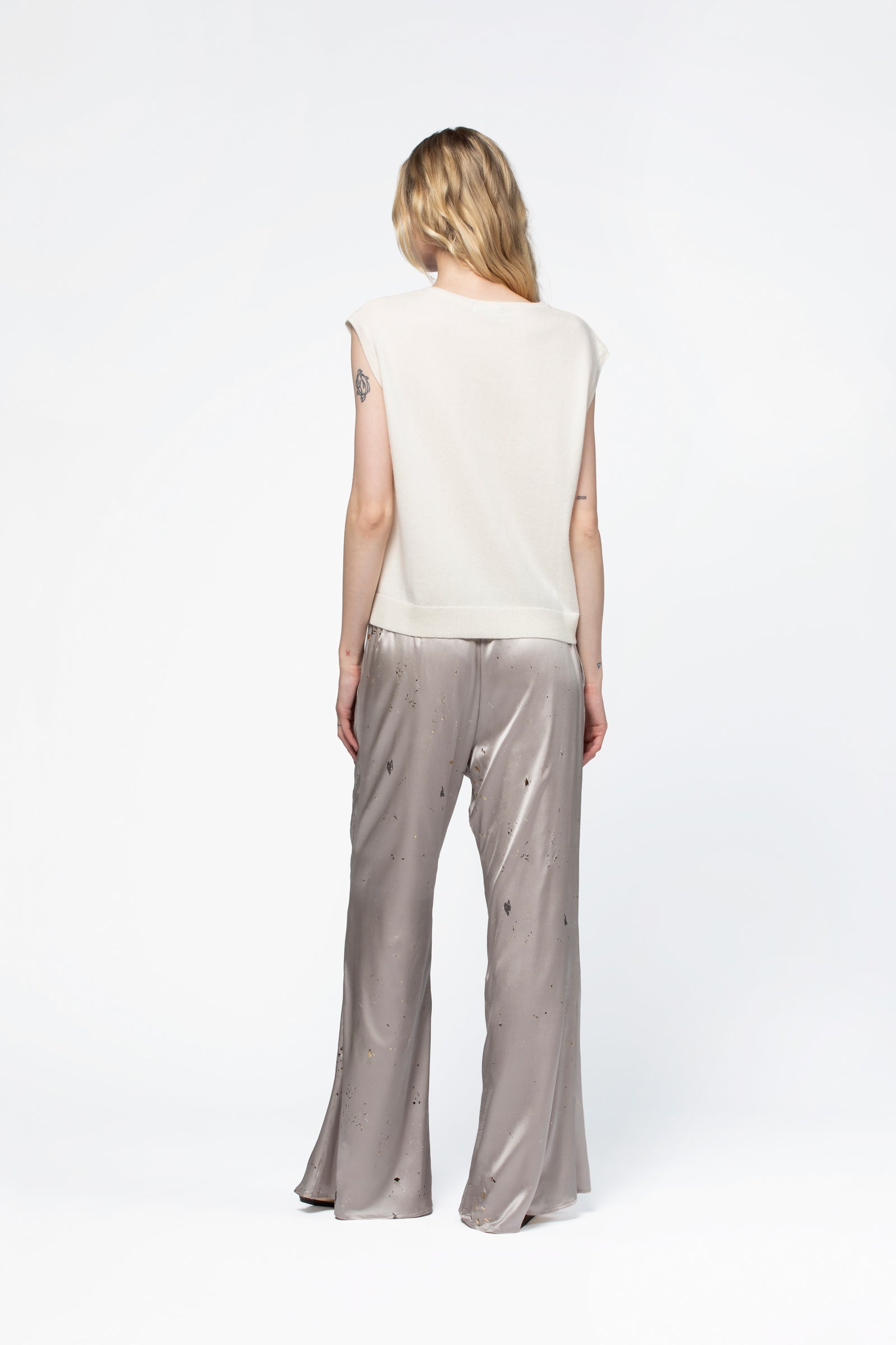 Worn directly against the skin with fluid silk trousers or a silk skirt from the MAX&MOI Spring–Summer 2026 collection, this light wool and cashmere summer knit creates a chic yet relaxed look.