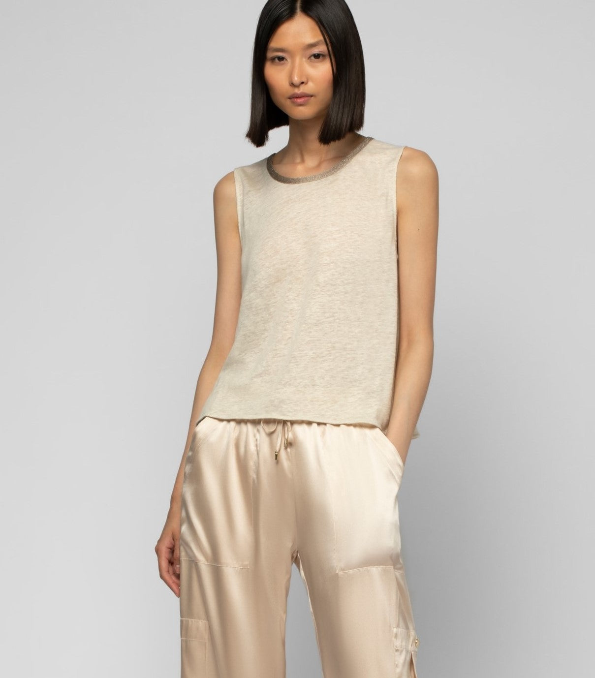 With its refined, minimalist style, MAX&MOI reimagines linen pieces true to its Parisian DNA. Featuring ultra-contemporary silhouettes, each garment is elevated with signature details: an iridescent trim on a round-neck silk top, a blend of linen and silk on a three-quarter sleeve shirt or sleeveless top, or a lace-up neckline on a linen twill T-shirt.