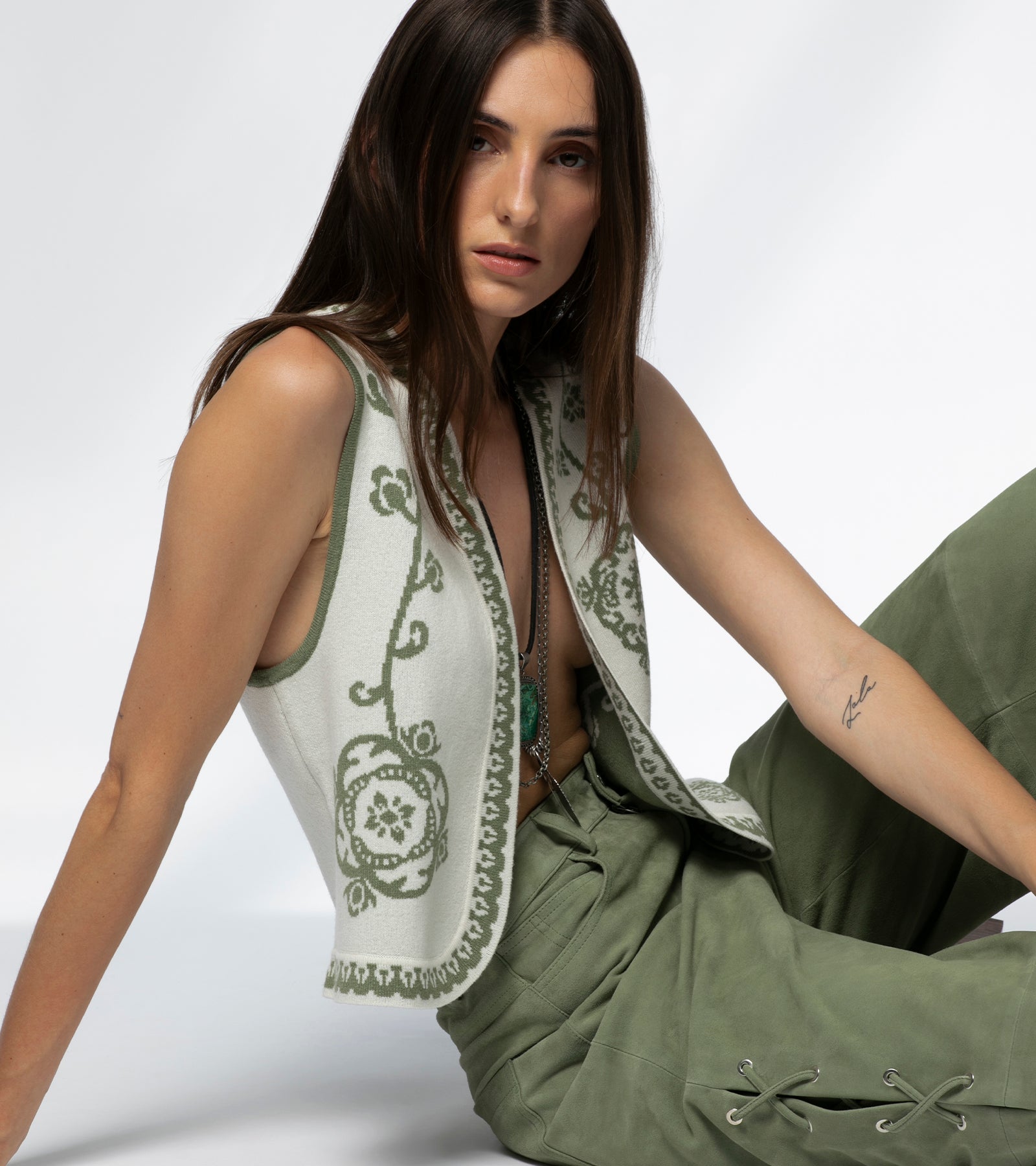 For this Spring-Summer, it reveals thread-embroidered motifs embellished with sequins, intertwined hearts, bandana-print intarsia jacquards and openwork textures as light as they are refined.