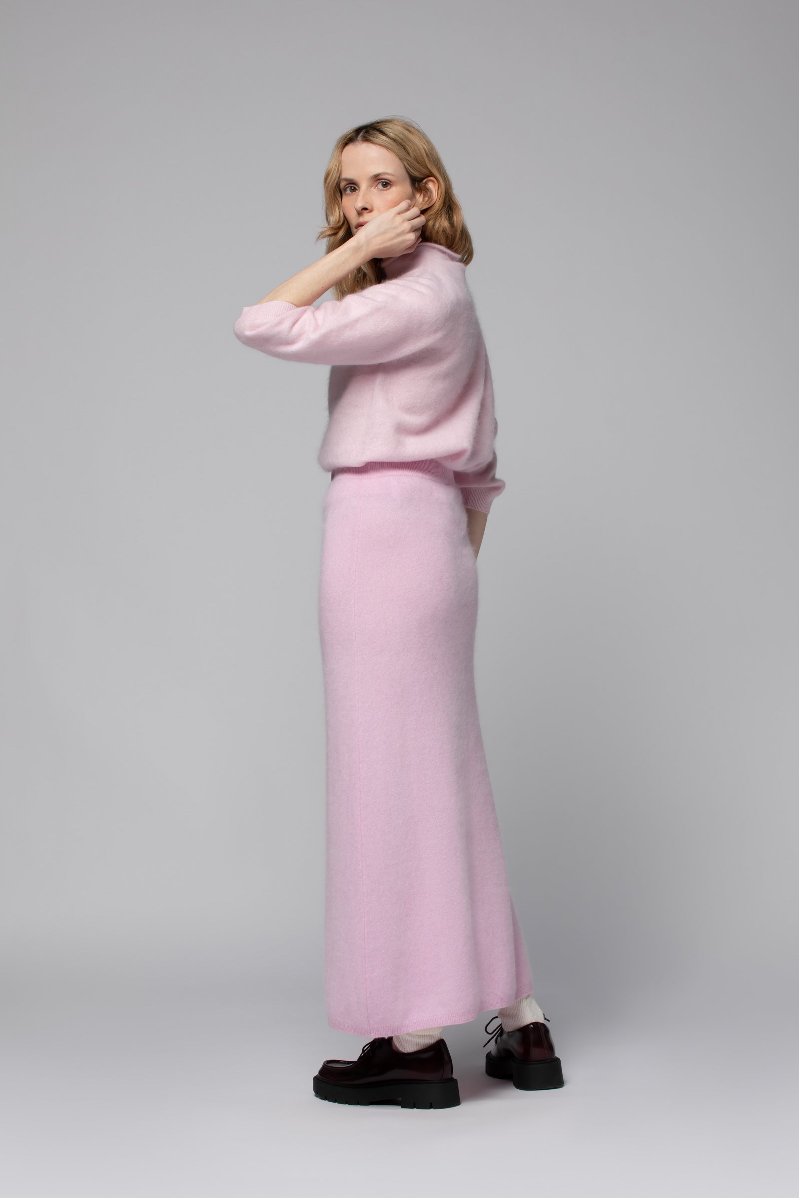 Effortlessly versatile, this long women’s skirt is suited for any occasion. Whether in the city, at the office, or for more dressed-up moments, it instantly elevates the outfit. Pair it with a cashmere sweater from the MAX&MOI collection or with our iconic LEVY silk shirt. For a decidedly couture look, wear it with the matching TWIGGY top and GISELLE cashmere jacket.
