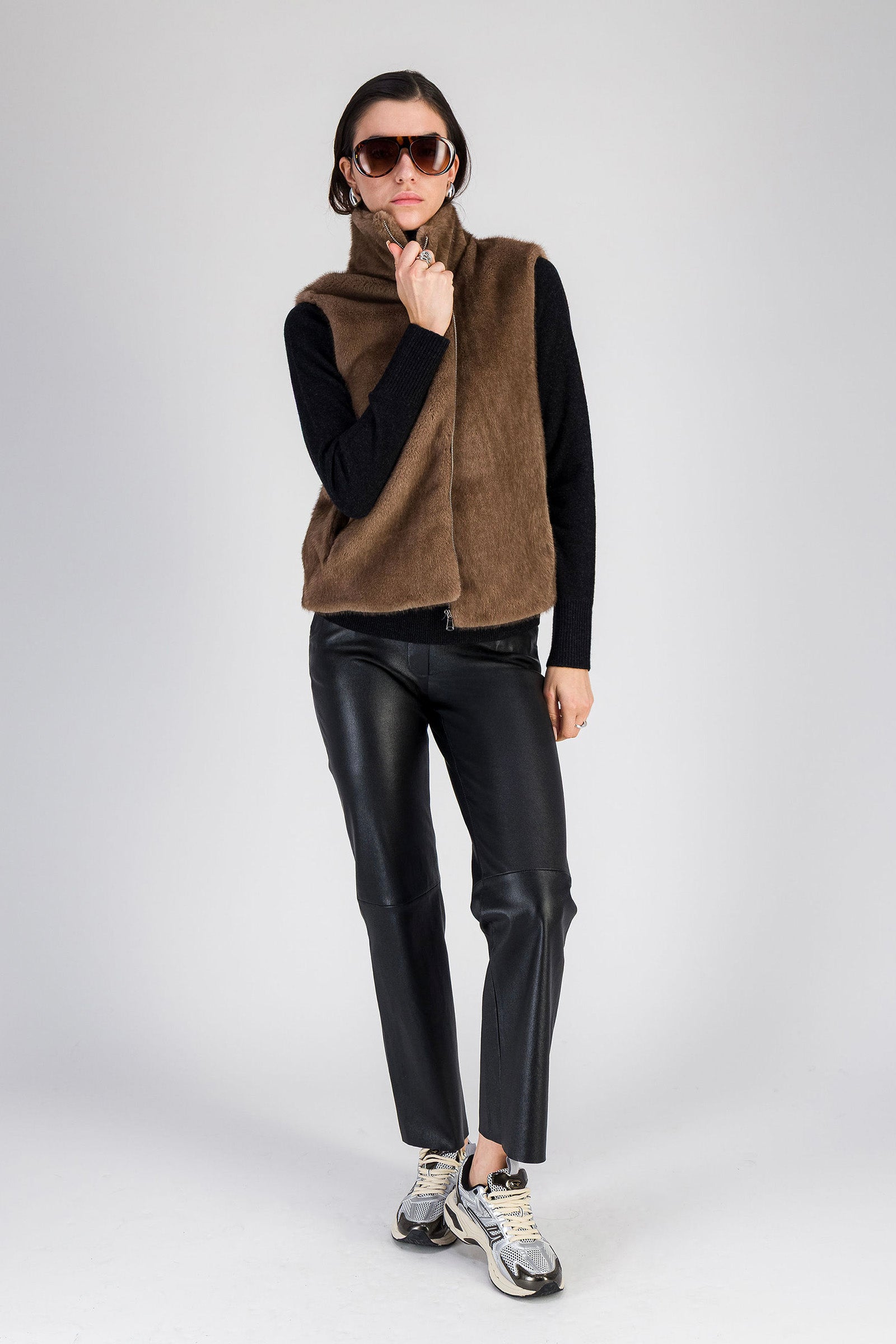 Our GALYA sleeveless jacket brilliantly reinvents sporty-chic style. Featuring a high collar and luxurious mink-effect faux fur that softly warms the silhouette, it is a mid-season essential. Its straight cut gently follows the curves and adapts easily to all body shapes. Feminine with its clean lines, this faux fur jacket strikes the perfect balance between elegance and urban comfort. Practical and stylish, it is equipped with a zip fastening and two front pockets.