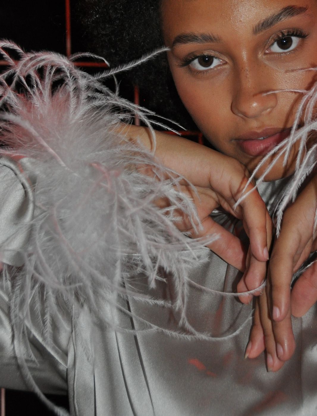 Chic and incredibly comfortable, our stretch lambskin leggings are the embodiment of the House's savoir-faire, suitable for all body shapes and shaping the silhouette. Paired with our sublime TEISSA silk top, it creates a refined, feminine look. Embellished with a removable ostrich feather trim at the cuffs, this sophisticated silk blouse will add a touch of originality to your party outfit.