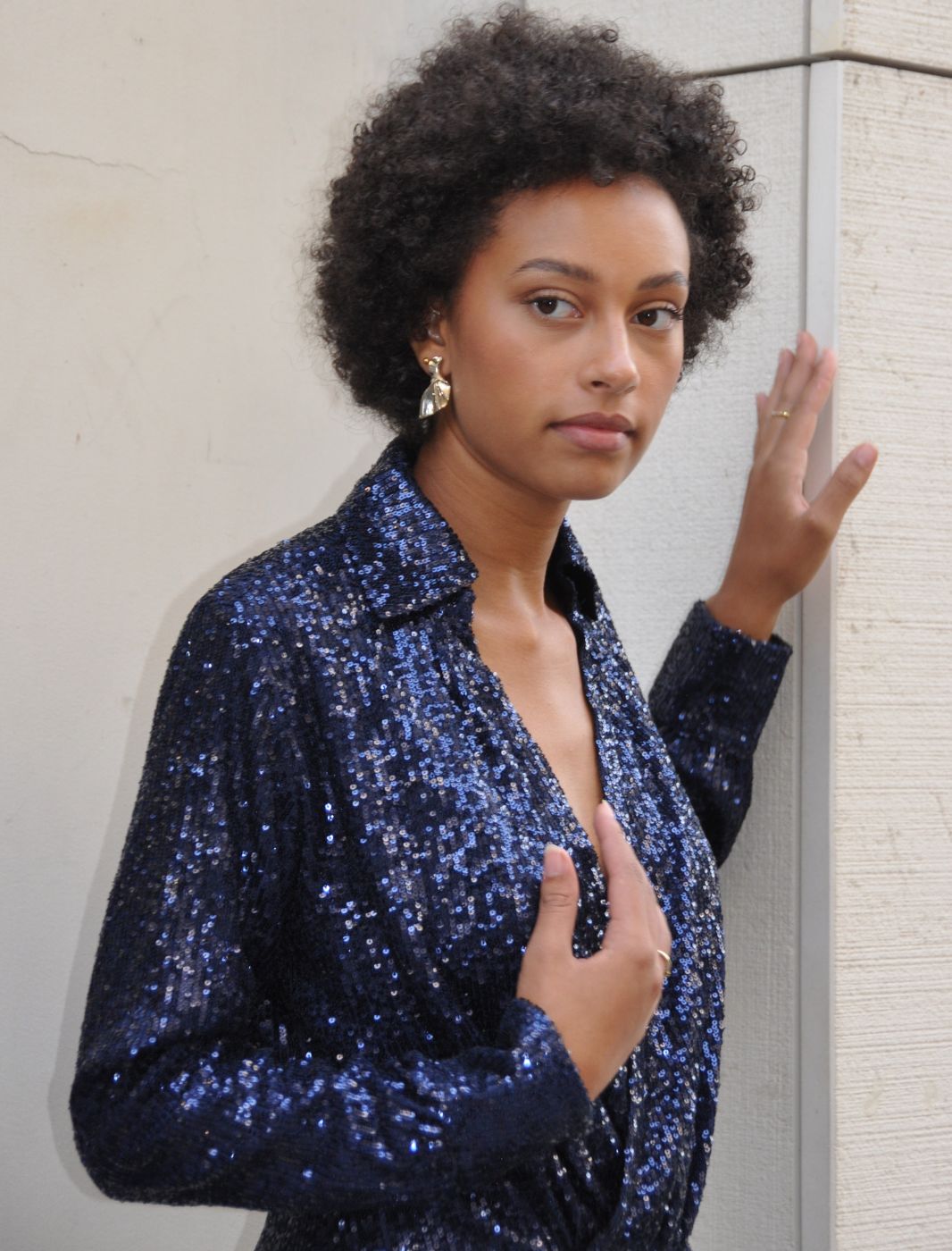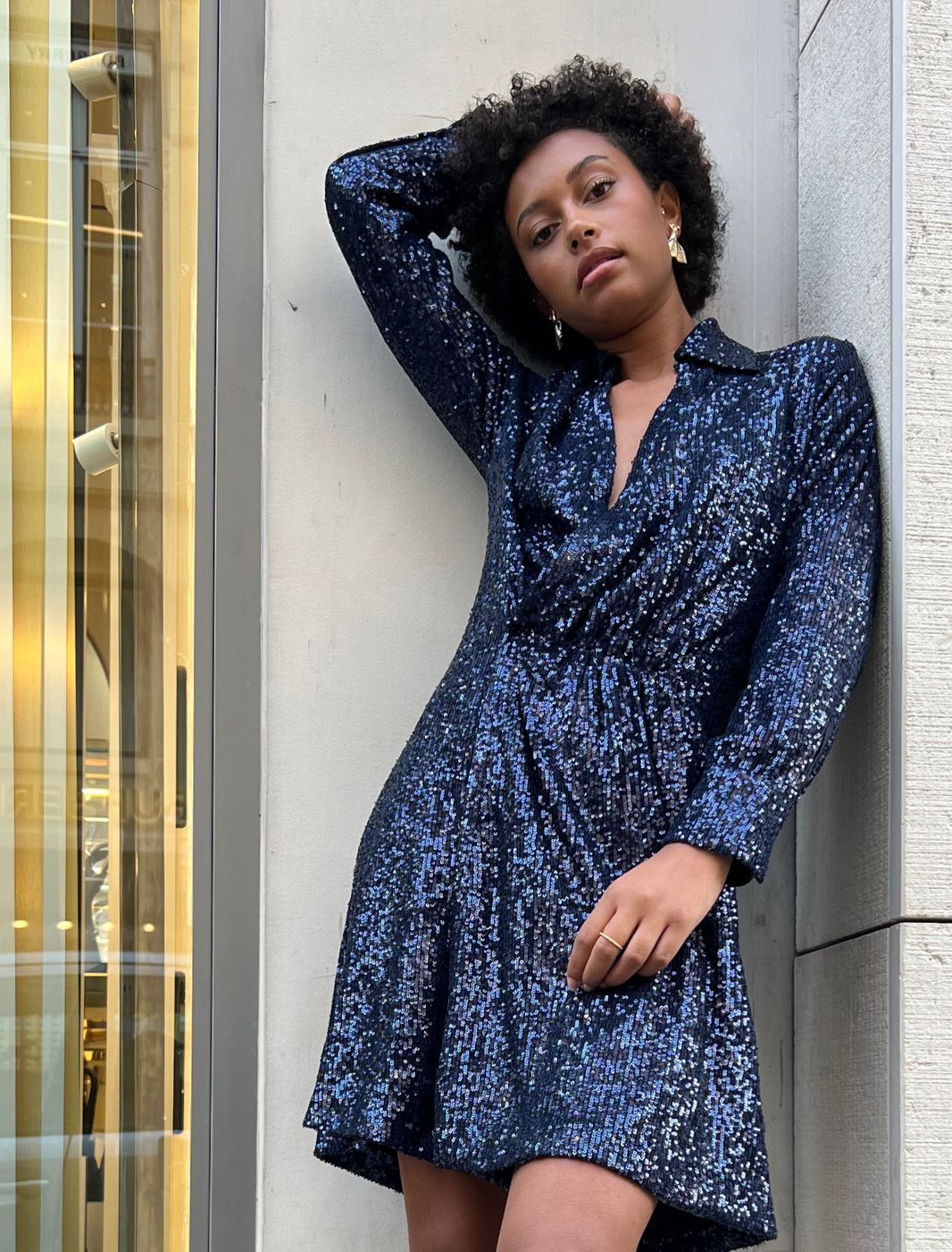 Irresistible for ending the year in style, sequins are a must-have in any party girl's wardrobe. Our ROSEN sequin party dress is perfect for dancing the night away. In a vibrant blue hue, it infuses a note of effortless sophistication and glamour. Its captivating sparkle illuminates the dance floor, creating a festive aura that's sure to cause a sensation.