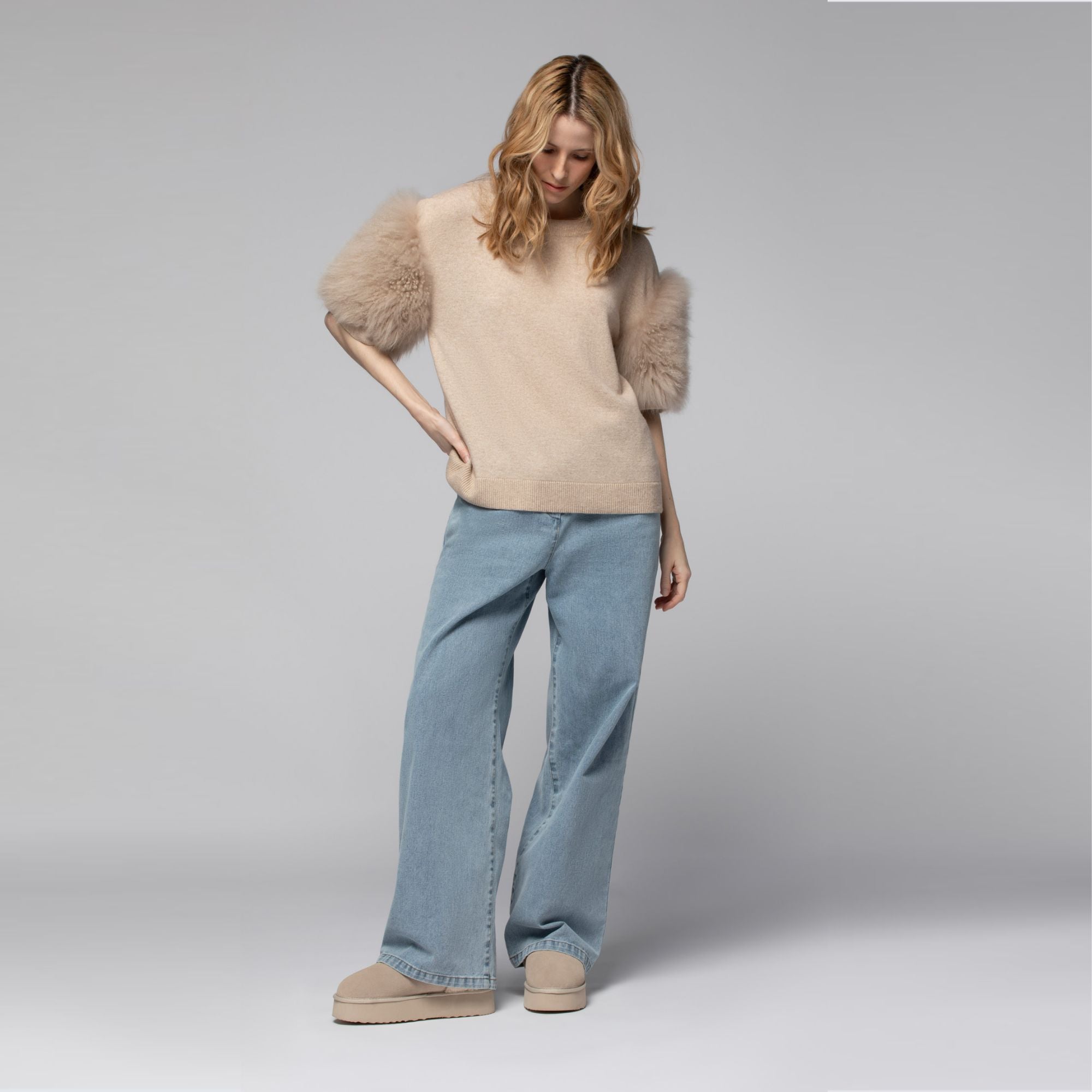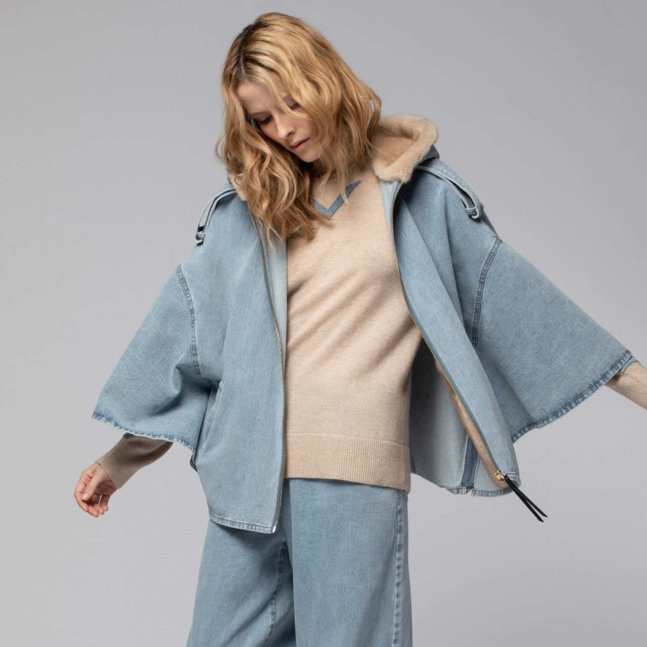 MAX&MOI enhances these fluffy and enveloping textures through creations with a strong character: ponchos, puffer jackets and jackets with oversized volumes in which the silhouette is totally nestled, delicate touches on long vests or cashmere sweaters adorned with cuffs or collars in fake fur FUREVER more or less dense, or even couture details on a revisited aviator jacket.