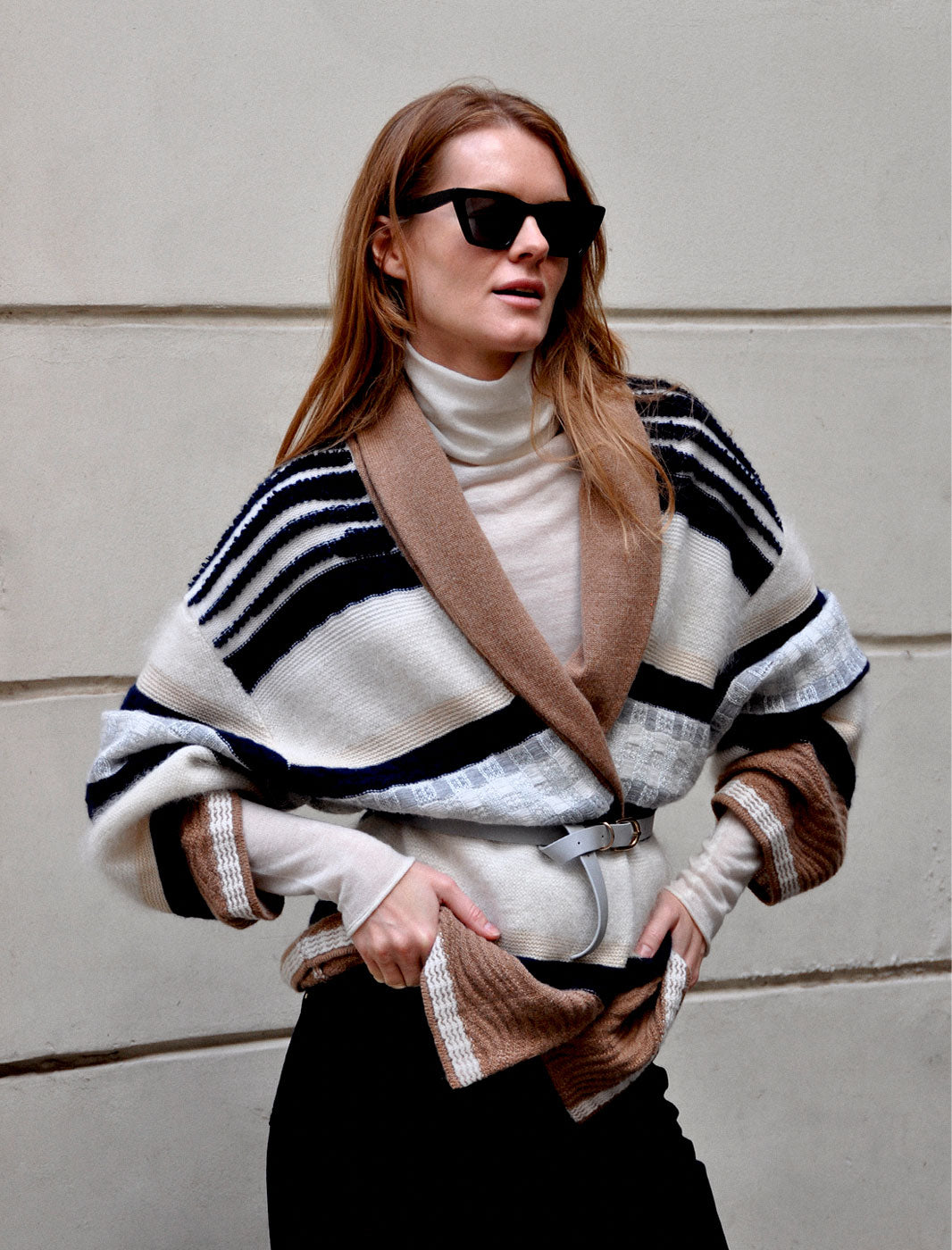 Magnificent in a cashmere and wool poncho with a protective aura, she sets off to conquer the city, with a determined gait and her eyes fixed on the horizon.