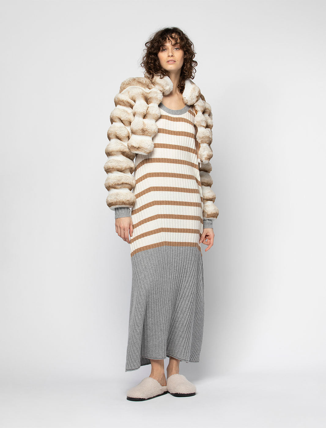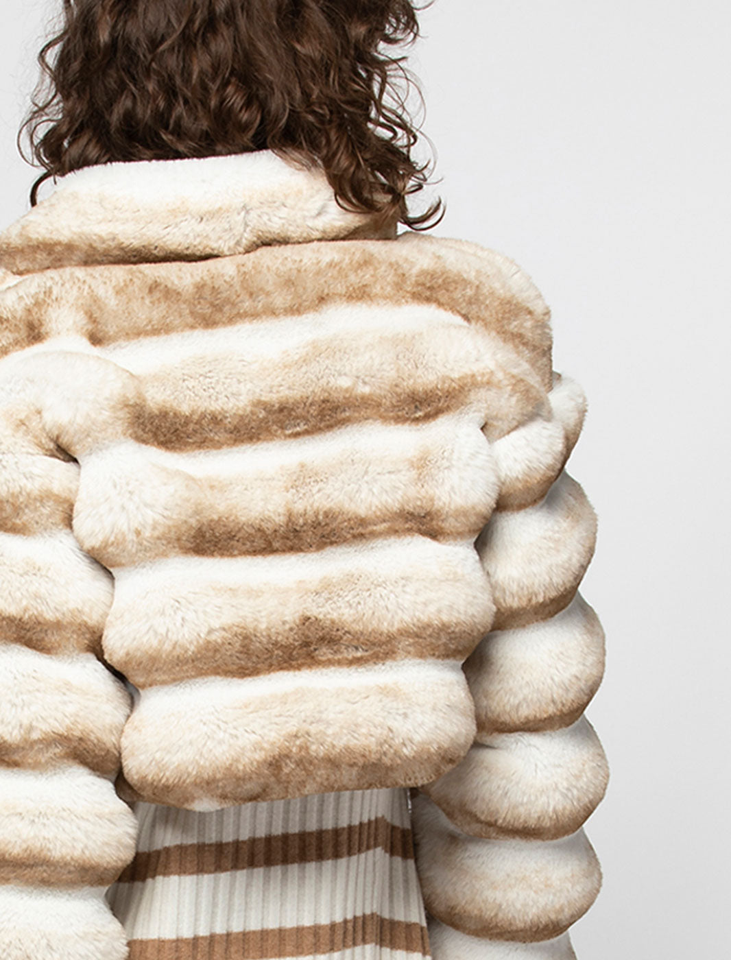 The right look? Our RUTH dress in cashmere and wool, paired with a strong piece like our MANEL short jacket in faux fur with long sleeves. Made in Furever, this warm, fluffy fur-effect jacket is a cocoon of softness that can be worn day or night.