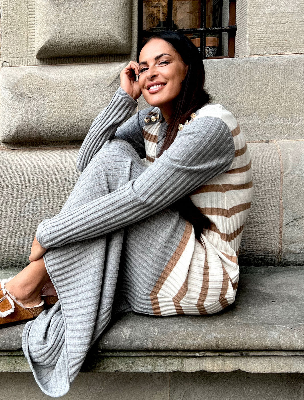 Here, she plays up the mix and match by combining several pieces from our creative knitwear capsule. Our BASILIA trousers in impeccably cut corduroy, paired with an essential winter cashmere jumper for warmth and style, enhanced by our GINA cardigan in the same colour palette.