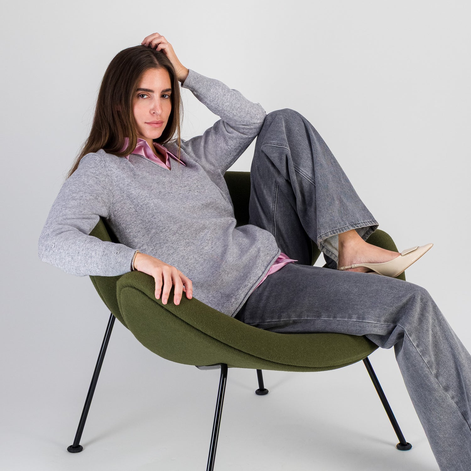 Signature material of the Maison, cashmere embodies the softness and timeless elegance of winter. Available in different shades of grey — in sweaters, cardigans, trousers, or skirts — it wraps the silhouette in refined comfort. Whether with a crew neck, V-neck, turtleneck, or zip, in twisted jacquard knit or brushed cashmere, the grey cashmere sweater remains a key piece of the wardrobe. Paired with a cashmere skirt, leather leggings, or silk tailored trousers, it creates modern and sensual silhouettes. Worn with wool and cashmere trousers, it takes on a decidedly cocooning look.