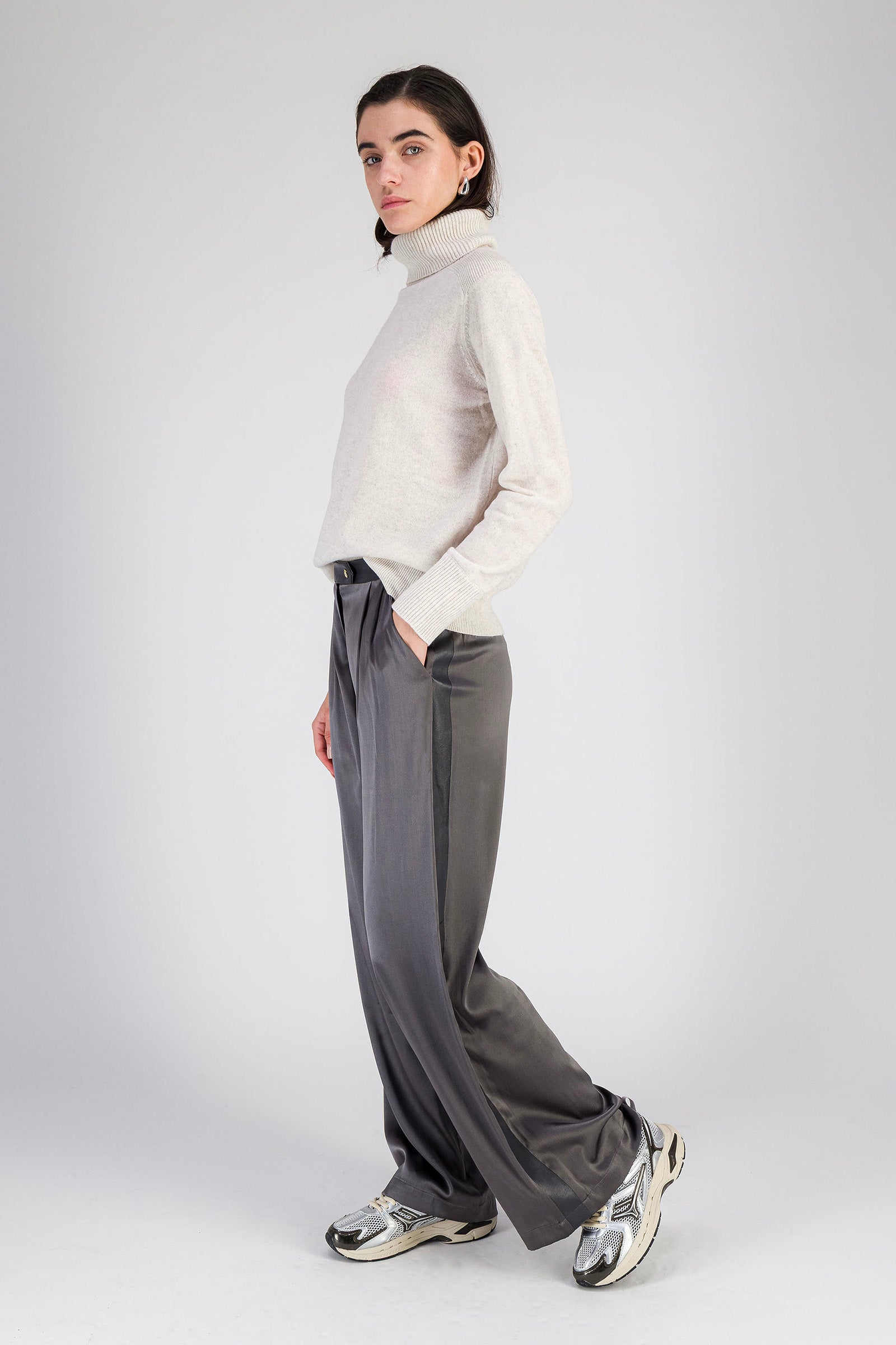 Grey stretch silk softens outfits and naturally pairs with the Maison’s other signature materials—cashmere, knitwear, and leather—in a subtle and harmonious play of contrasts. Elegant by day as by night, it accompanies every moment: a meeting at the office, a cocktail at 7 p.m., a gala evening, or a brunch the next day.