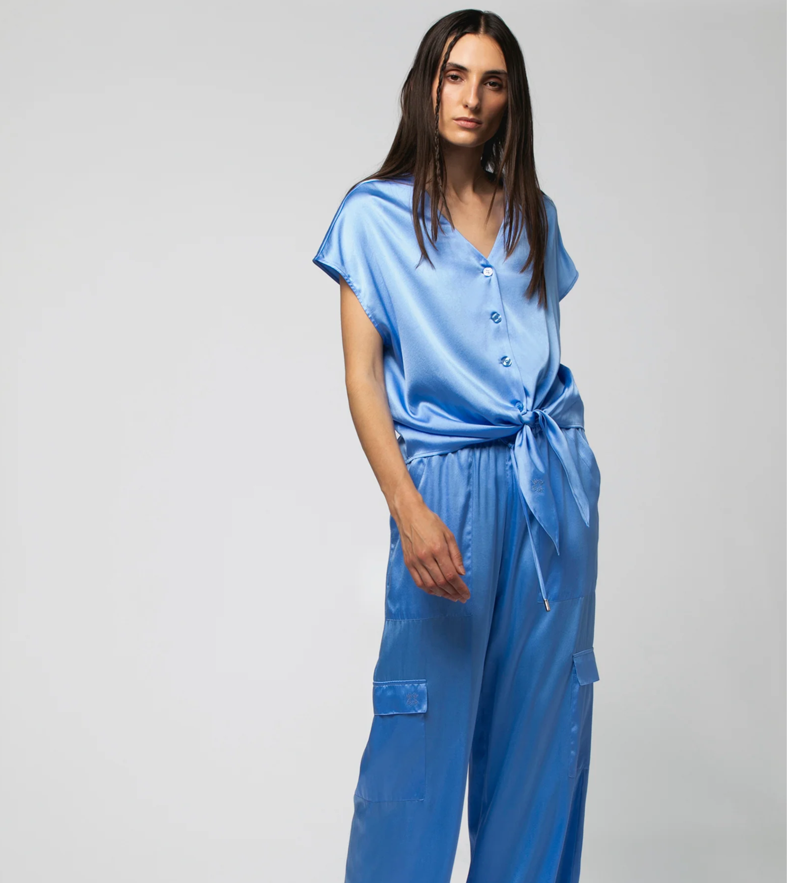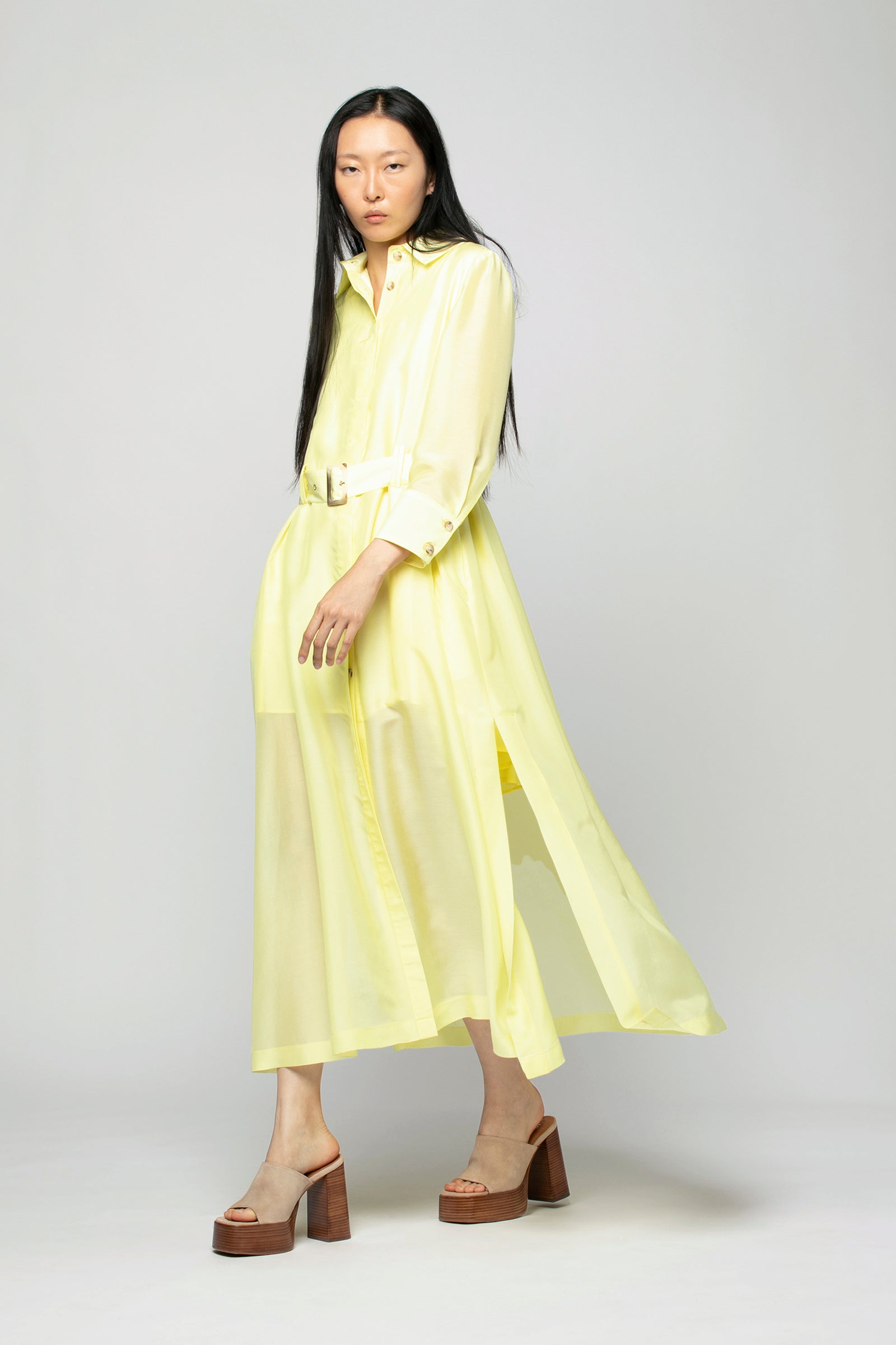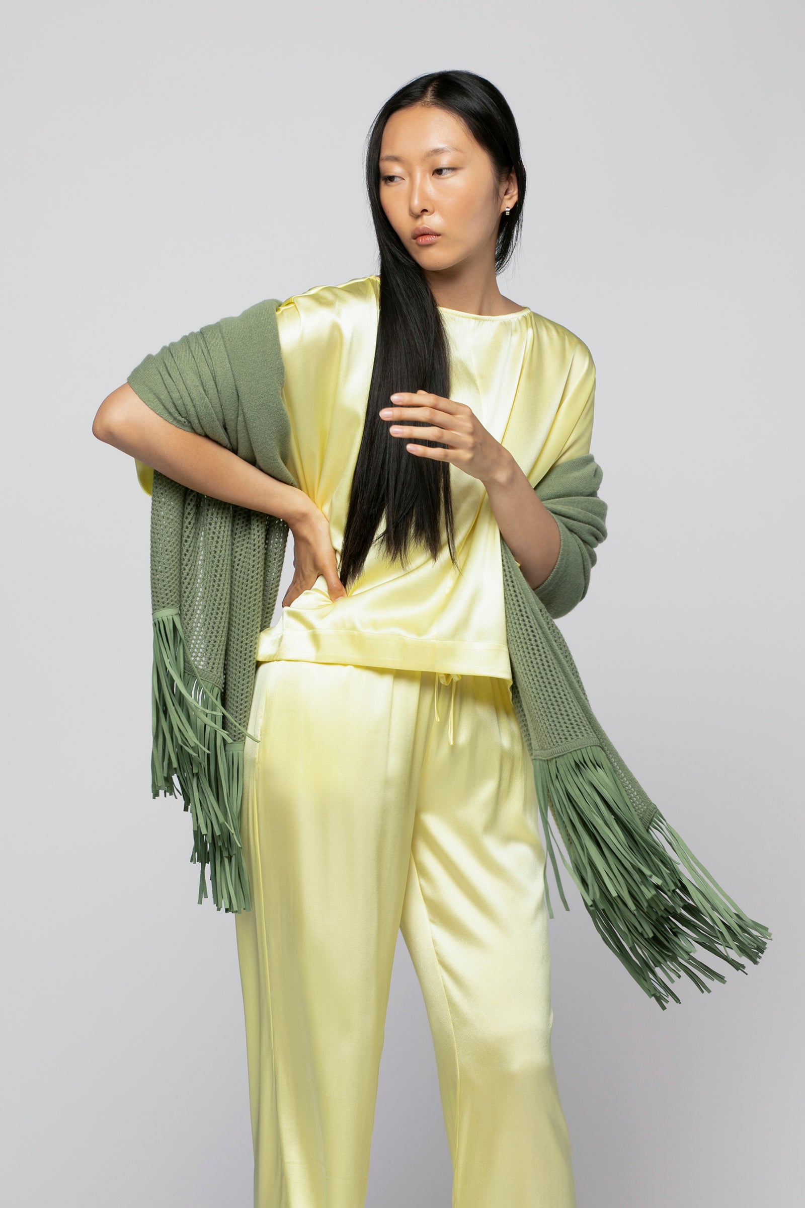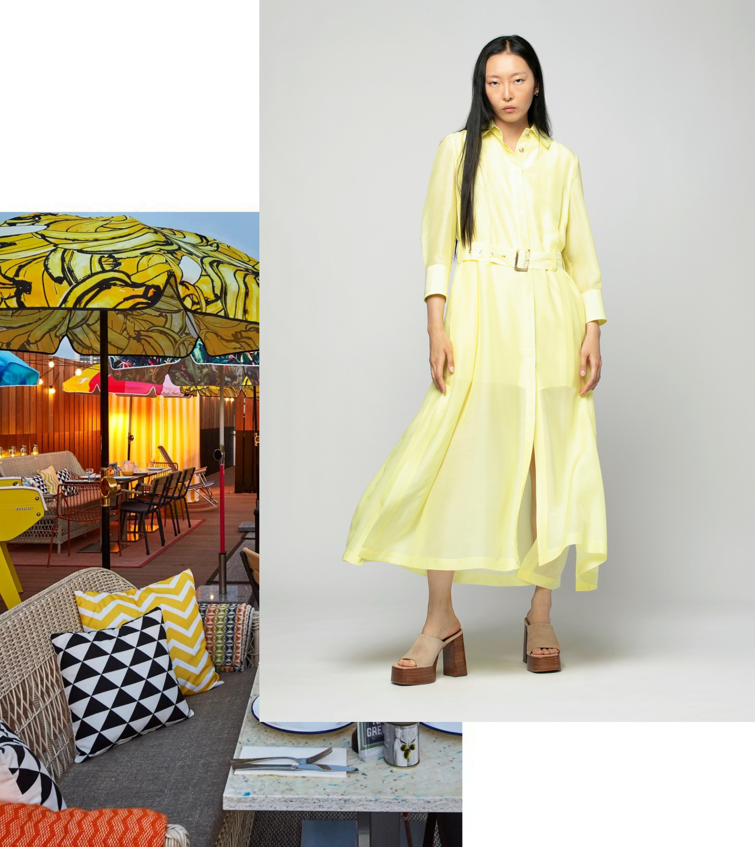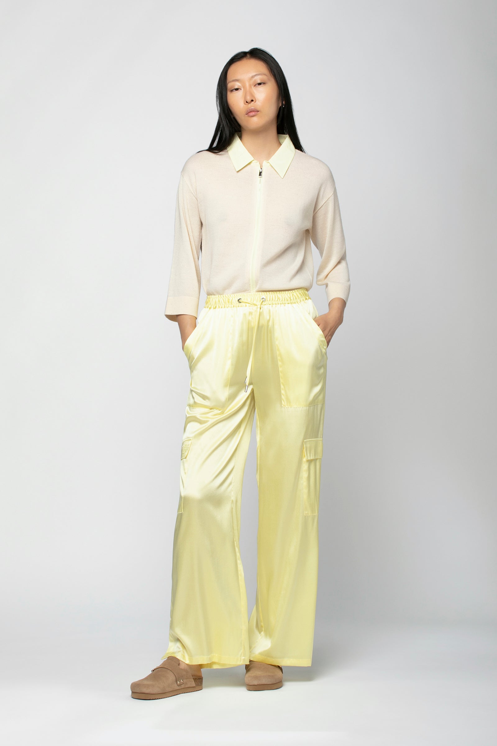 Revisited cargo pants and flowing couture silk maxi dresses in lemonade yellow create feminine, sunny and resolutely modern silhouettes.