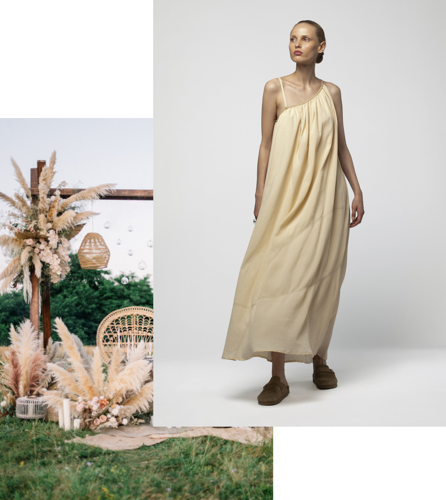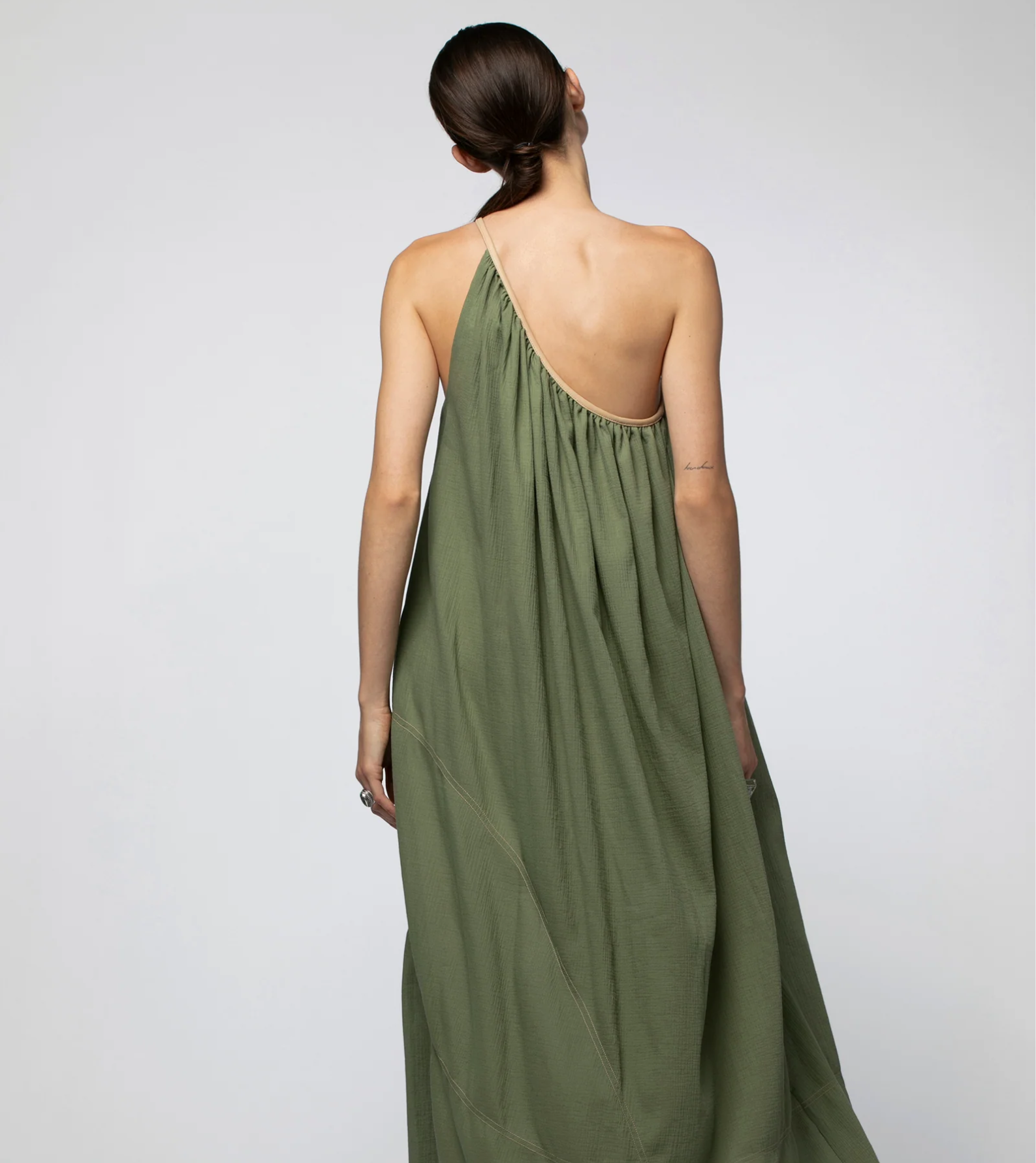 Our RAMIZA dress evokes gentle femininity, tinged with romance. Its natural drape and bare shoulder add a touch of sophistication, while its almond or dune green hue envelops the silhouette in a natural aura.