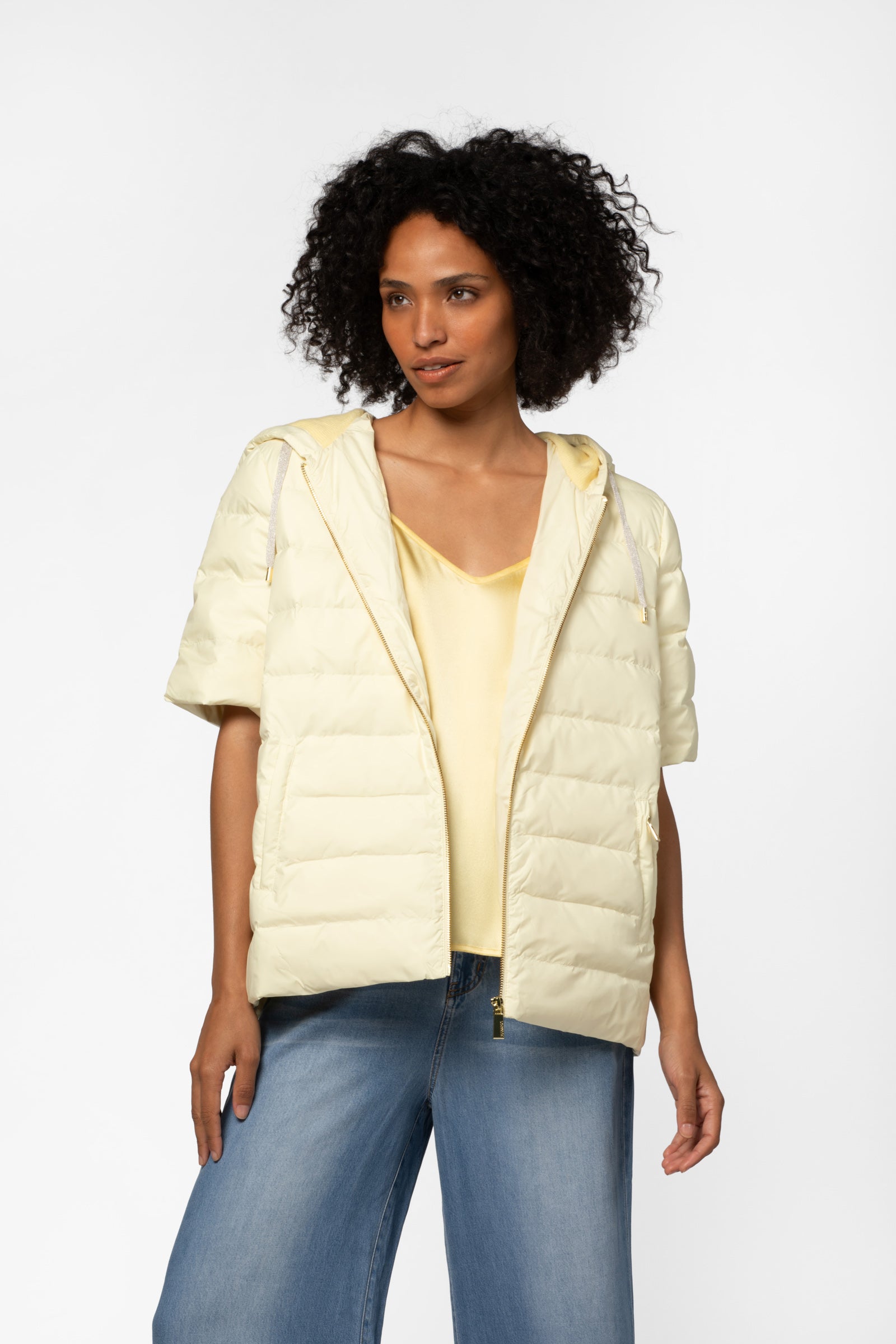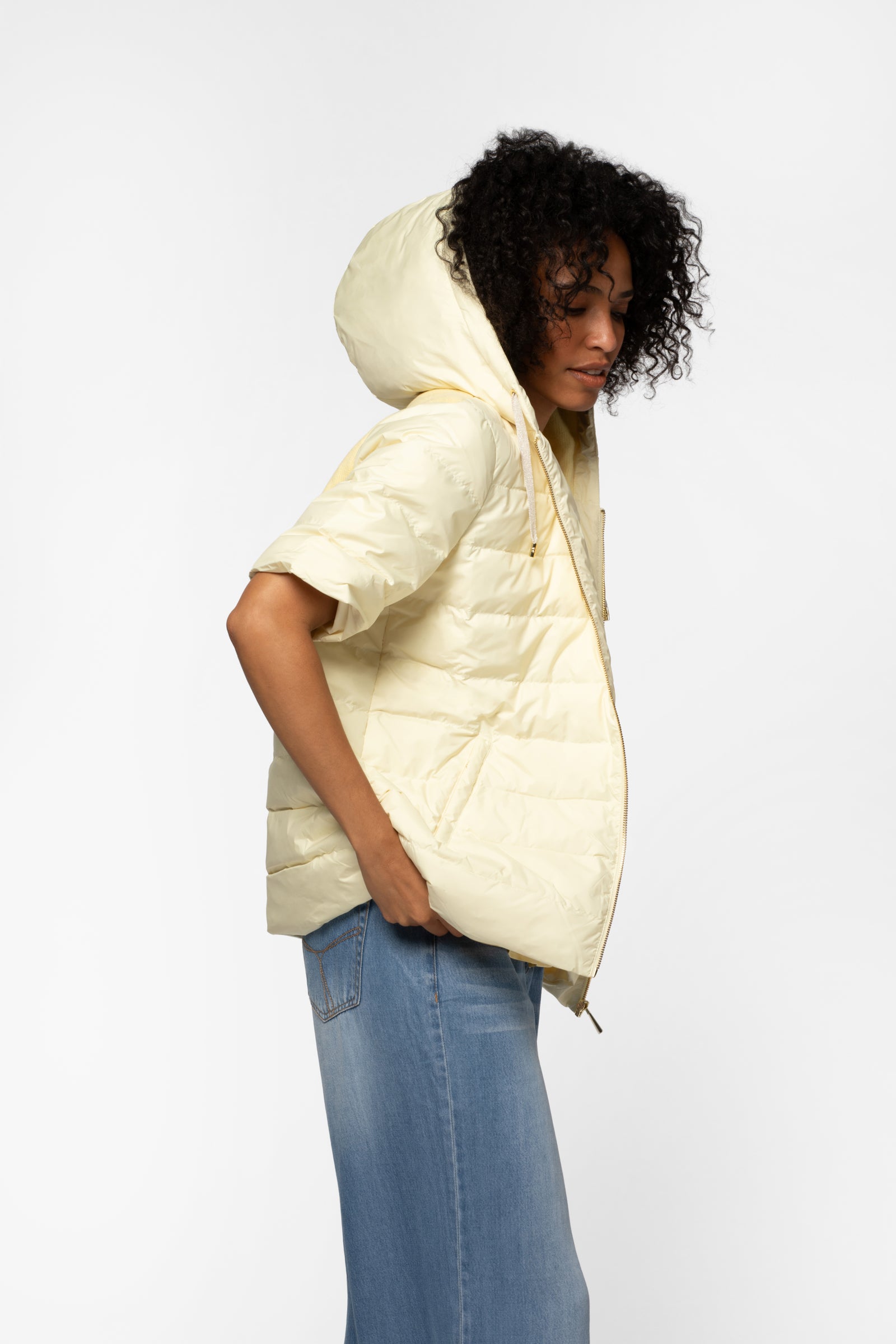 Short-sleeve nylon puffer jacket with knit panel