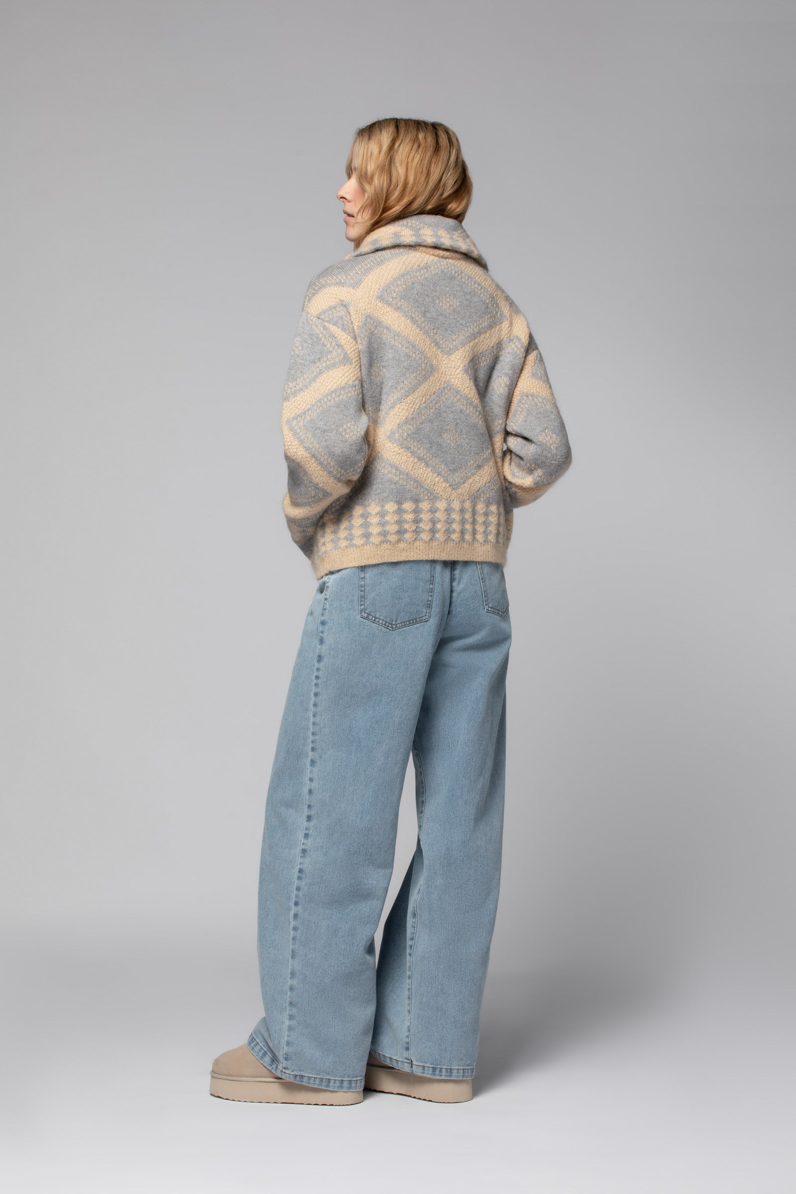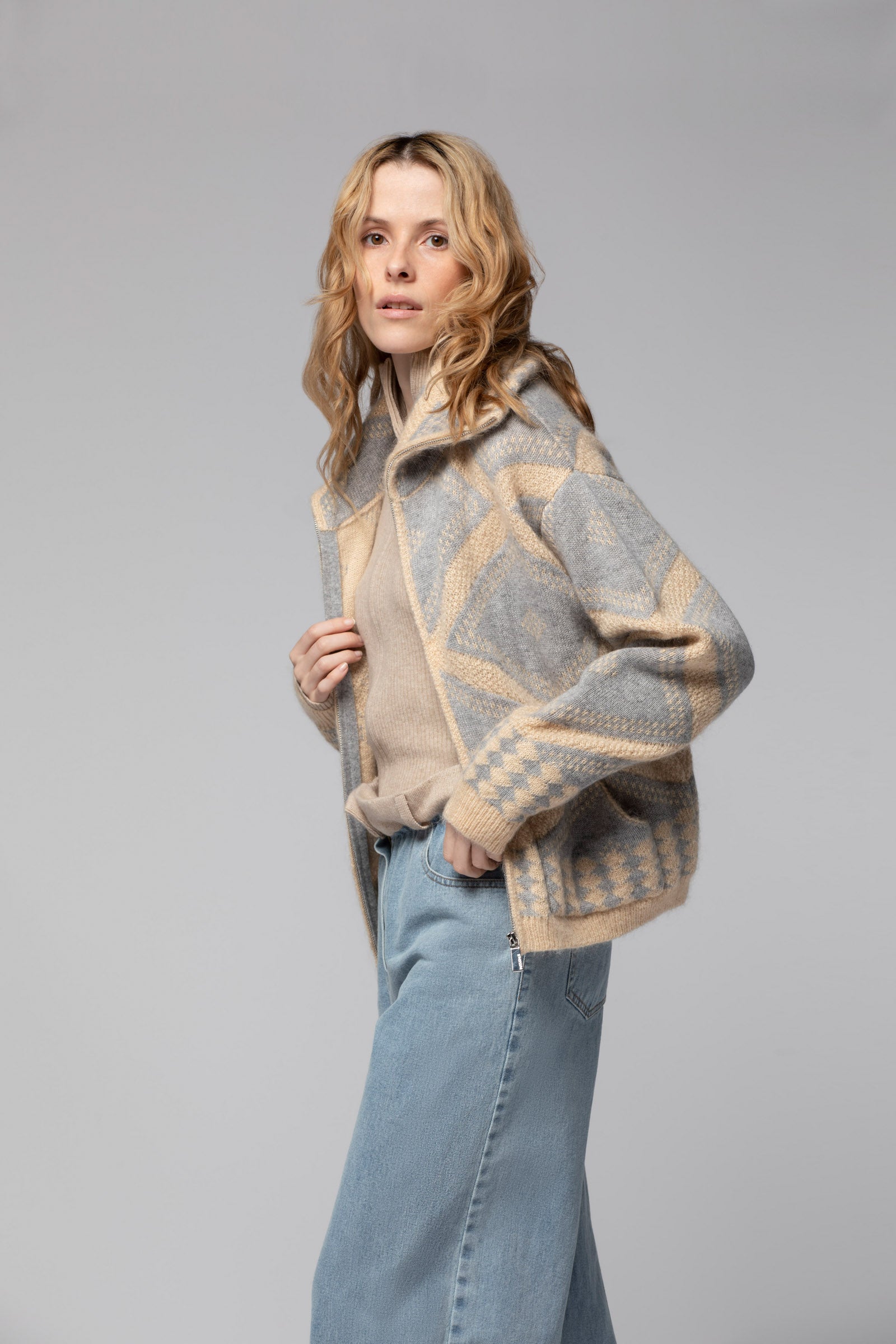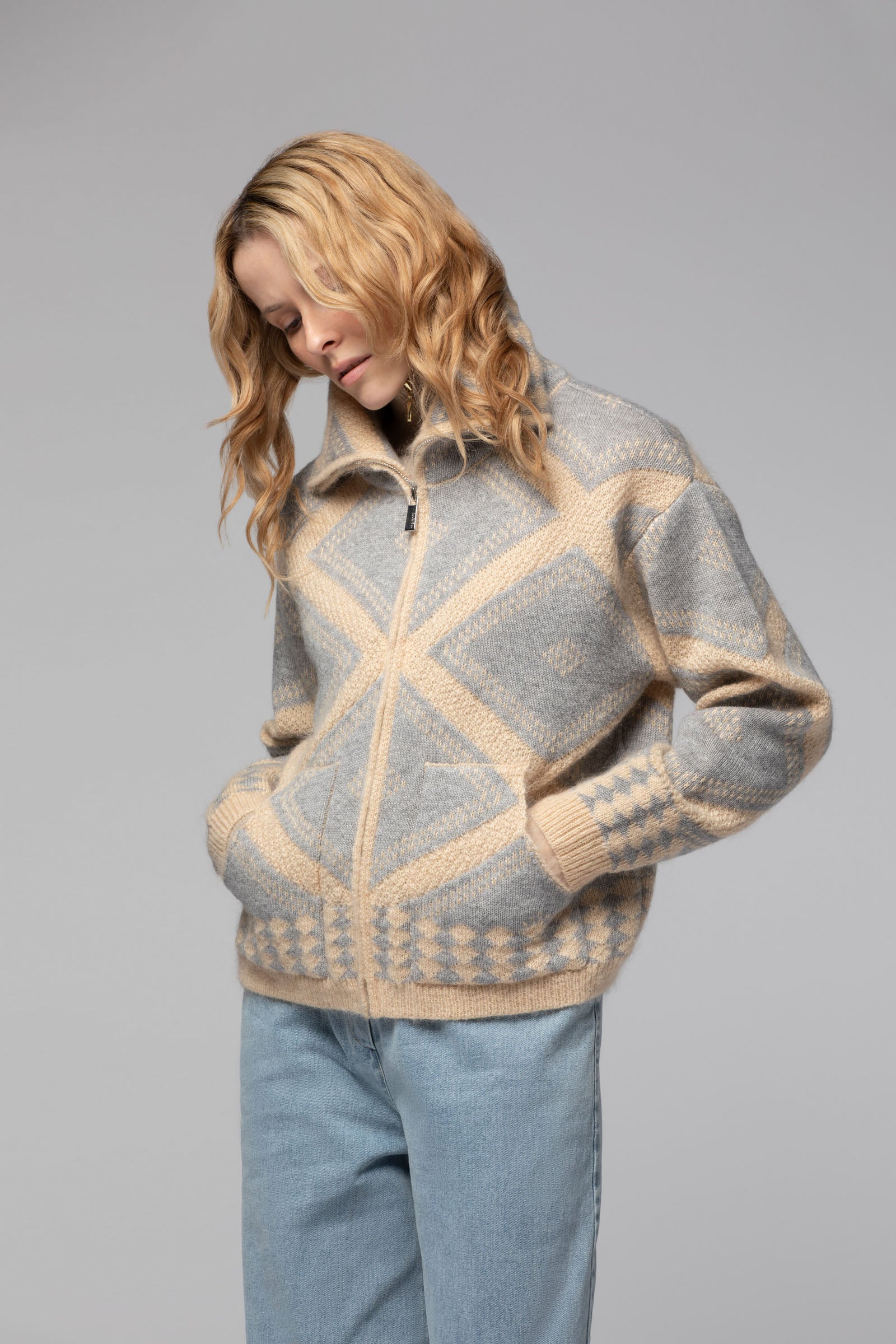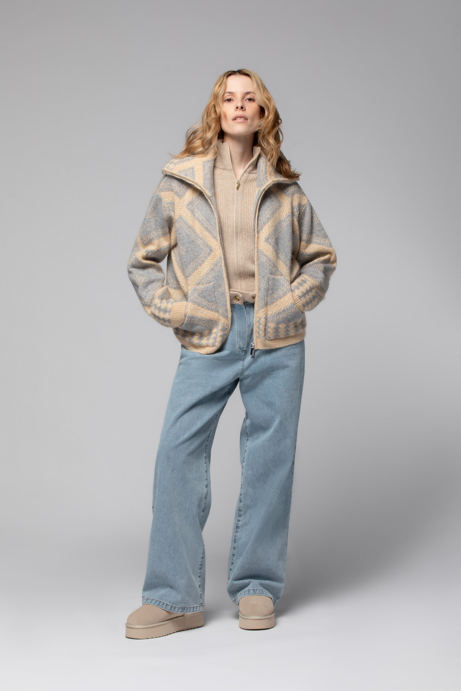 With its contrasting jacquard and bold graphic diamond motifs, our GLORY cardigan stands out as a signature piece of the season. Made from an ultra-soft wool and cashmere blend, it features a generous knit that wraps the body in comforting warmth. Dropped shoulders, a high collar, a zip fastening, and front patch pockets lend it a relaxed elegance, while subtle lurex threads add a touch of sparkle and a feminine finish.