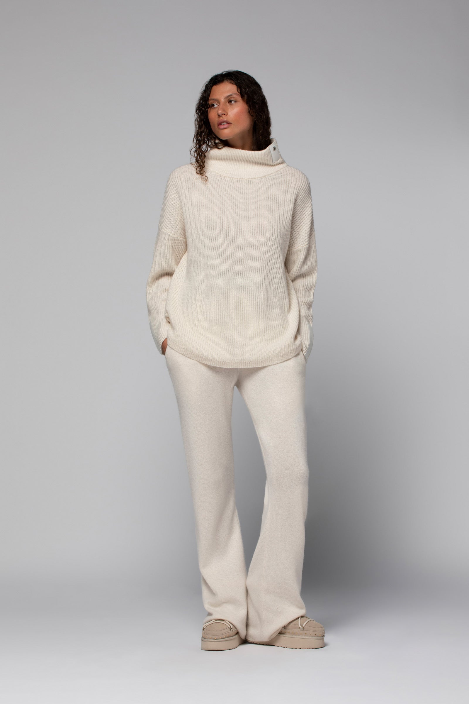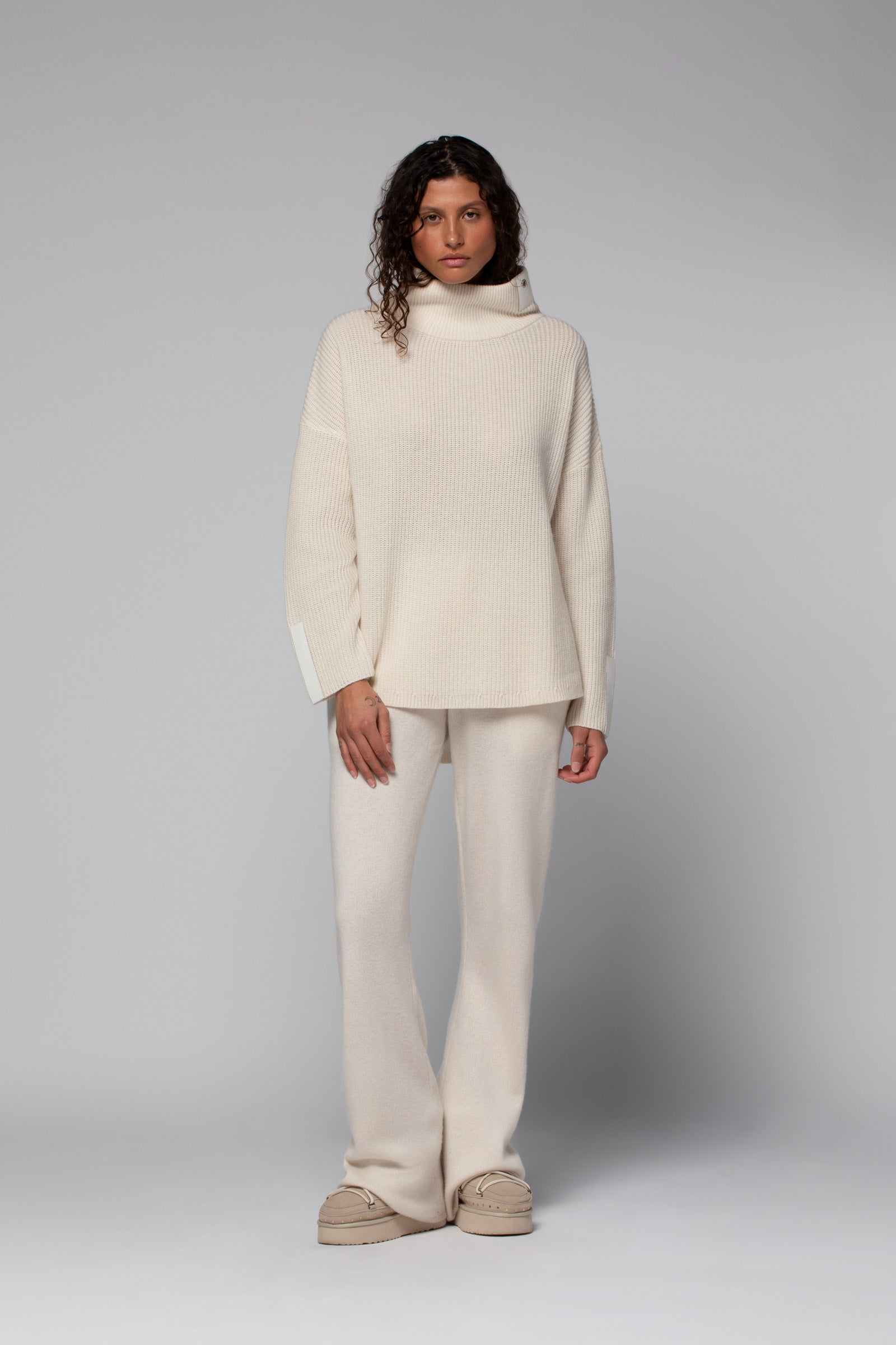 Our PERLE sweater stands out as a timeless staple in any woman’s wardrobe. Crafted from a luxurious wool and cashmere blend, it charms with its relaxed elegance, featuring a loose fit and dropped shoulders. The English rib knit brings a soft, feminine touch to its lines, while the turtleneck, enhanced with a leather tab and a MAX\&MOI-engraved eyelet, adds character and refined detail. At the cuffs, long leather accents extend the sleeves with subtle graphic flair.