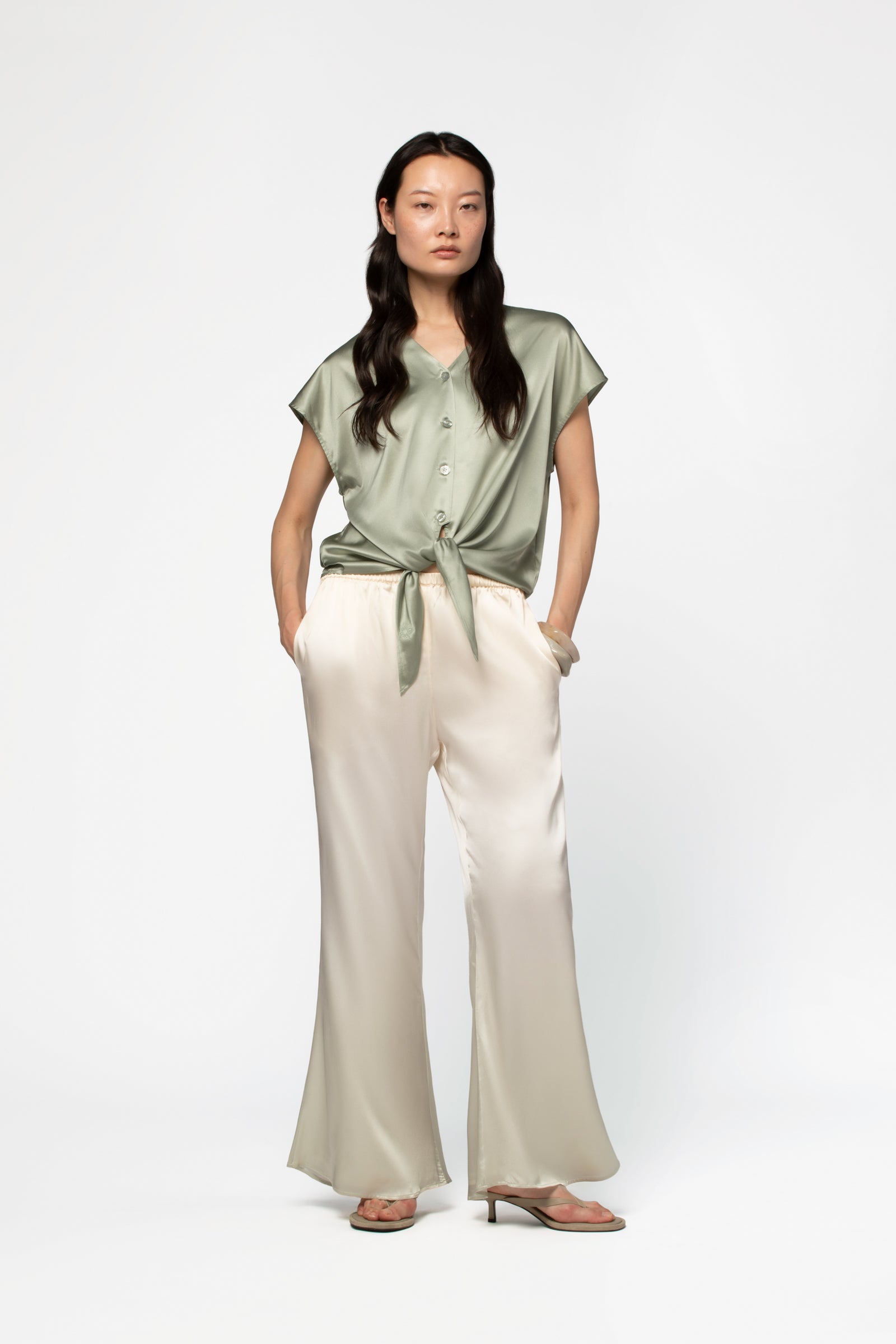 Flowing stretch silk blouse with tie panels