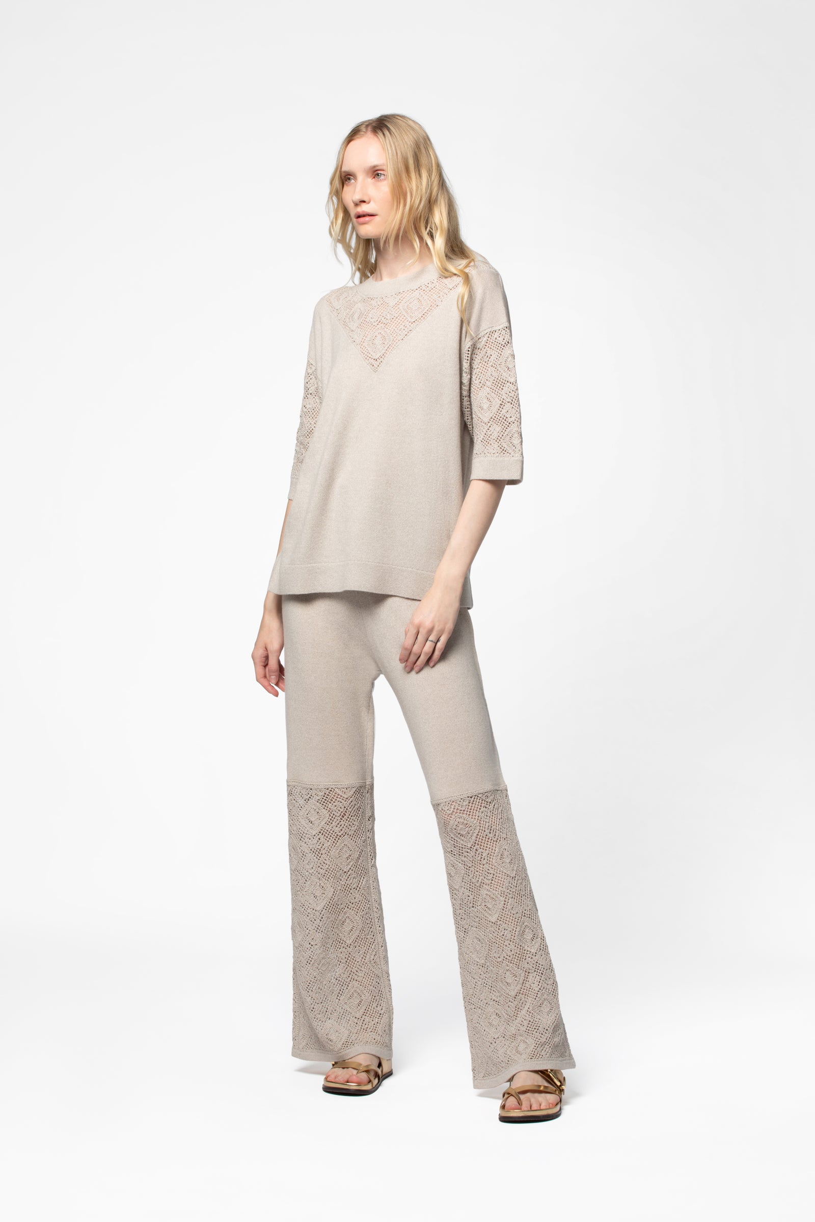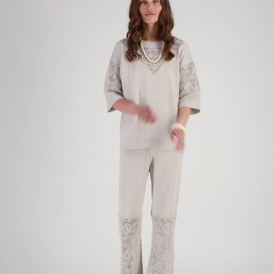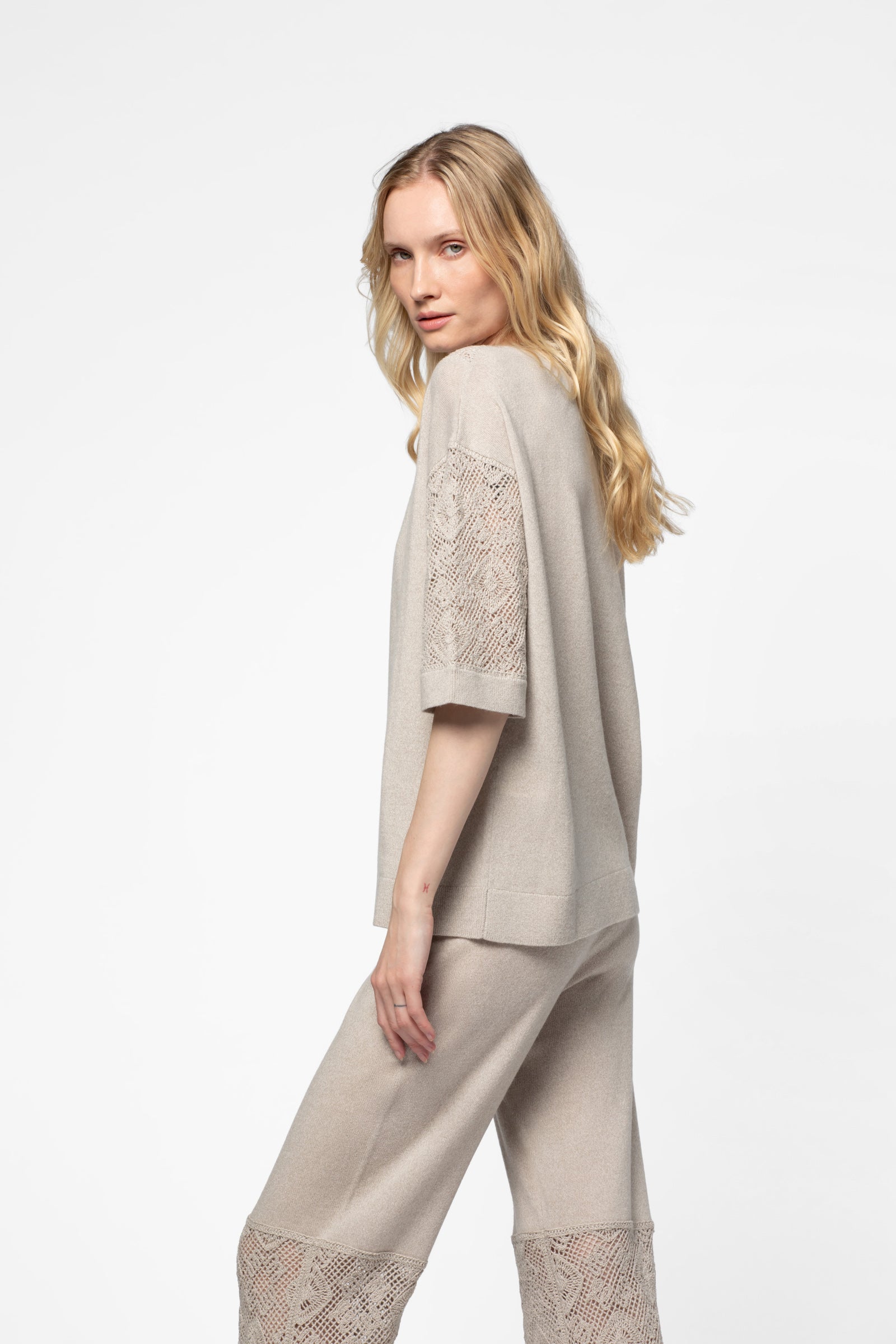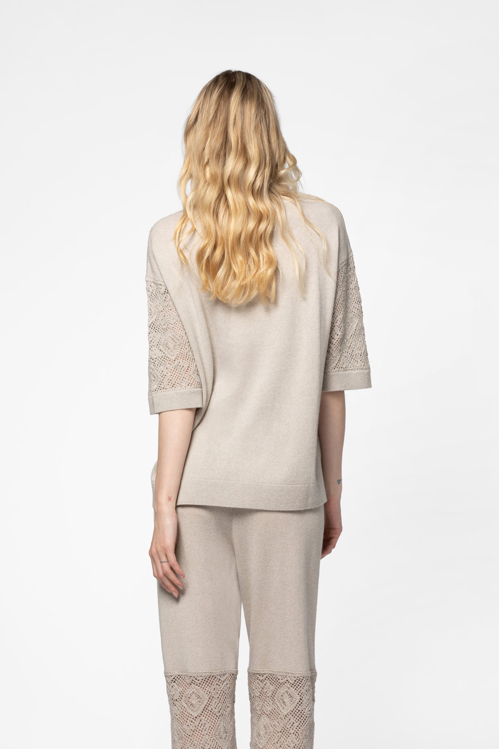 - Crochet-effect knit at the neckline and sleeves