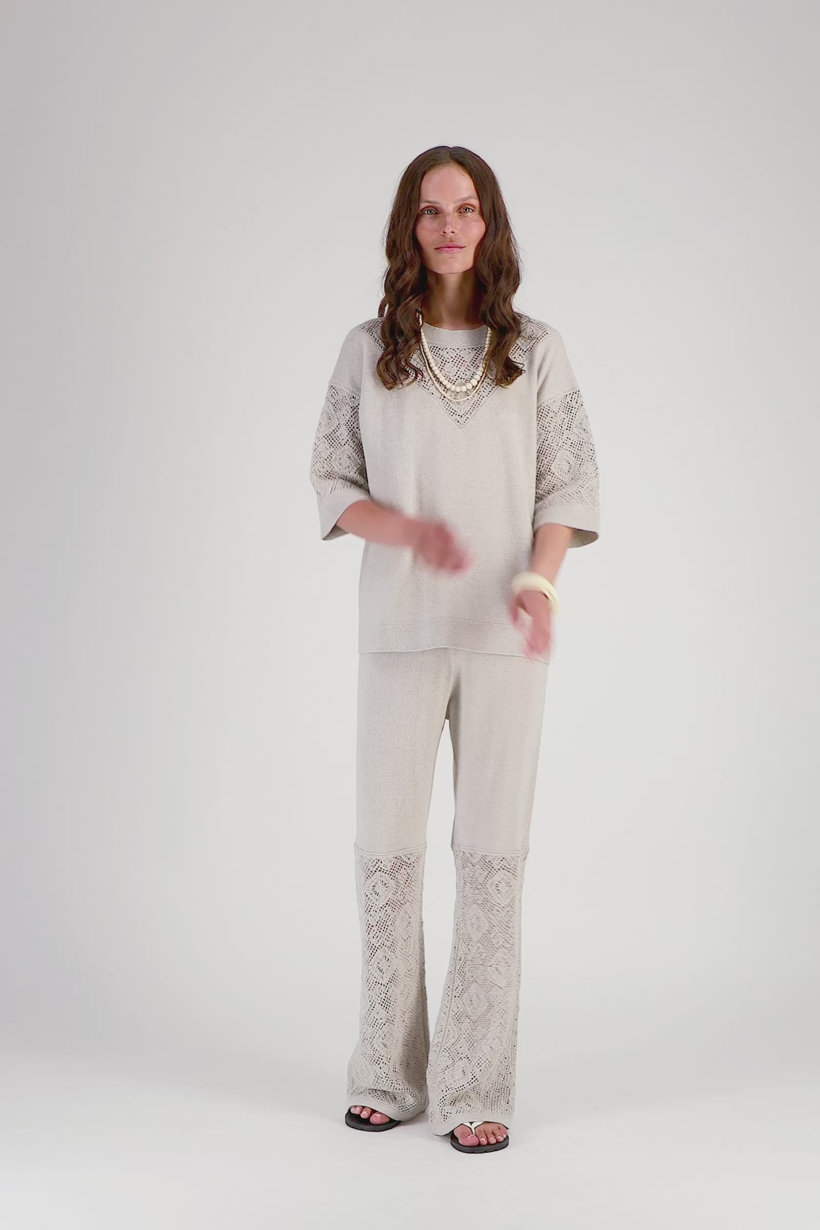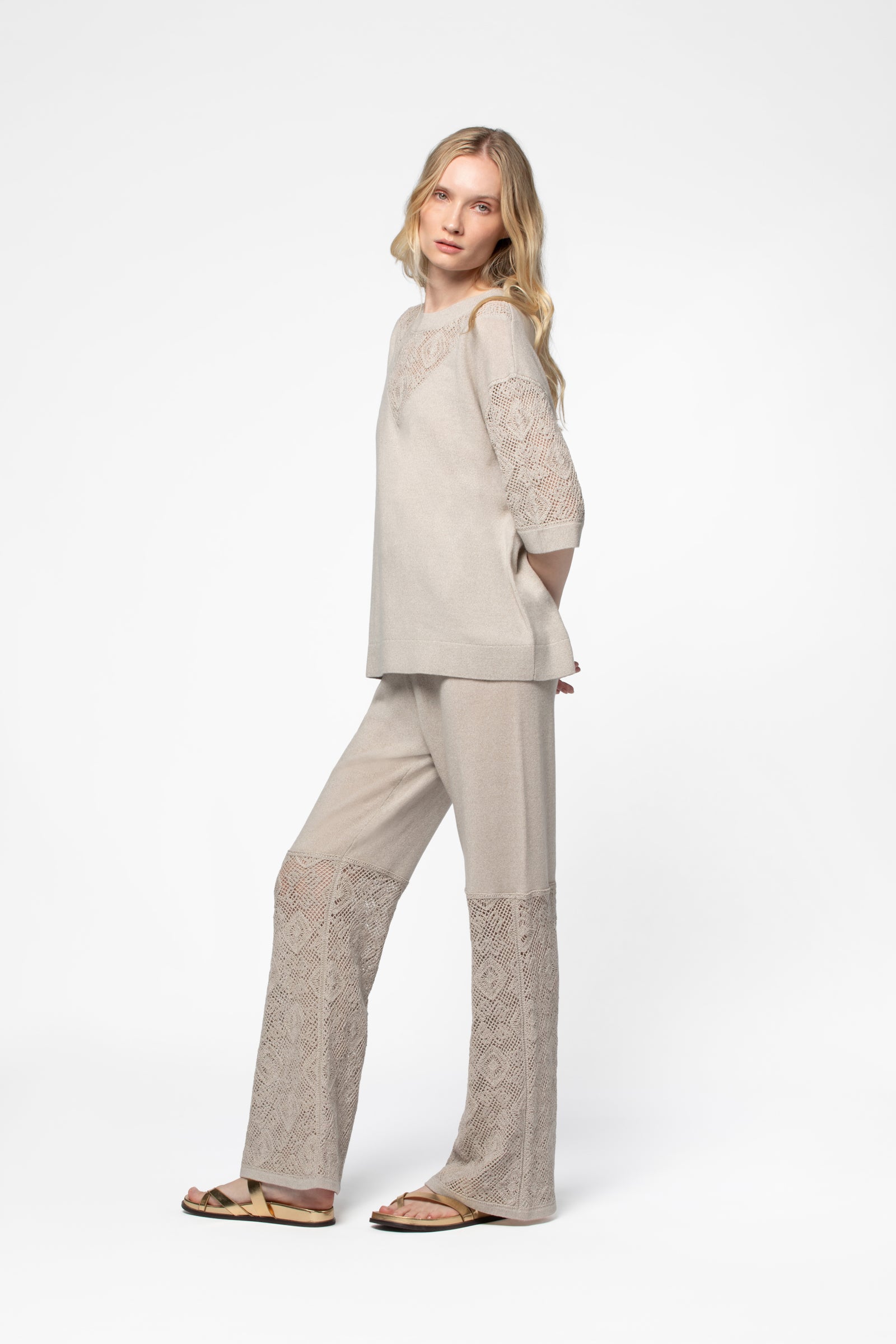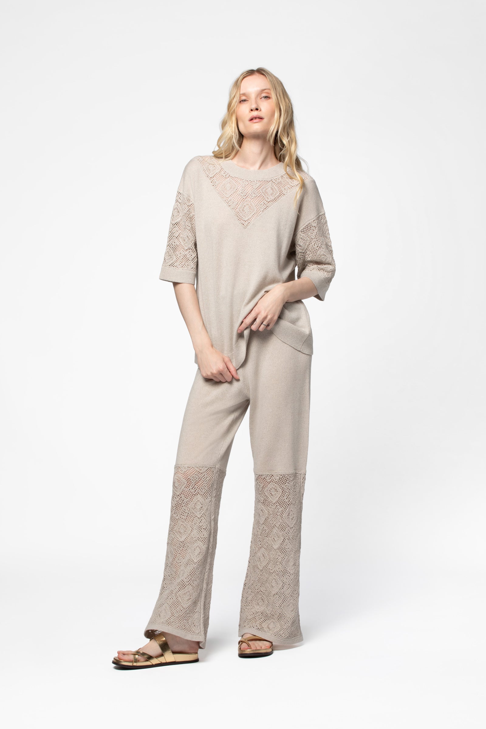 - Crochet-effect knit at the neckline and sleeves