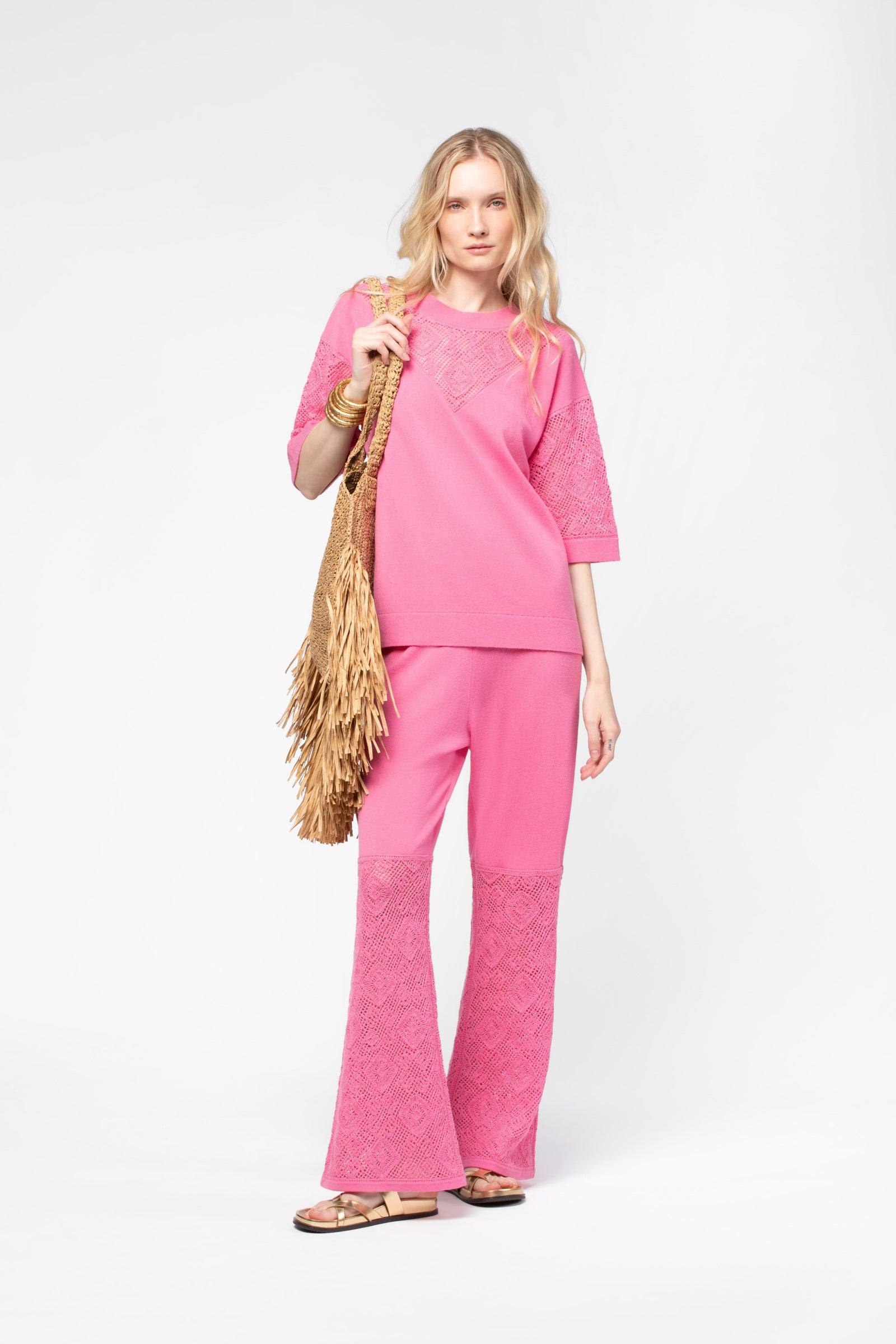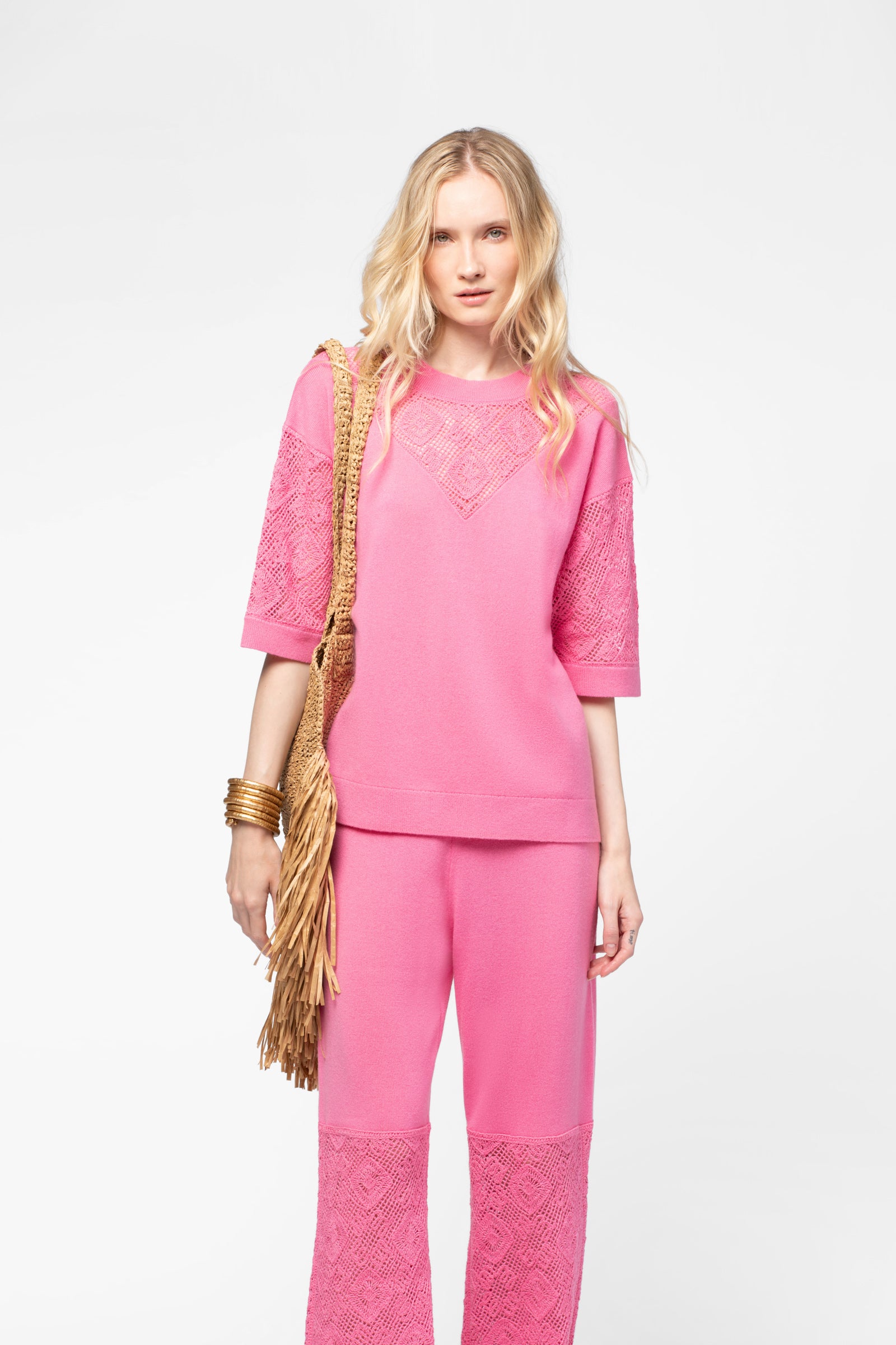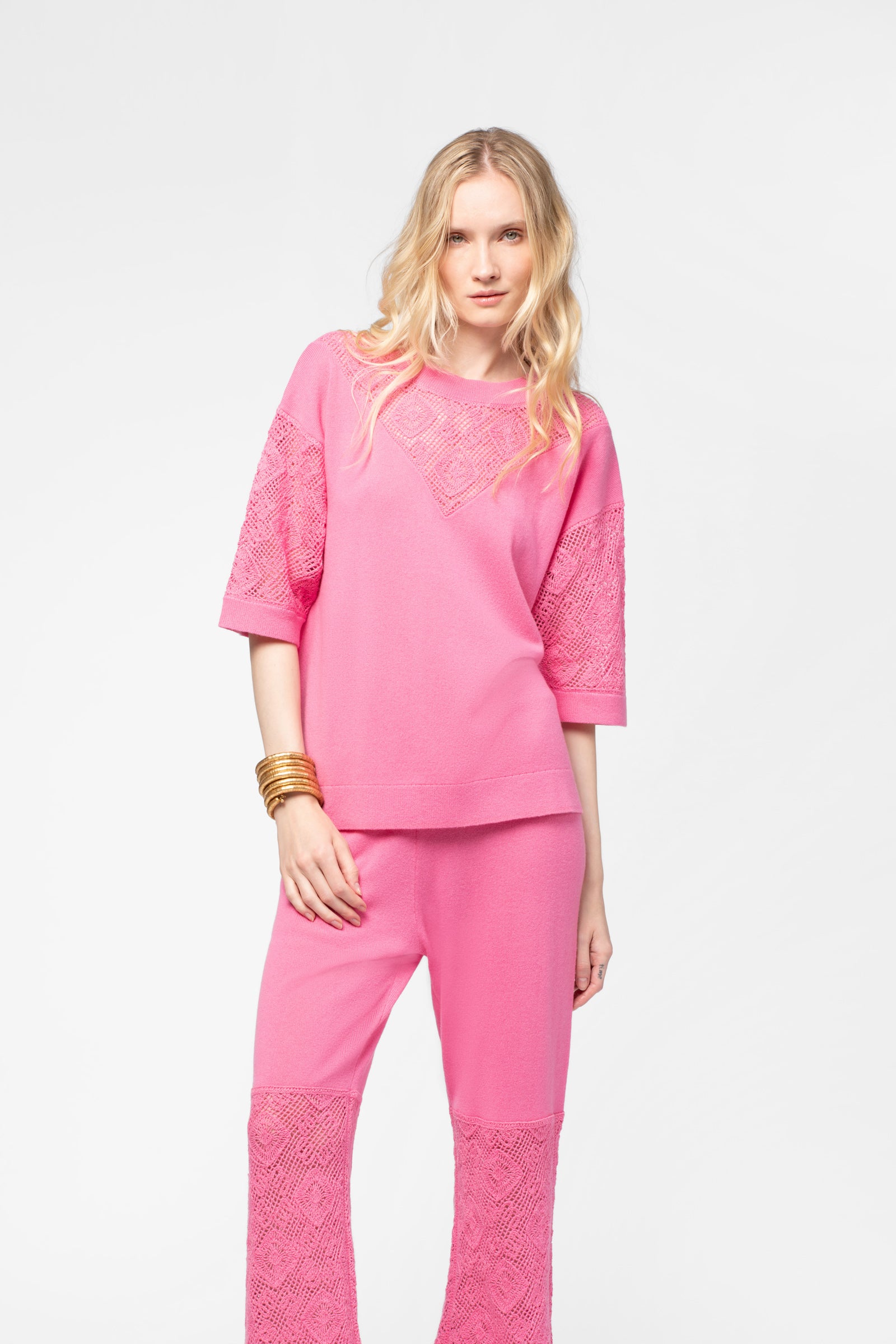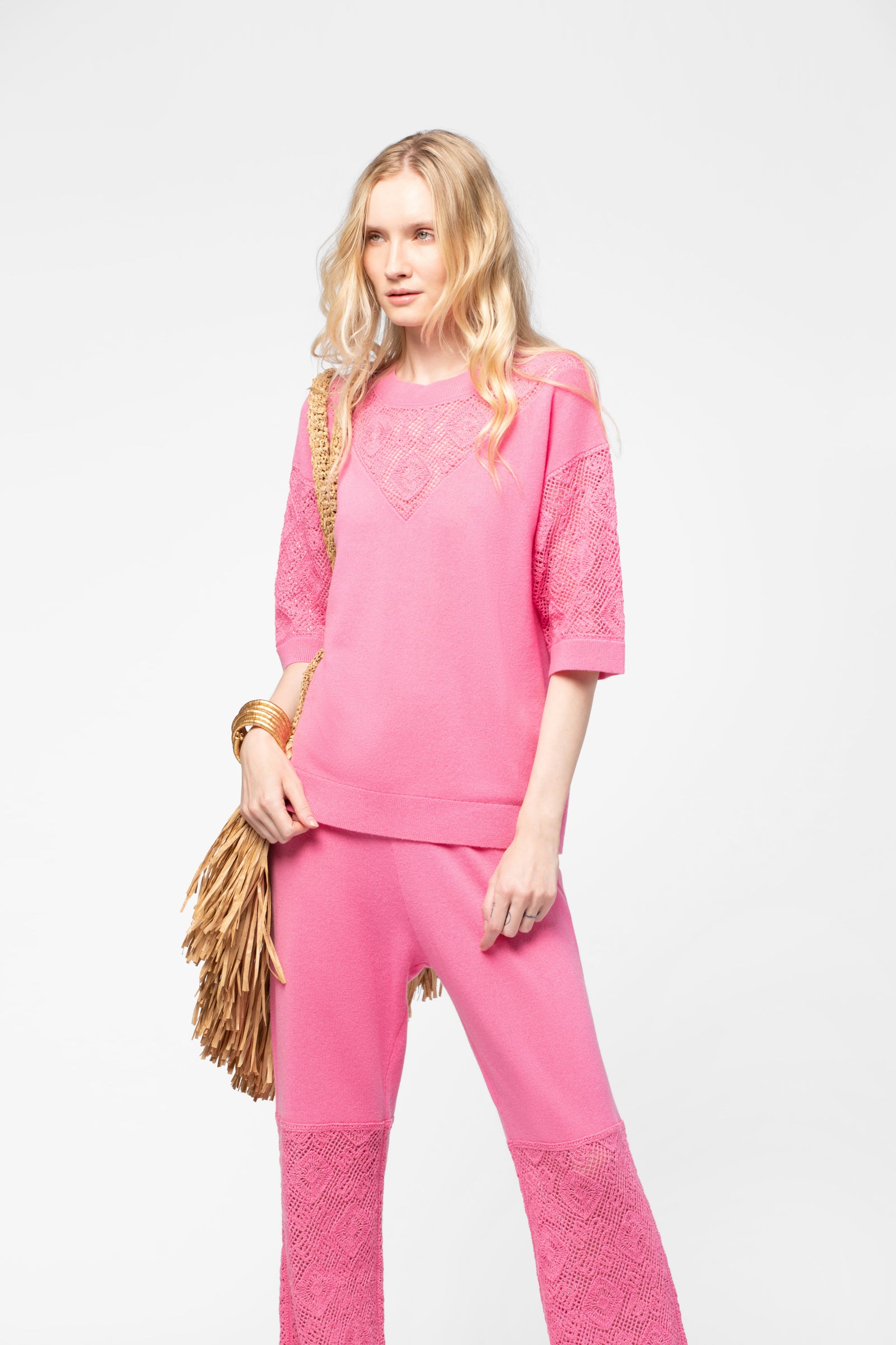 - Crochet-effect knit at the neckline and sleeves