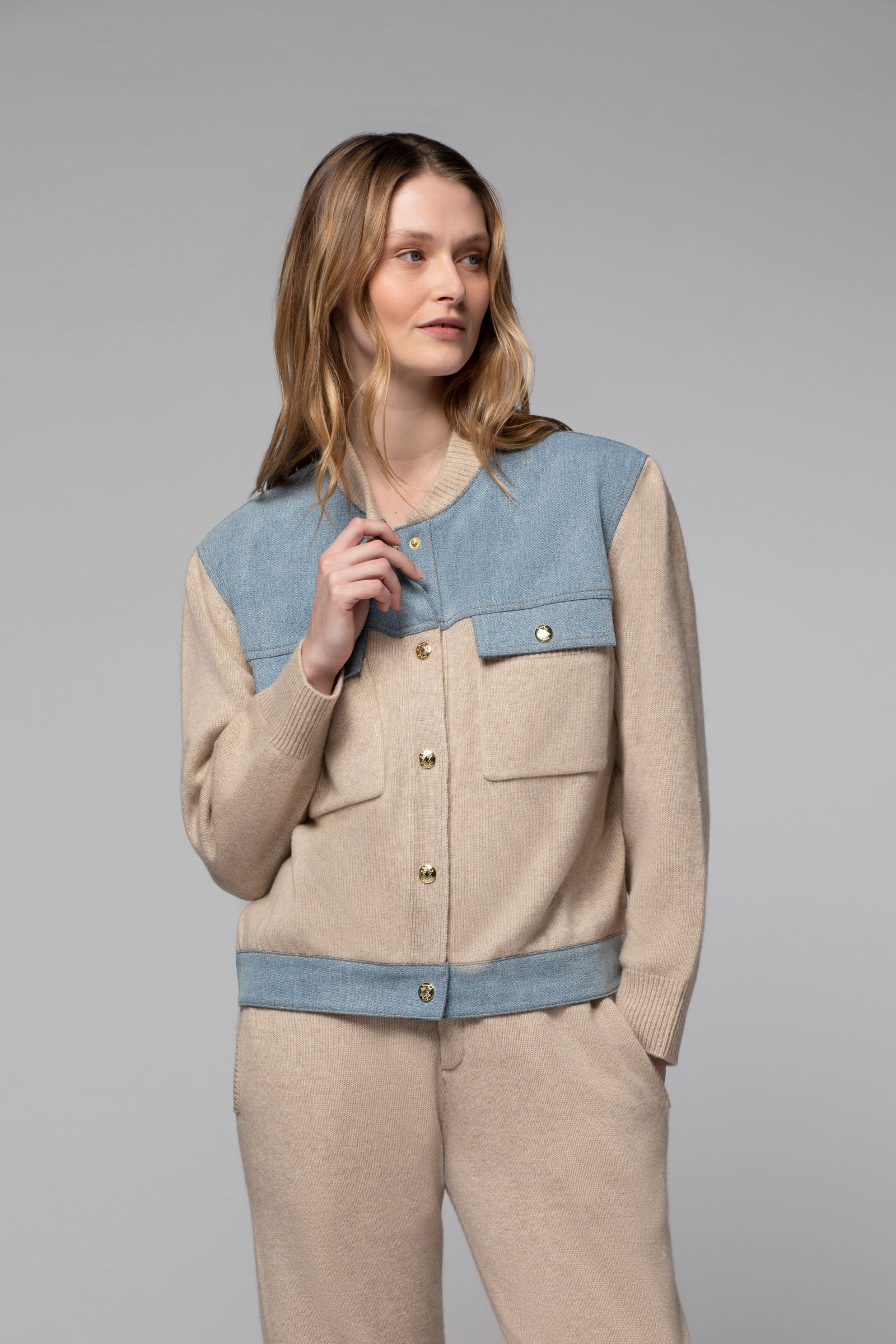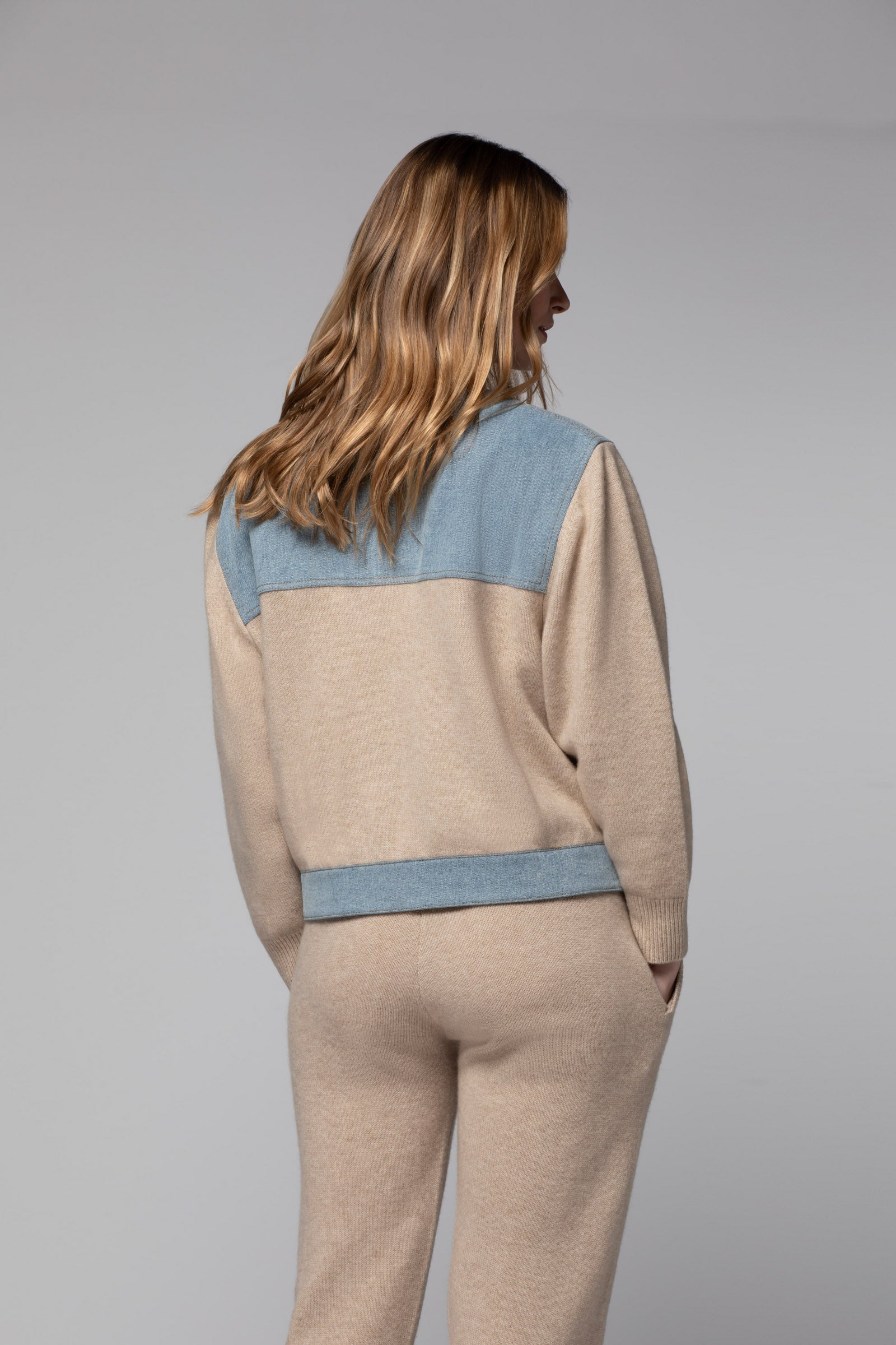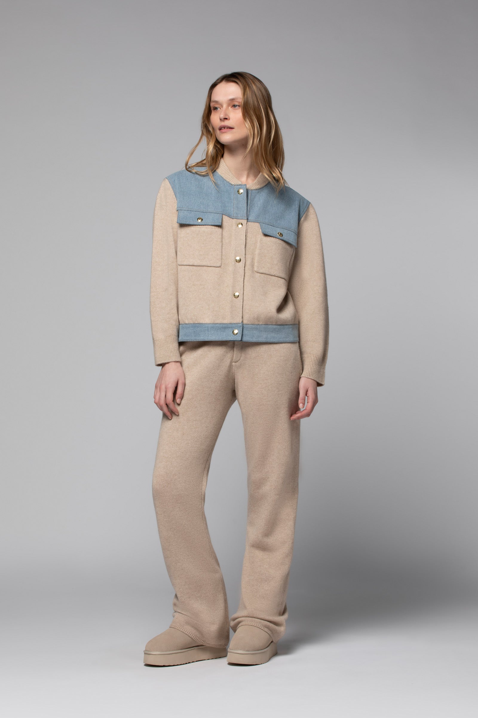 Effortlessly stylish, this knit and denim jacket adapts to every mood: wear it as a full look with denim pants for a bold statement, or pair it with our iconic leather leggings for a more daring edge. Styled with our BAILA cashmere pants, it creates an irresistibly chic ensemble.