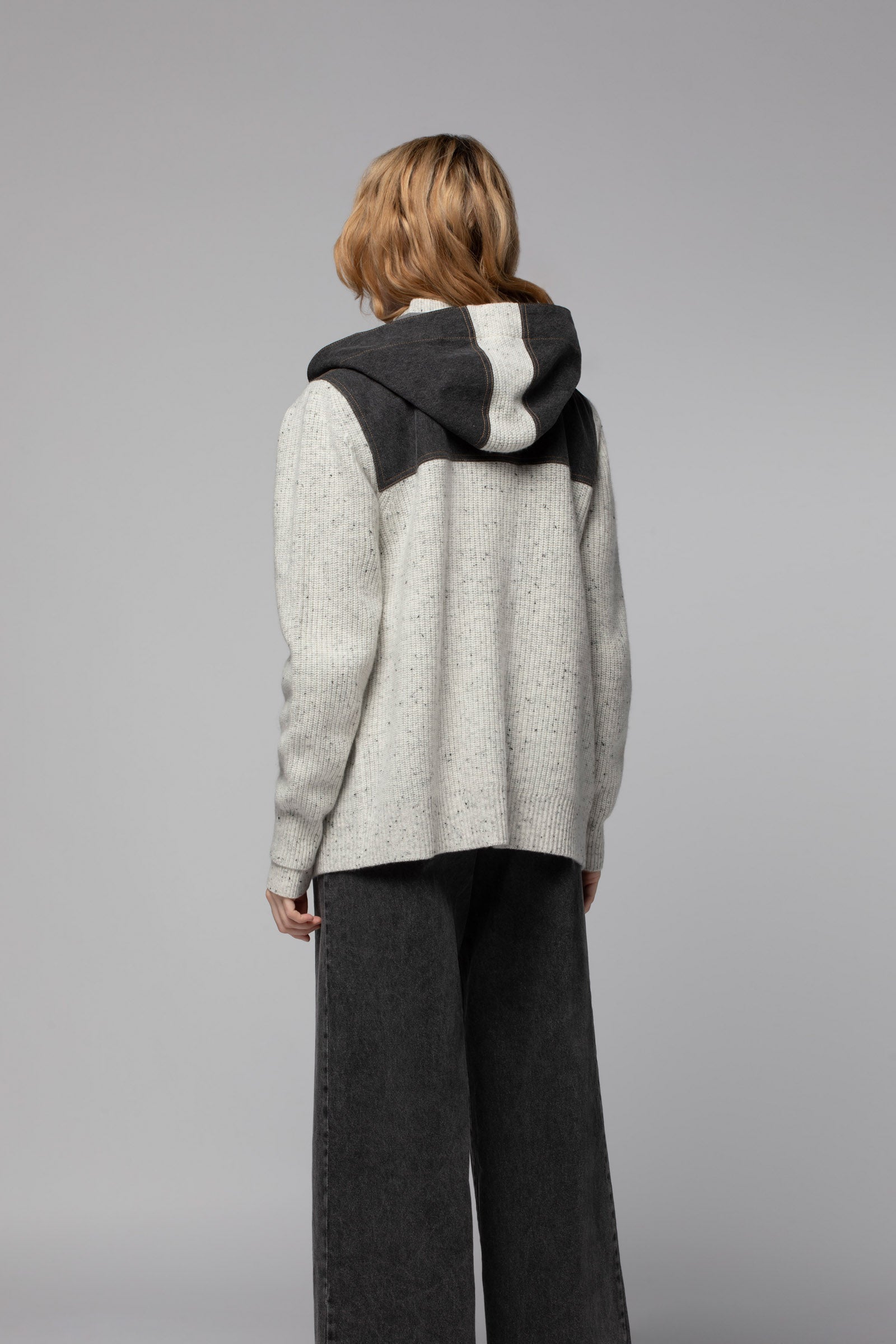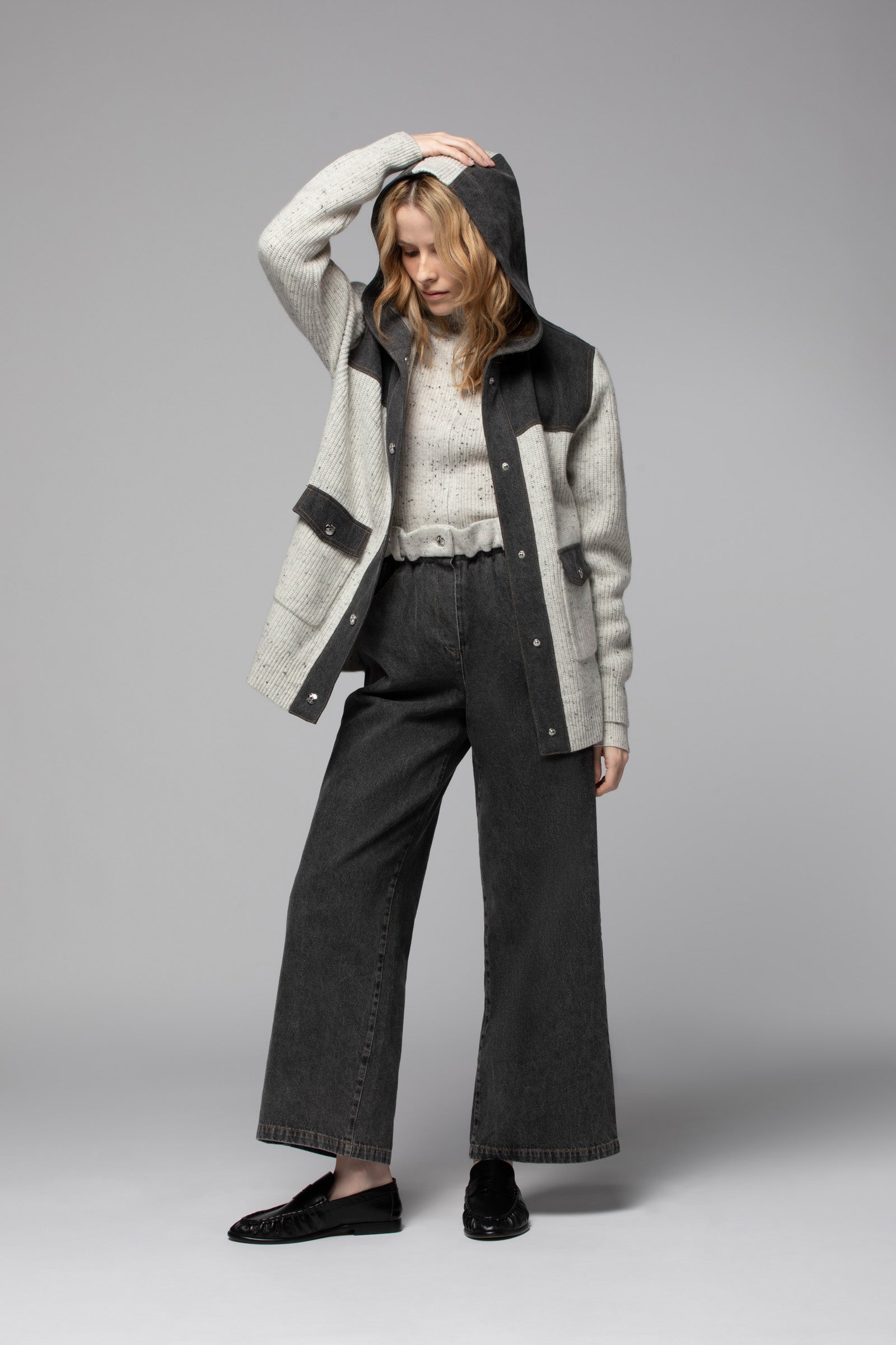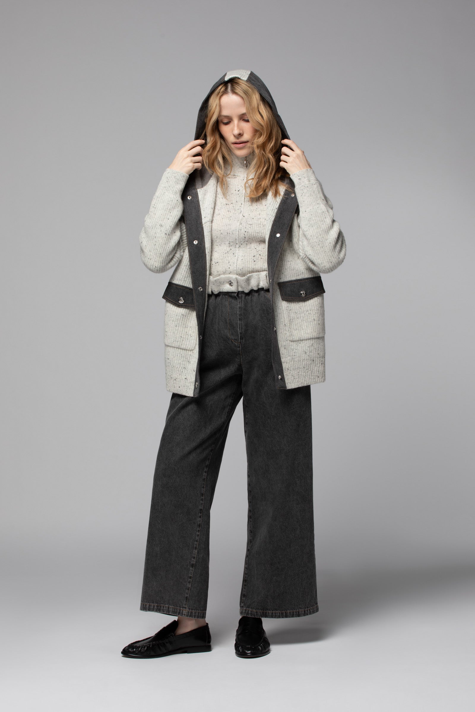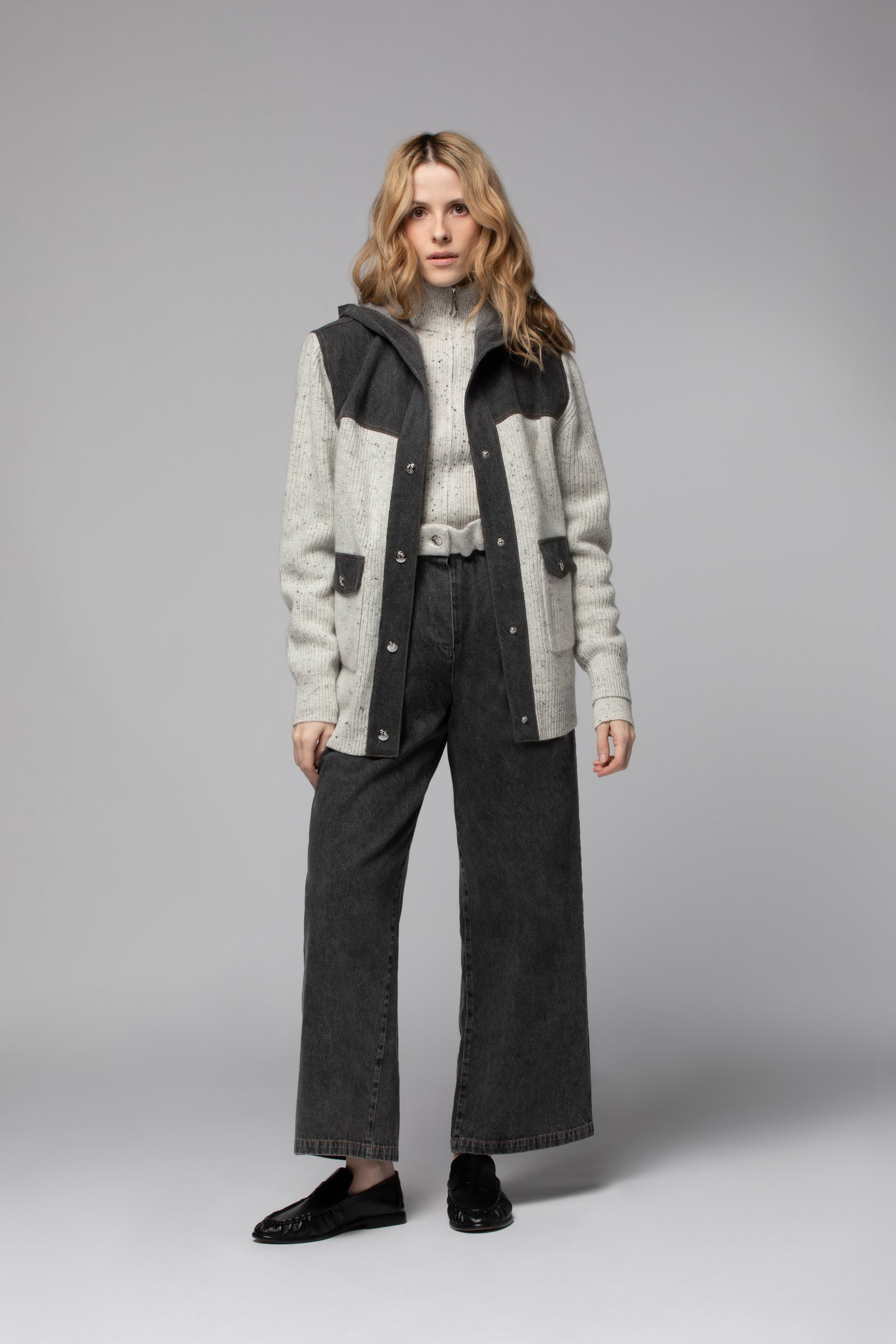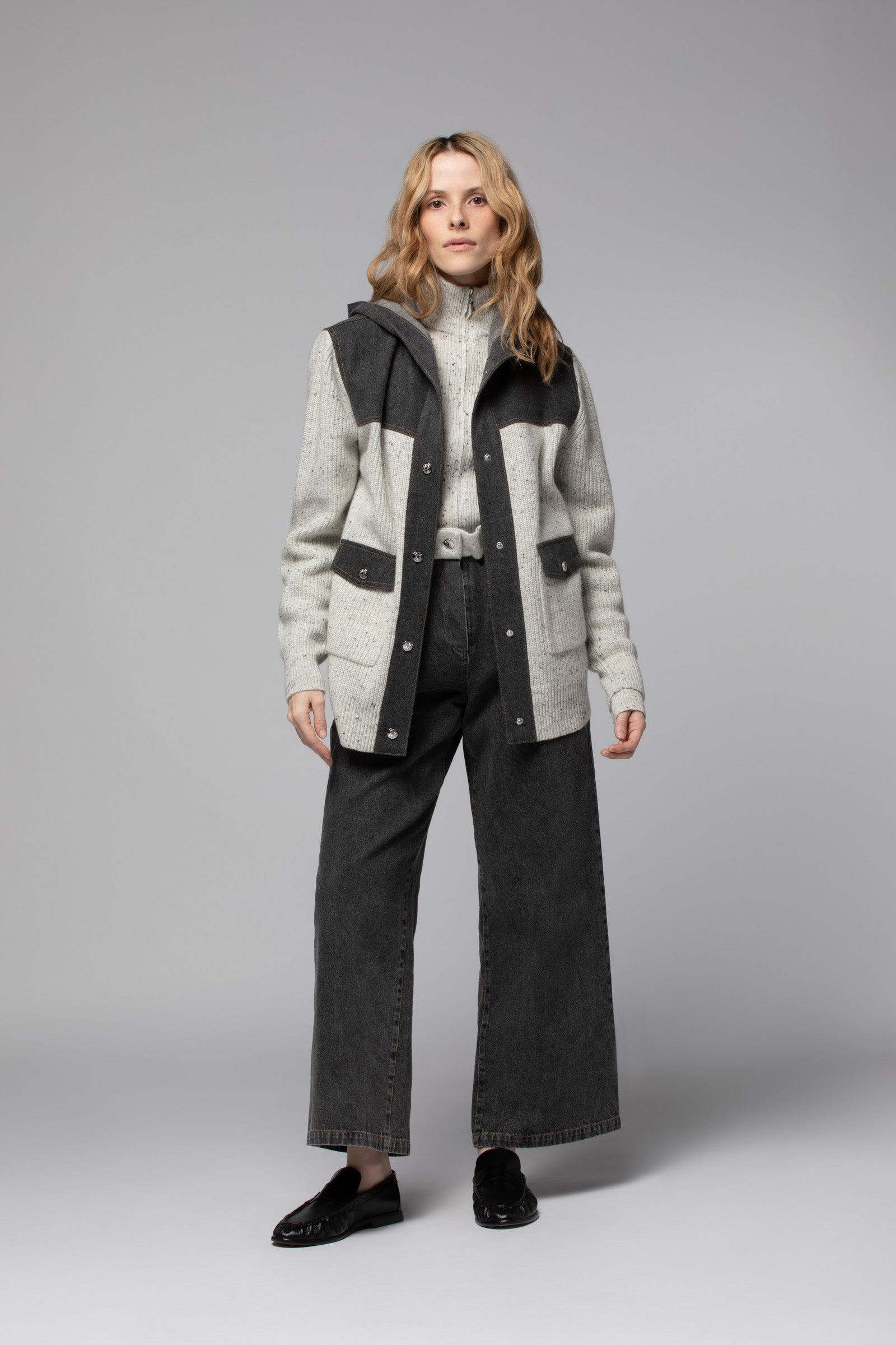 Worn open or buttoned over a silk camisole or ultra-light cashmere layer, this mixed-material women’s jacket instantly elevates your style. For a sophisticated monochrome outfit, pair it with cashmere pants from the MAX&MOI collection. For a more urban edge, go for denim pants or our iconic lamb leather leggings.