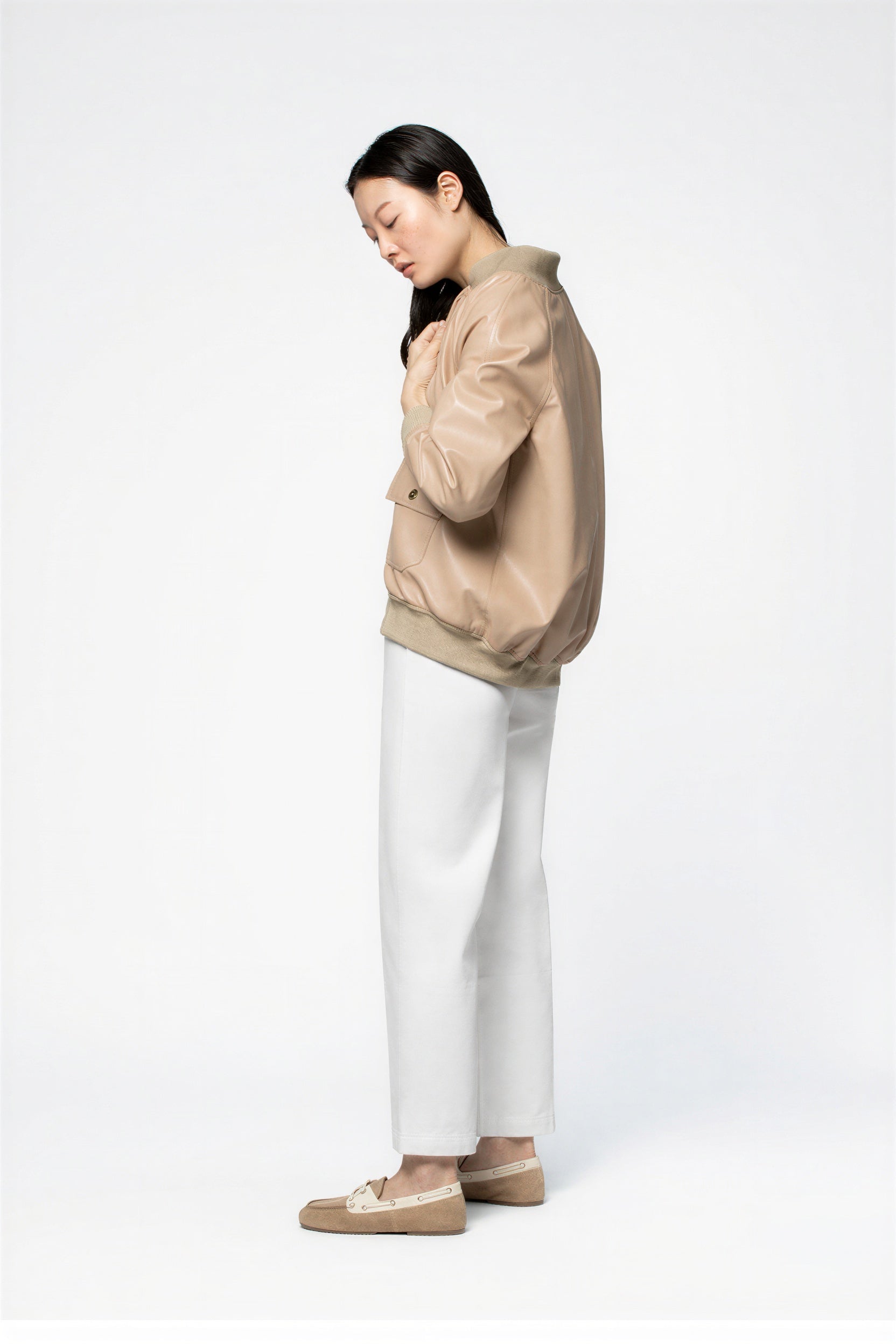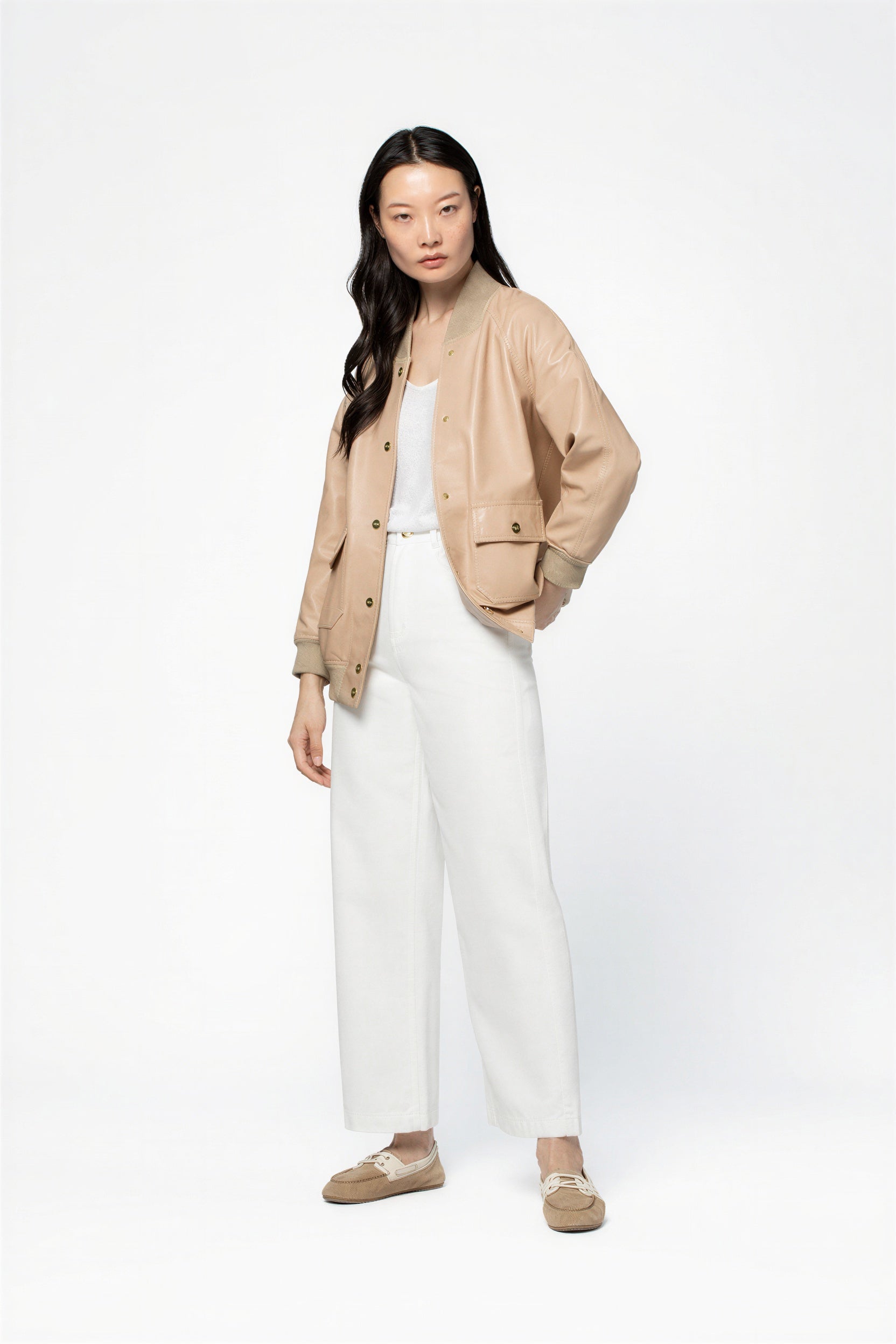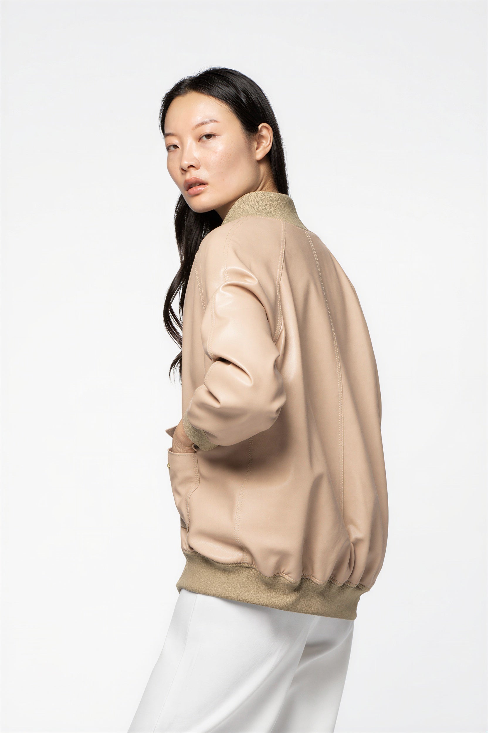 Versatile and easy to style, this women’s leather bomber jacket pairs effortlessly with silk trousers, white denim, or a long, fluid skirt, creating an urban, modern and confidently elegant silhouette.