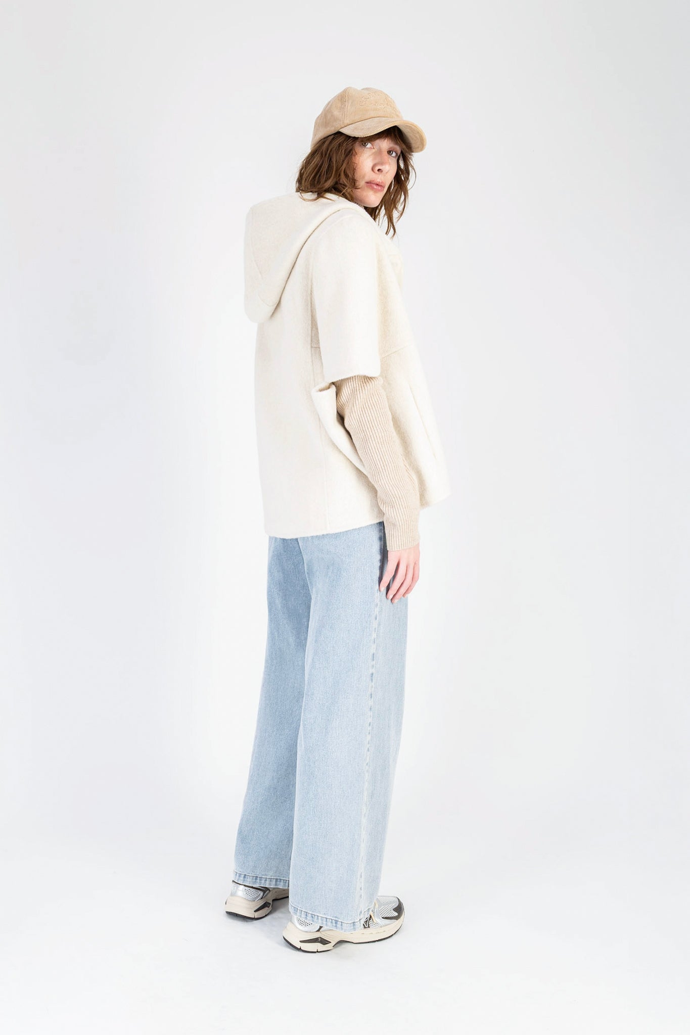 Versatile, this wool cape adapts to all your style desires. For a casual-chic look, pair it with jeans and sneakers, complemented by a cap for an assertive urban vibe. At work, in the evening, or for a dressier outfit, it effortlessly matches a cashmere skirt, silk pants, or our iconic lamb leather leggings.