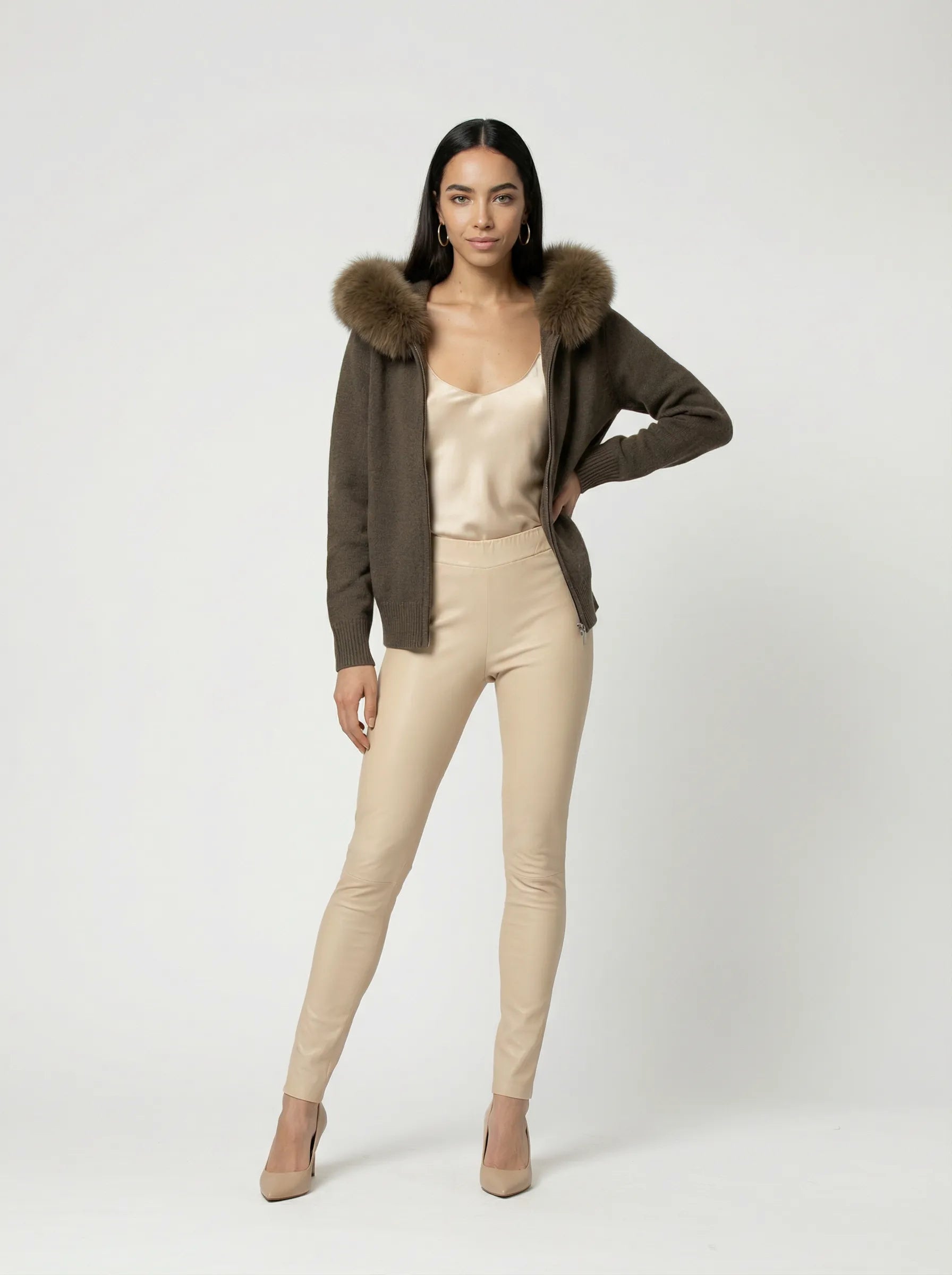 This women’s cashmere cardigan pairs perfectly with jeans, cashmere pants, or our iconic lambskin leather leggings.