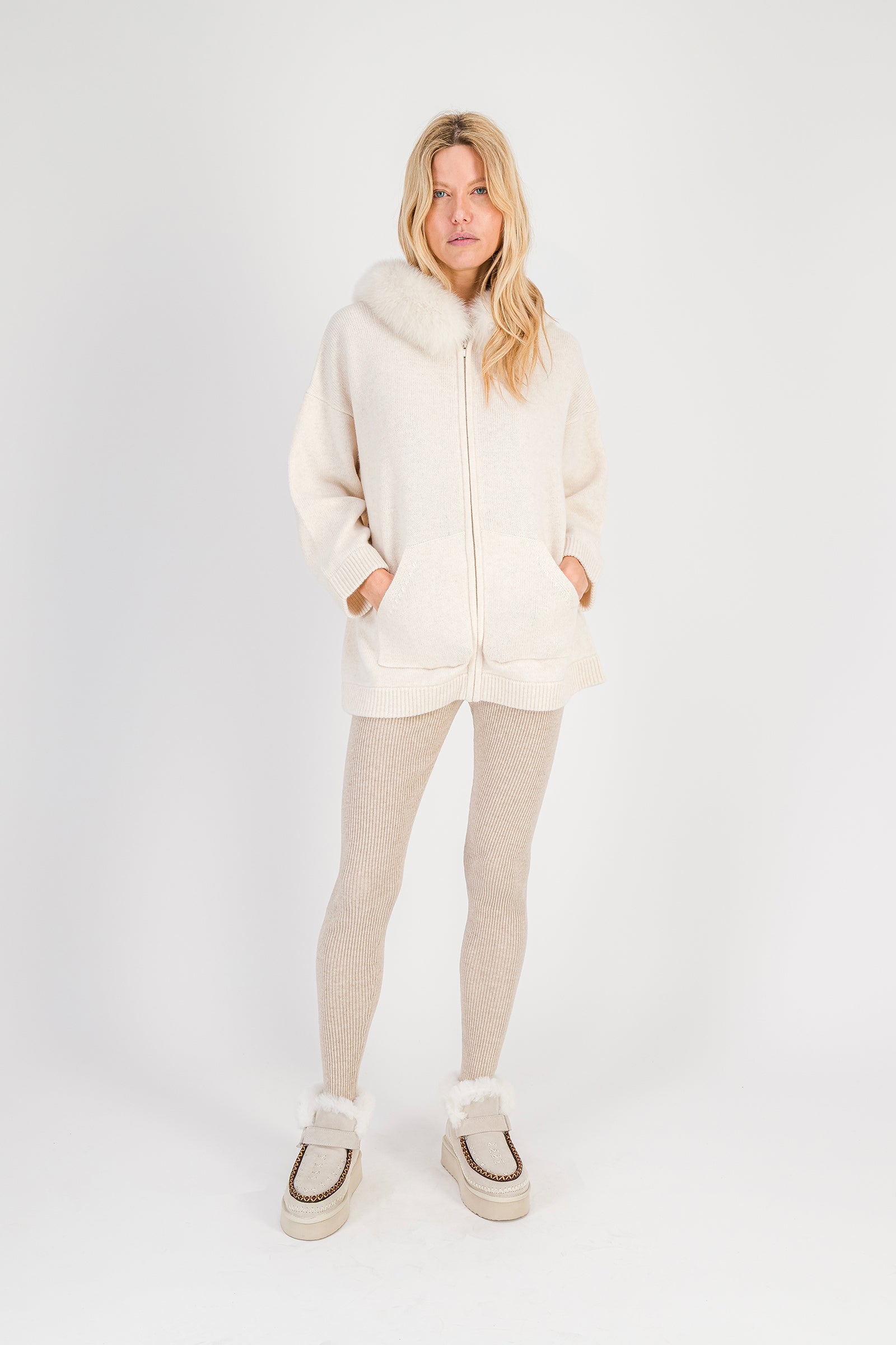 Made from 100% cashmere knit, our SIMPSON vest softly drapes the silhouette and stands out as a winter wardrobe essential. With its relaxed fit, dropped shoulders, slightly shortened long sleeves, zip closure, and large patch pockets, it exudes a sporty yet feminine elegance. Practical yet sophisticated, it features a generous hood enhanced with a stunning detachable fox fur trim.