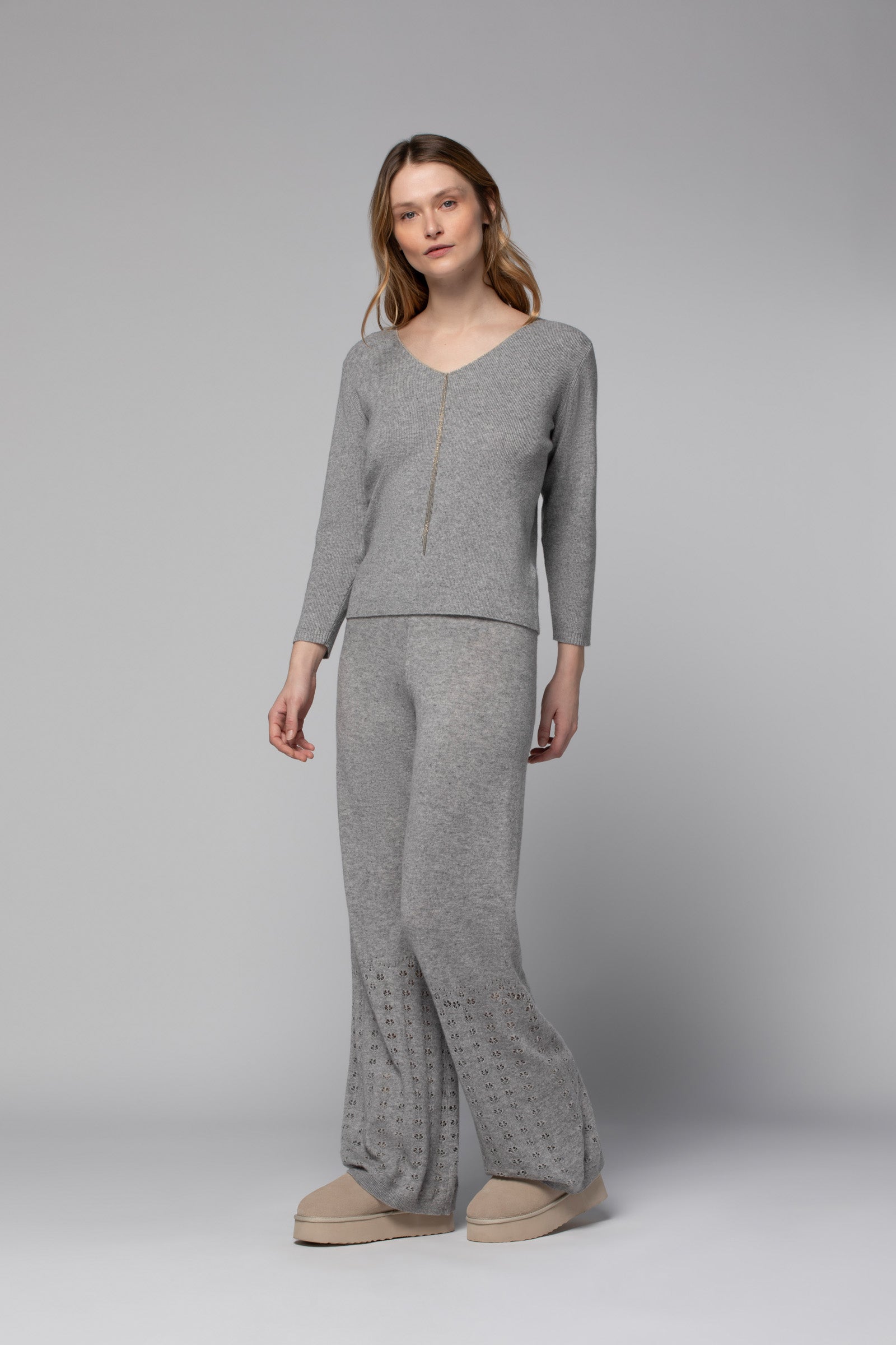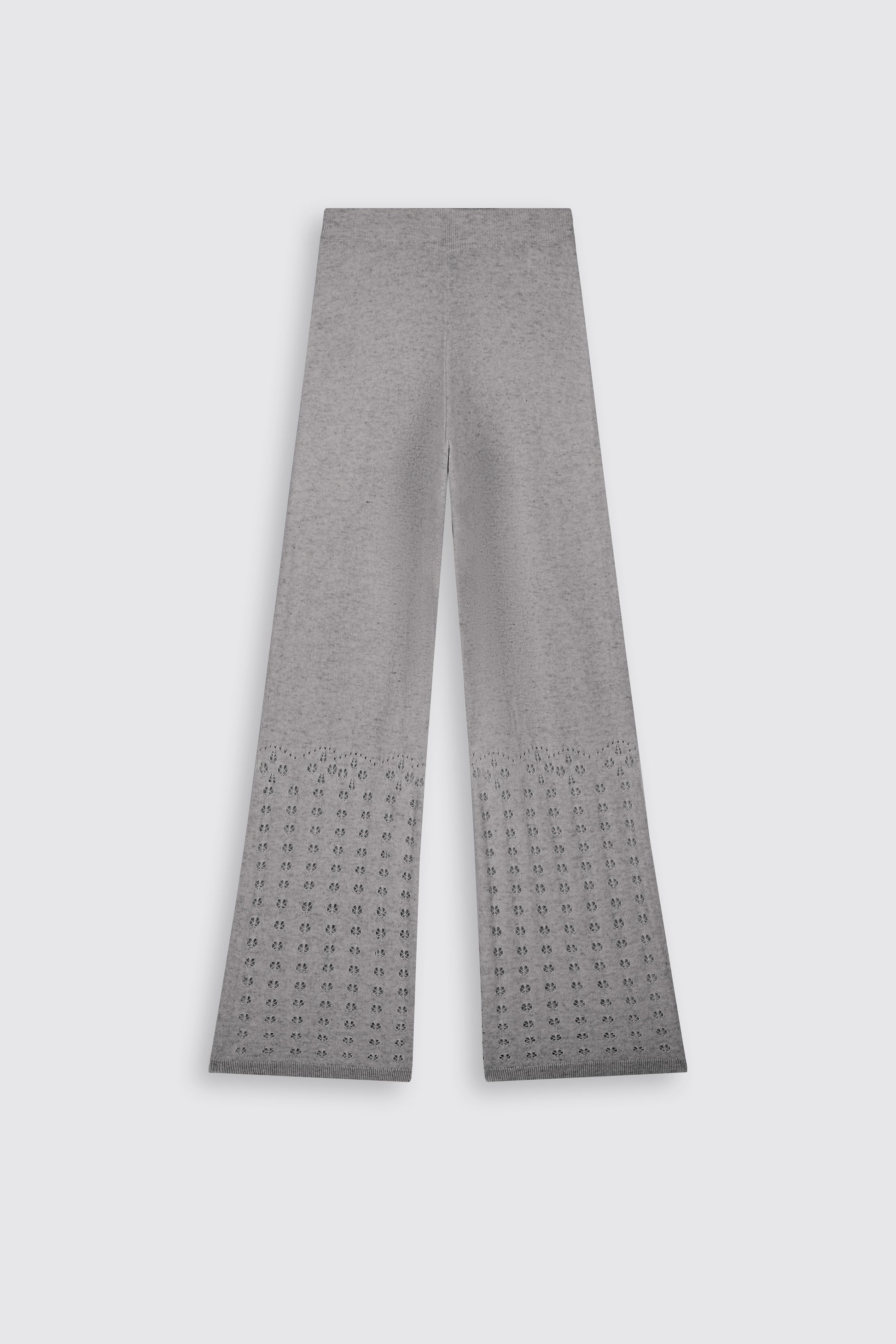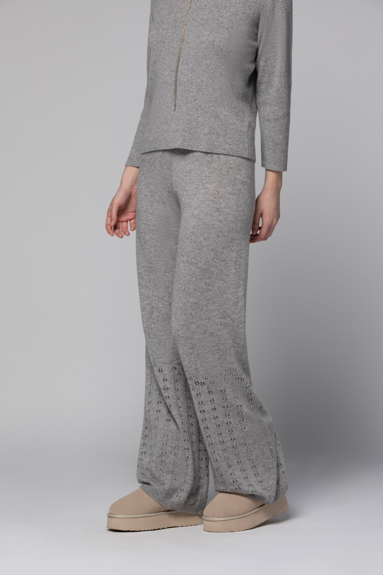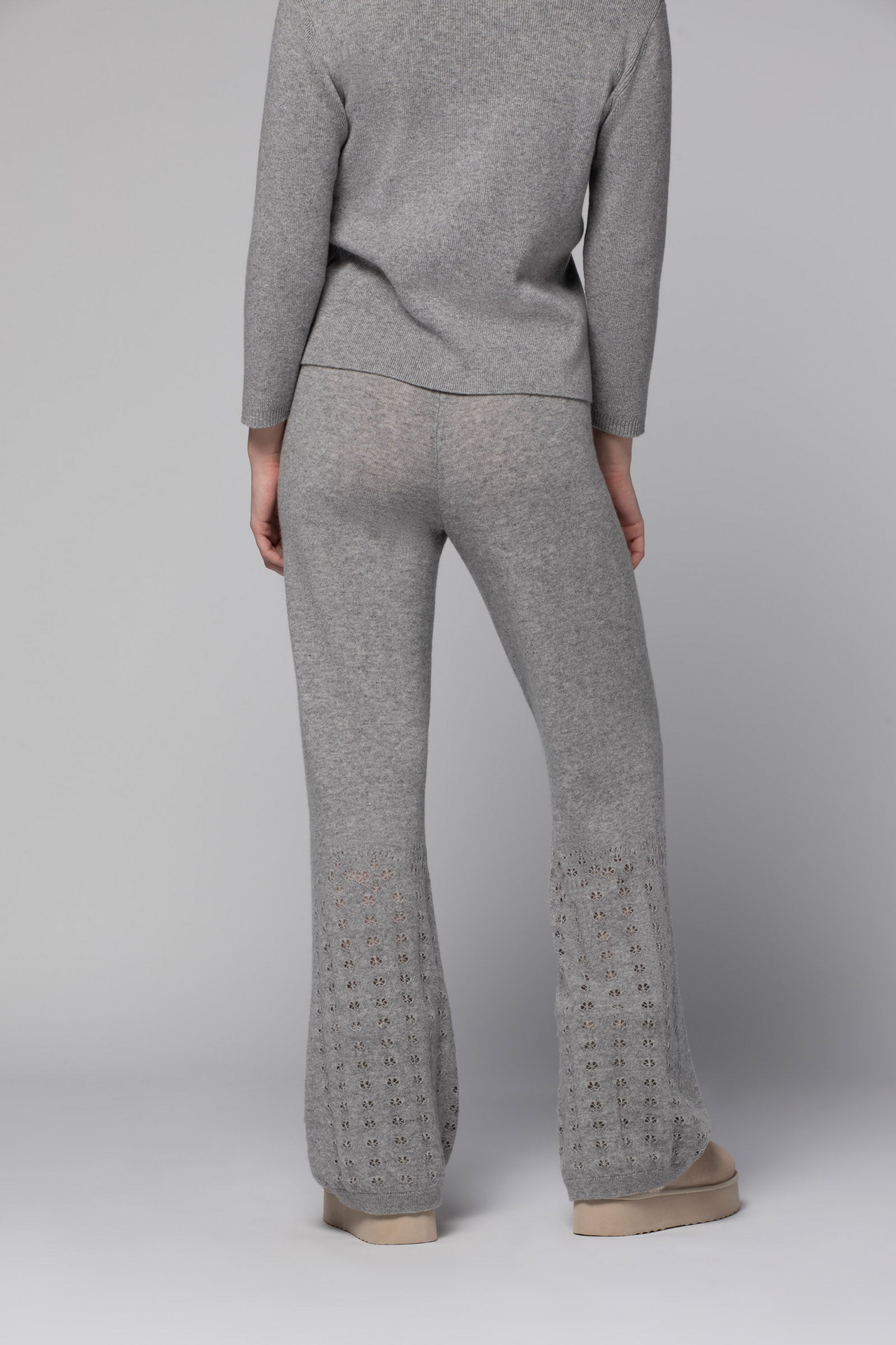 Our BIANCA pants are a true style gem. Crafted from a soft wool and cashmere knit, they feature a straight, fluid, and enveloping cut that enhances the figure while allowing total freedom of movement. Their delicate openwork pointelle knit at the bottom of the legs adds a chic, bohemian touch. For added comfort, the ribbed knit elastic waistband ensures a perfect fit.