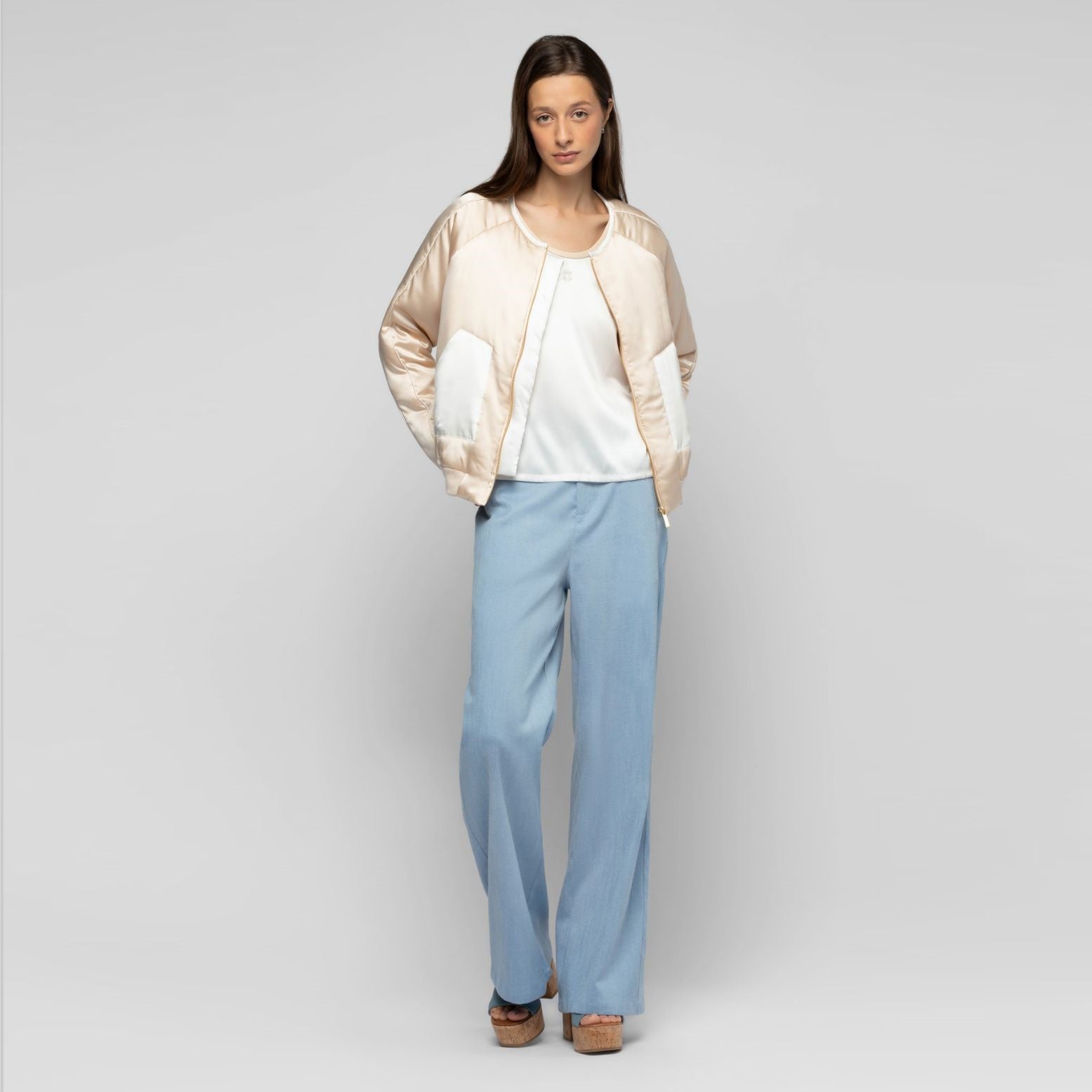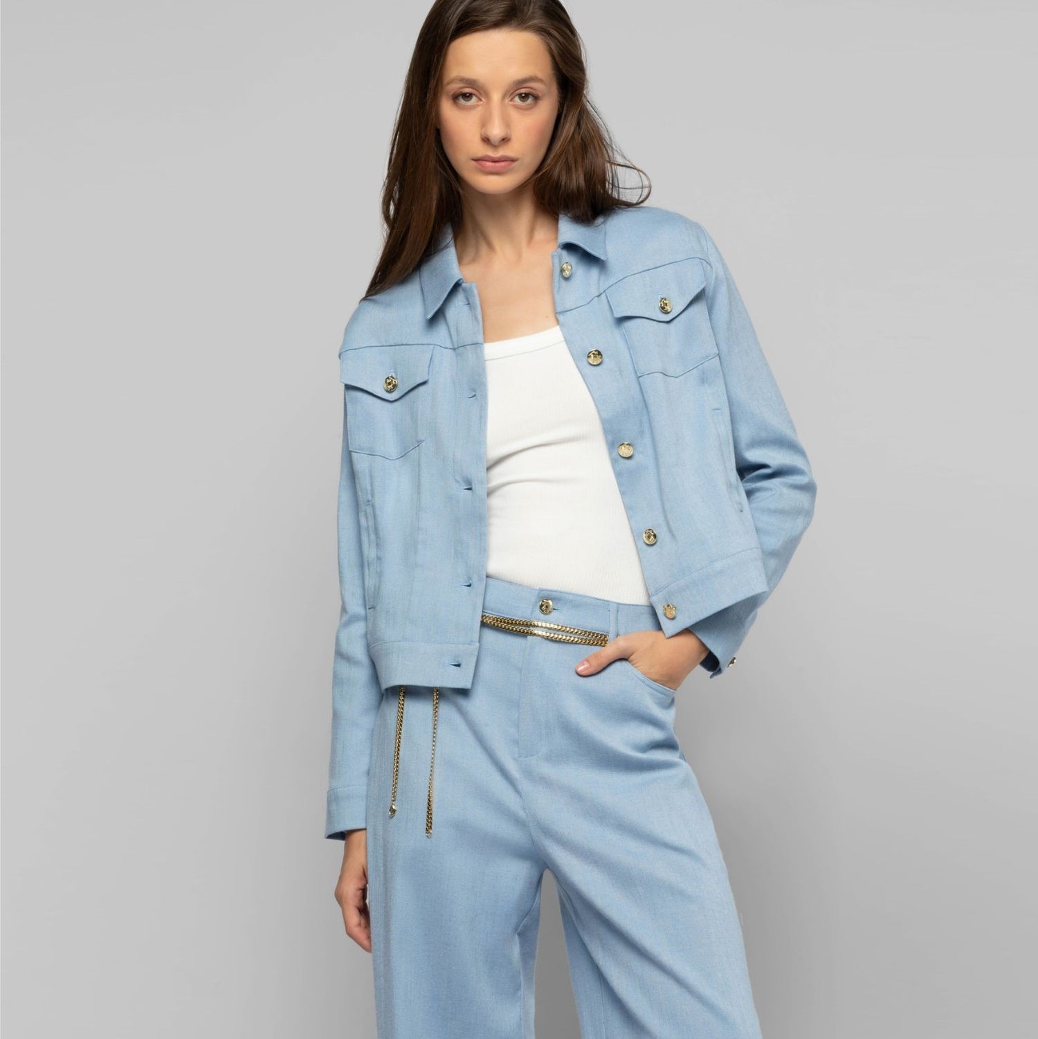Confectionnés en chambray de coton, notre veste et notre jean façon denim insufflent à la silhouette une dégaine faussement décontractée où se mêlent douceur et raffinement.