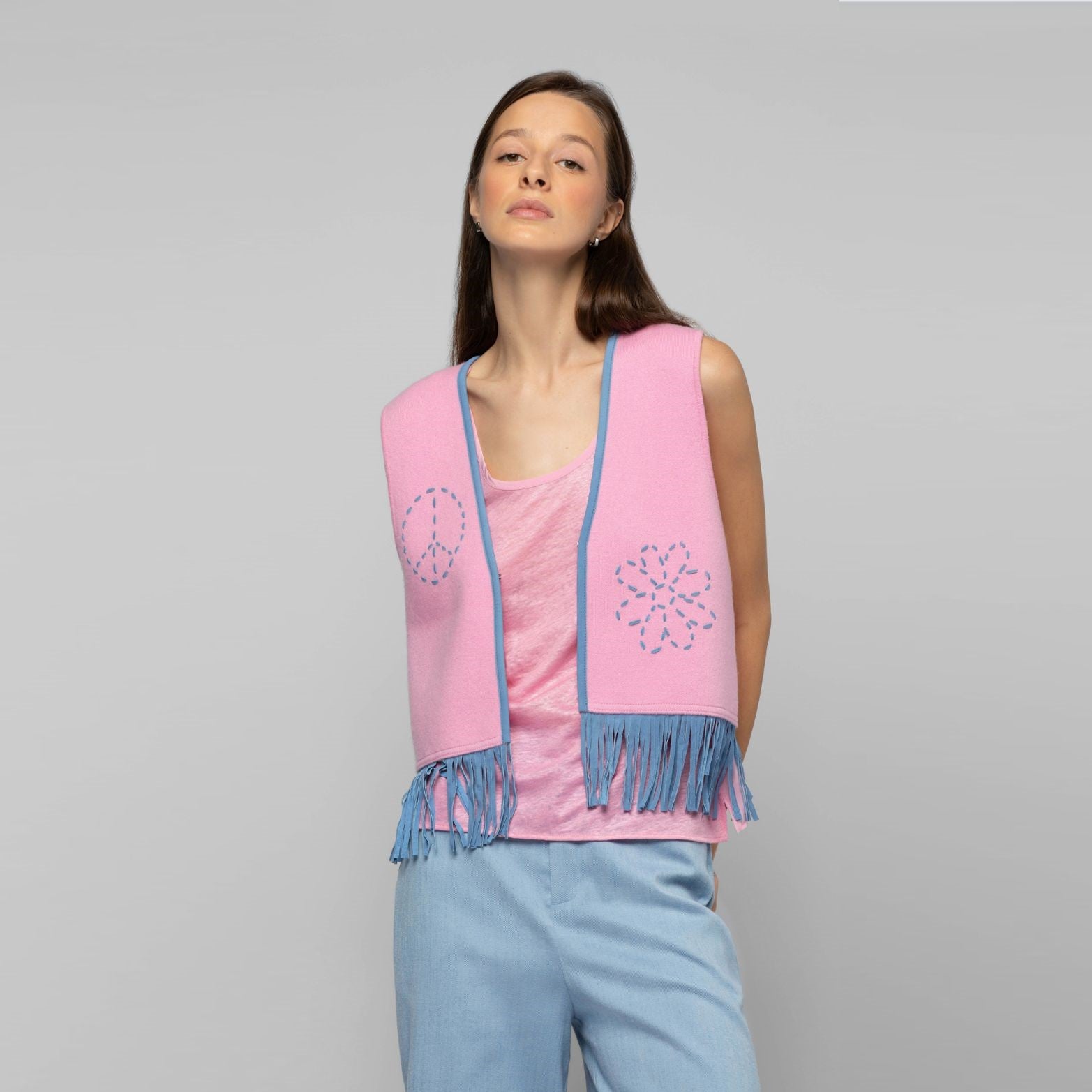 Associé à un gilet en cachemire sans manches à franges aux accents 70s, il apporte un esprit bohème et élégant à l’ensemble.