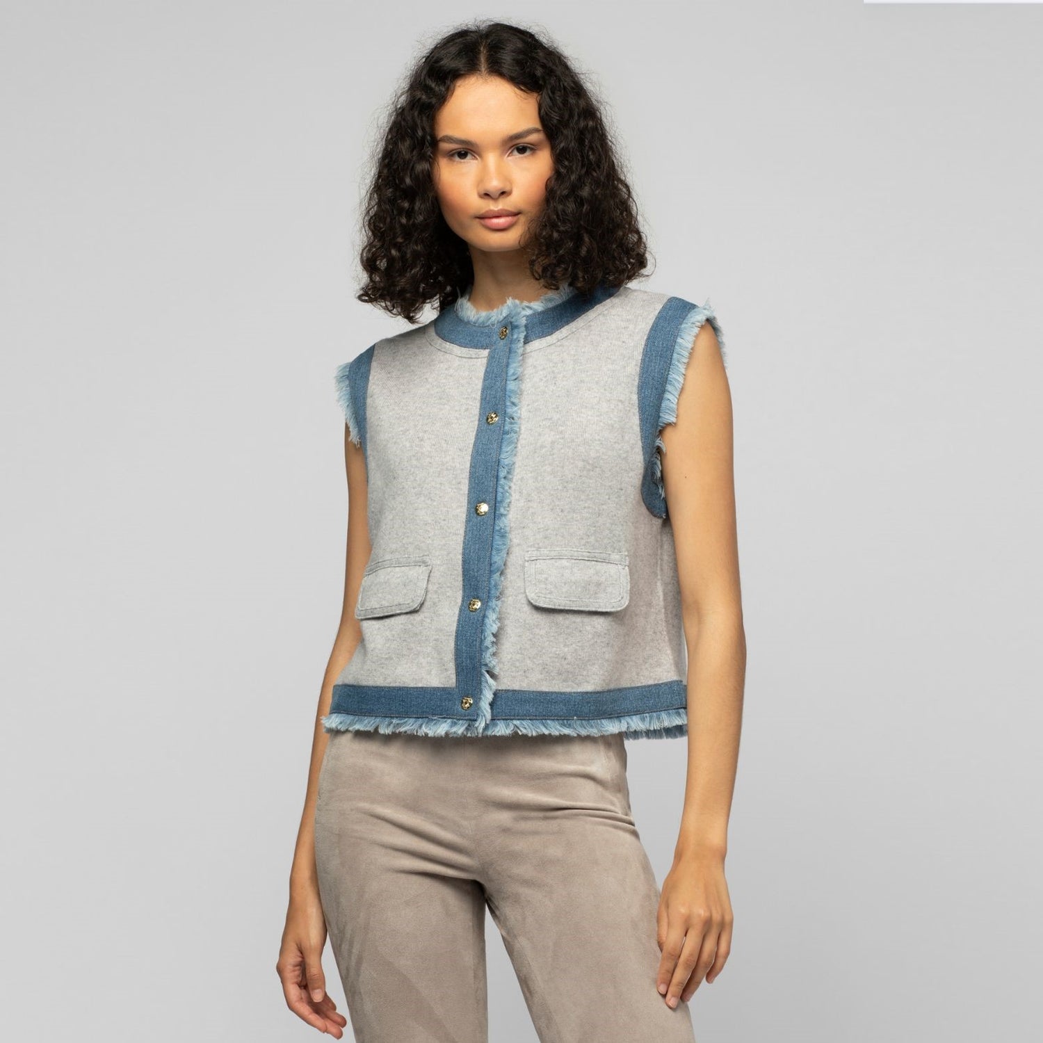 Confectionnée en maille laine et cachemire, notre veste VADELA à manches longues met à l'honneur le denim. Les boutons pression dorés, le col rond, la patte de boutonnage, les poches plaquées et l’ourlet à finition frangée et détails denim soulignent l'allure de cette pièce qui conjugue modernité, élégance et personnalité.