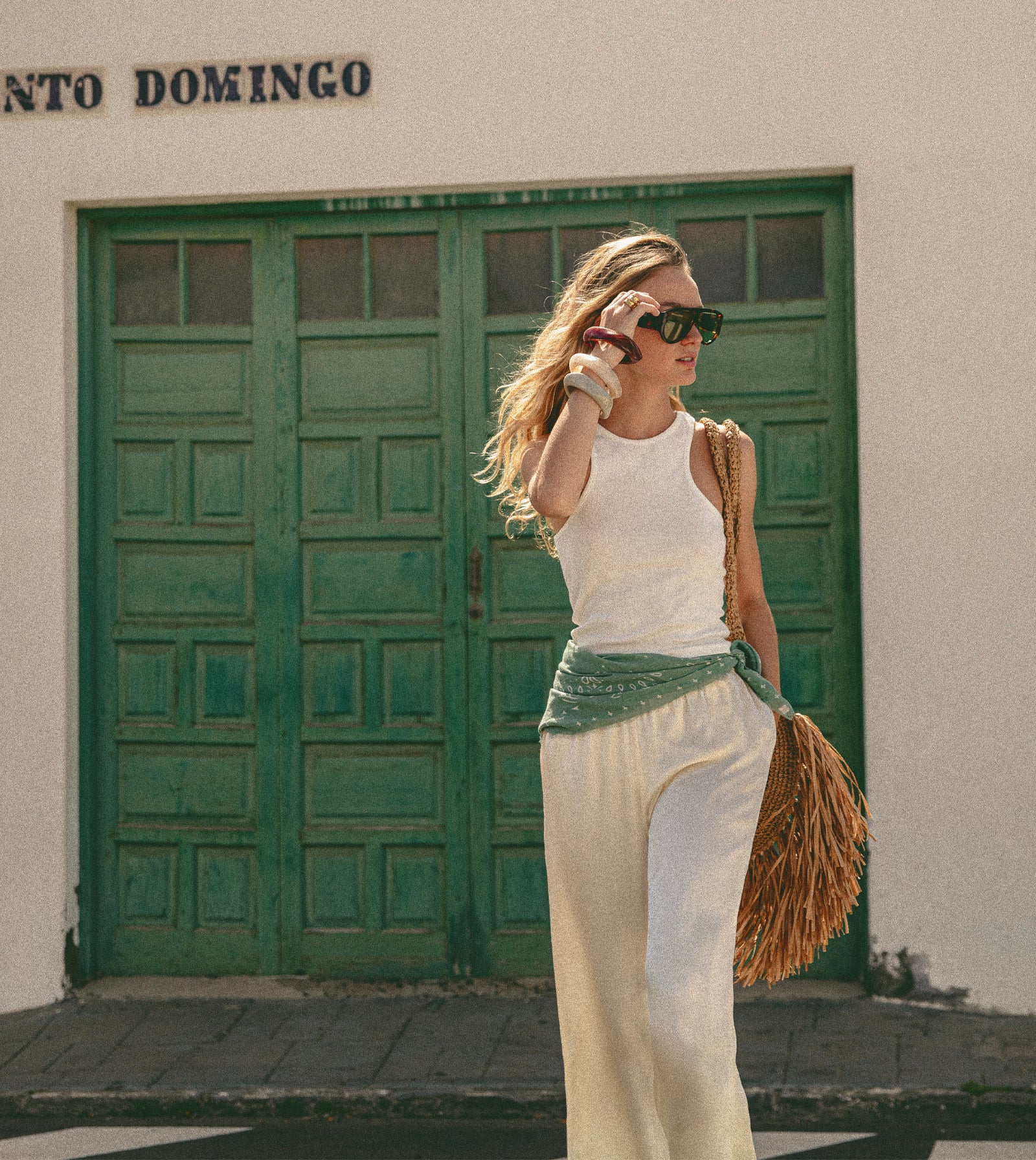 Je voulais un vestiaire pensé pour voyager, se déplacer, vivre. Des pièces que l’on emporte avec soi, et qui nous accompagnent, du matin au soir. À Lanzarote, l’île a cette simplicité brute, cette beauté presque essentielle, qui révèle les matières — et celle qui les porte.
