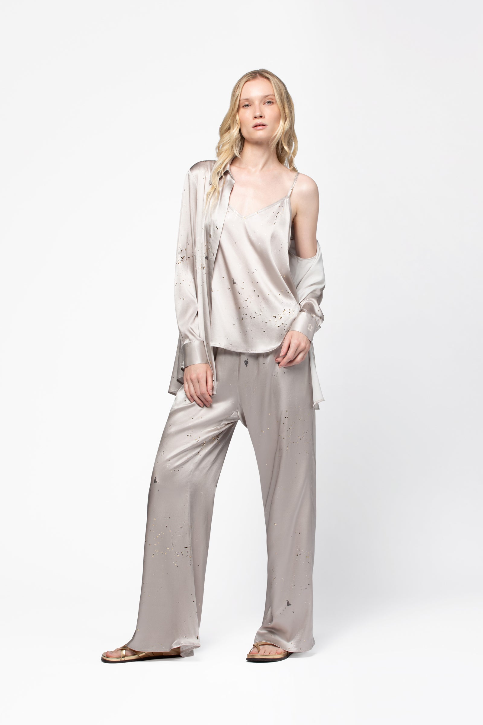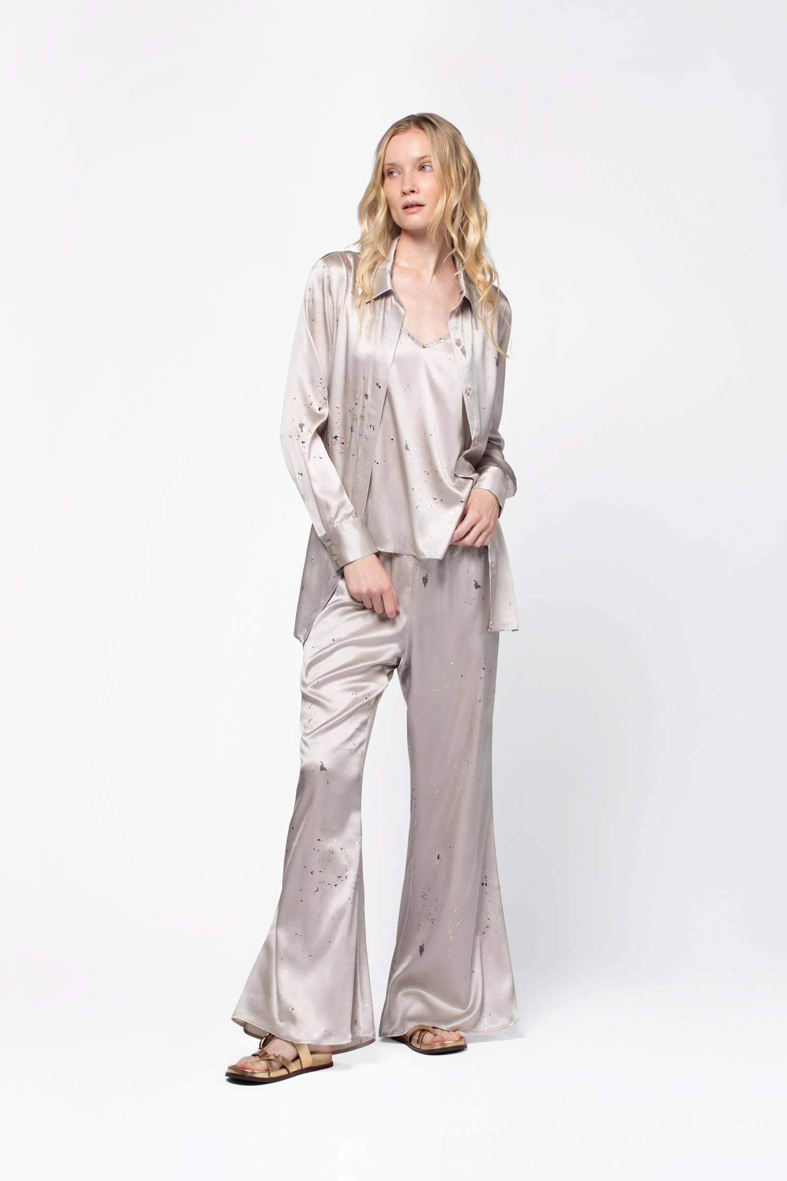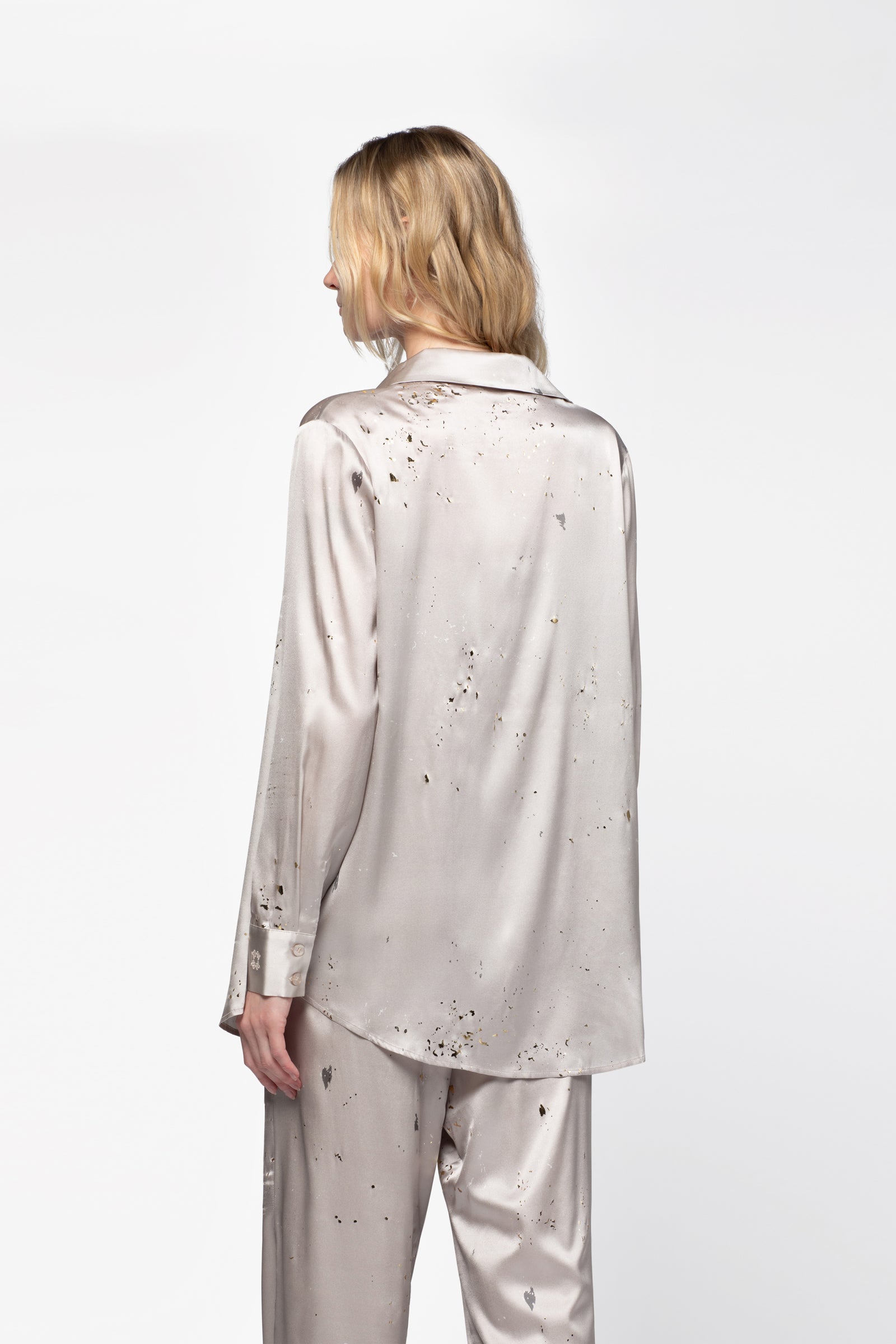 Portée fermée ou ouverte, par-dessus un caraco en soie, cette chemise en soie femme vous accompagnera au quotidien, de jour comme de nuit. Associée à notre legging en cuir d'agneau ou adoptée en total look avec un pantalon en soie de la collection MAX&MOI, elle compose une silhouette résolument contemporaine.