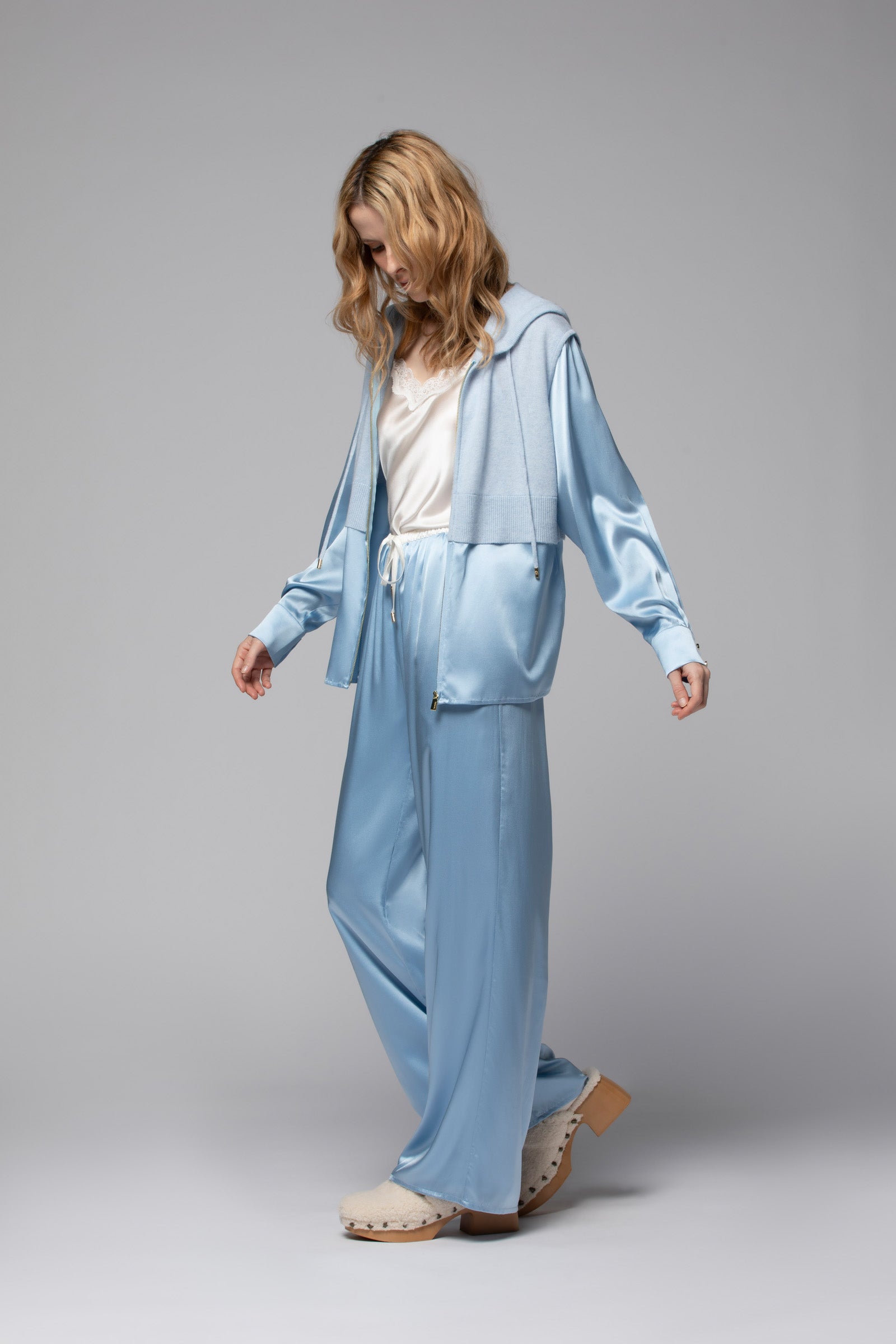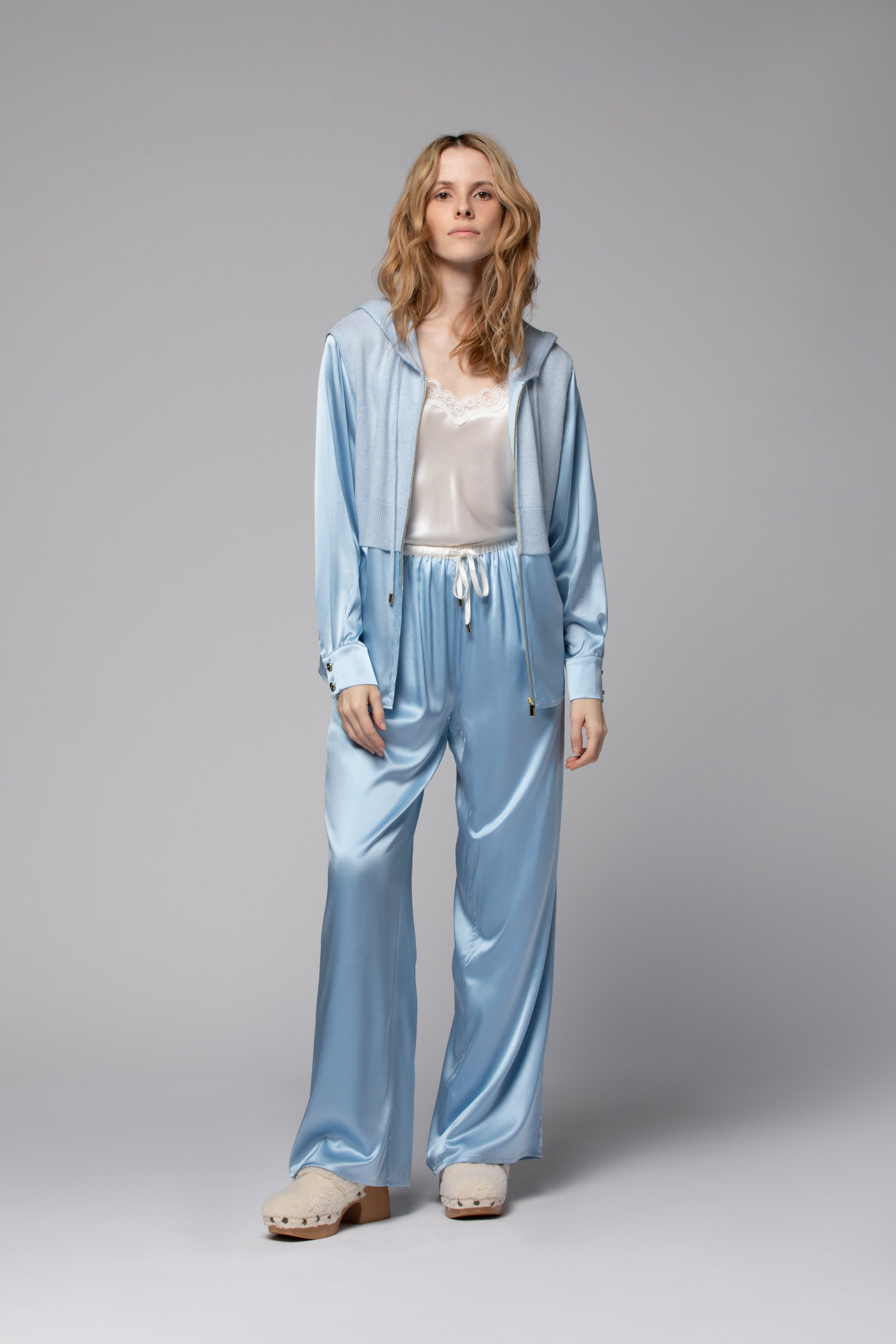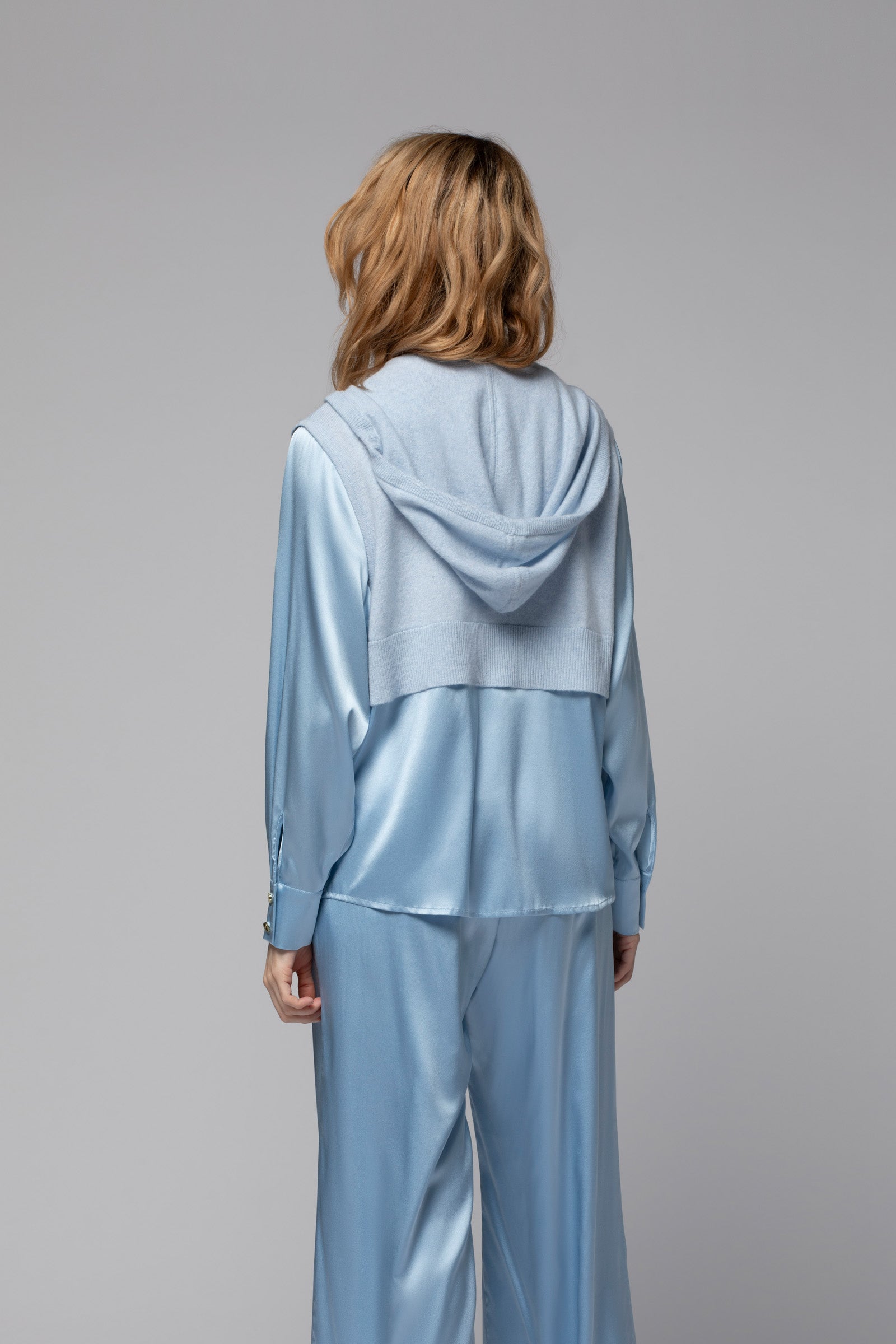 Notre gilet GRETA réinvente les codes du sweat zippé dans une version ultra-féminine et résolument moderne. Confectionné dans une douce maille en laine et cachemire, ce gilet bi-matière se distingue par ses manches et son bas en soie fluide, qui apportent une touche de raffinement et de légèreté. Sa capuche, dotée de cordons de serrage, insuffle un esprit décontracté, contrebalancée par les poignets chemise de ses manches longues, qui twistent l'allure pour un vestiaire casual-chic upgradé.