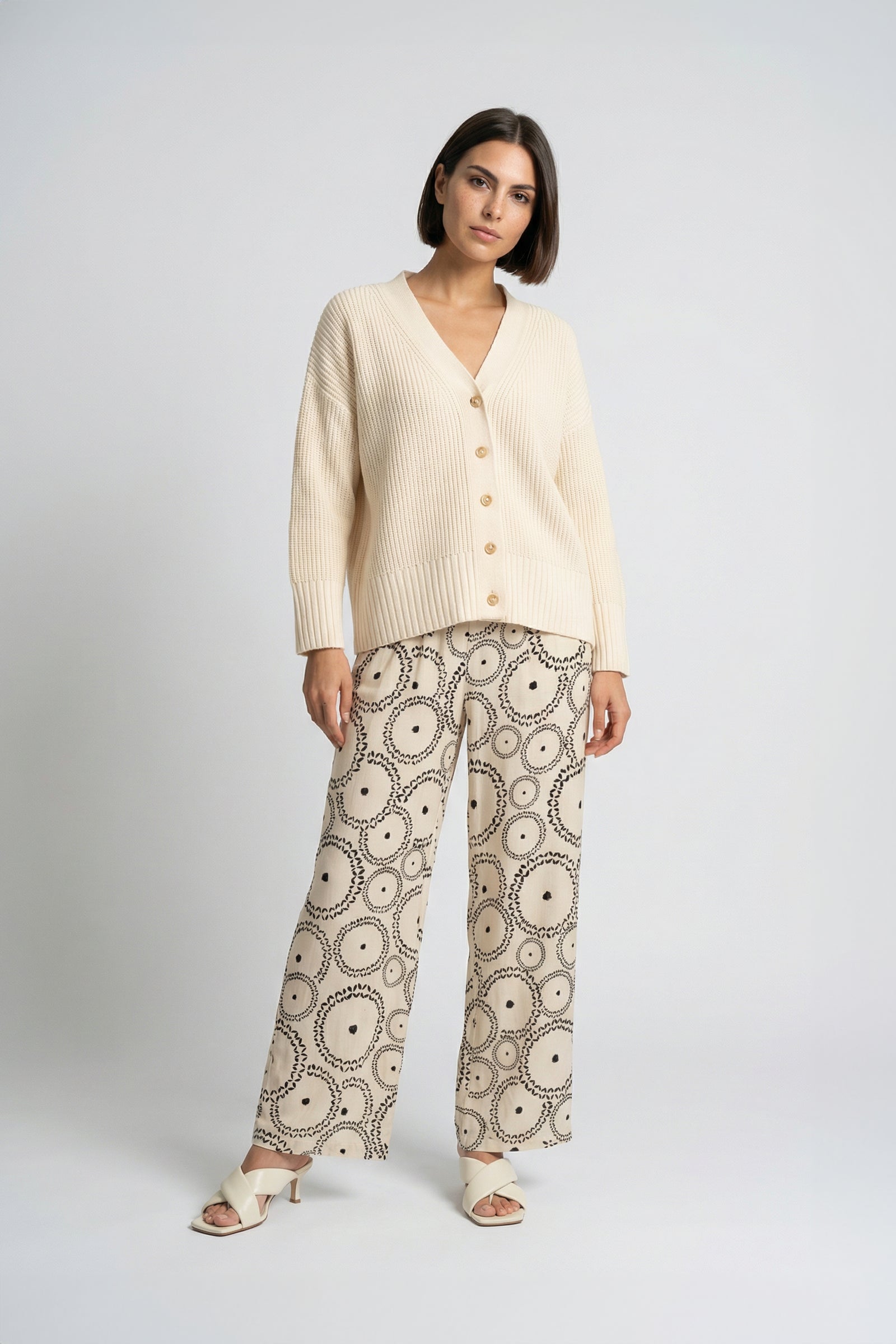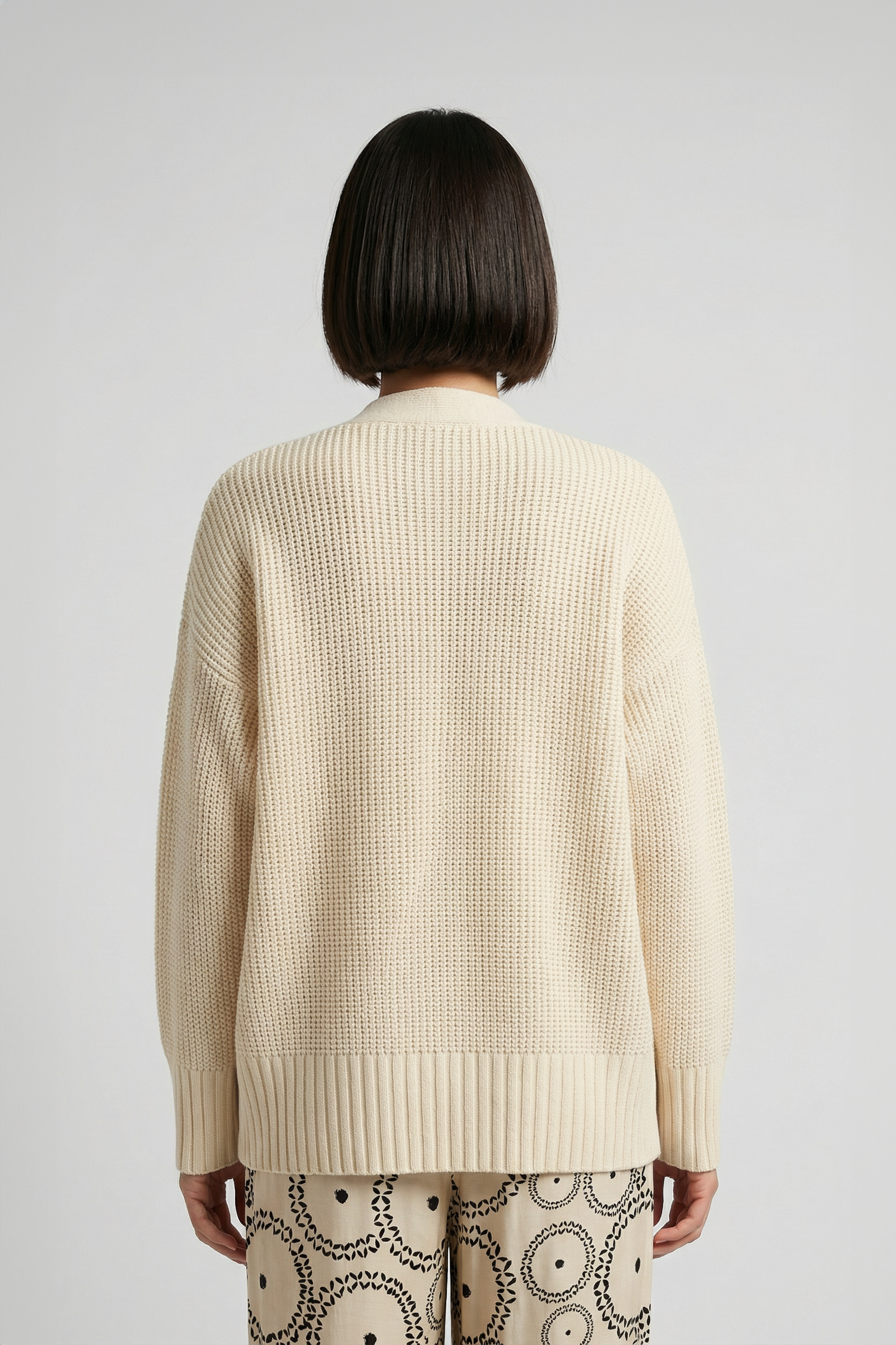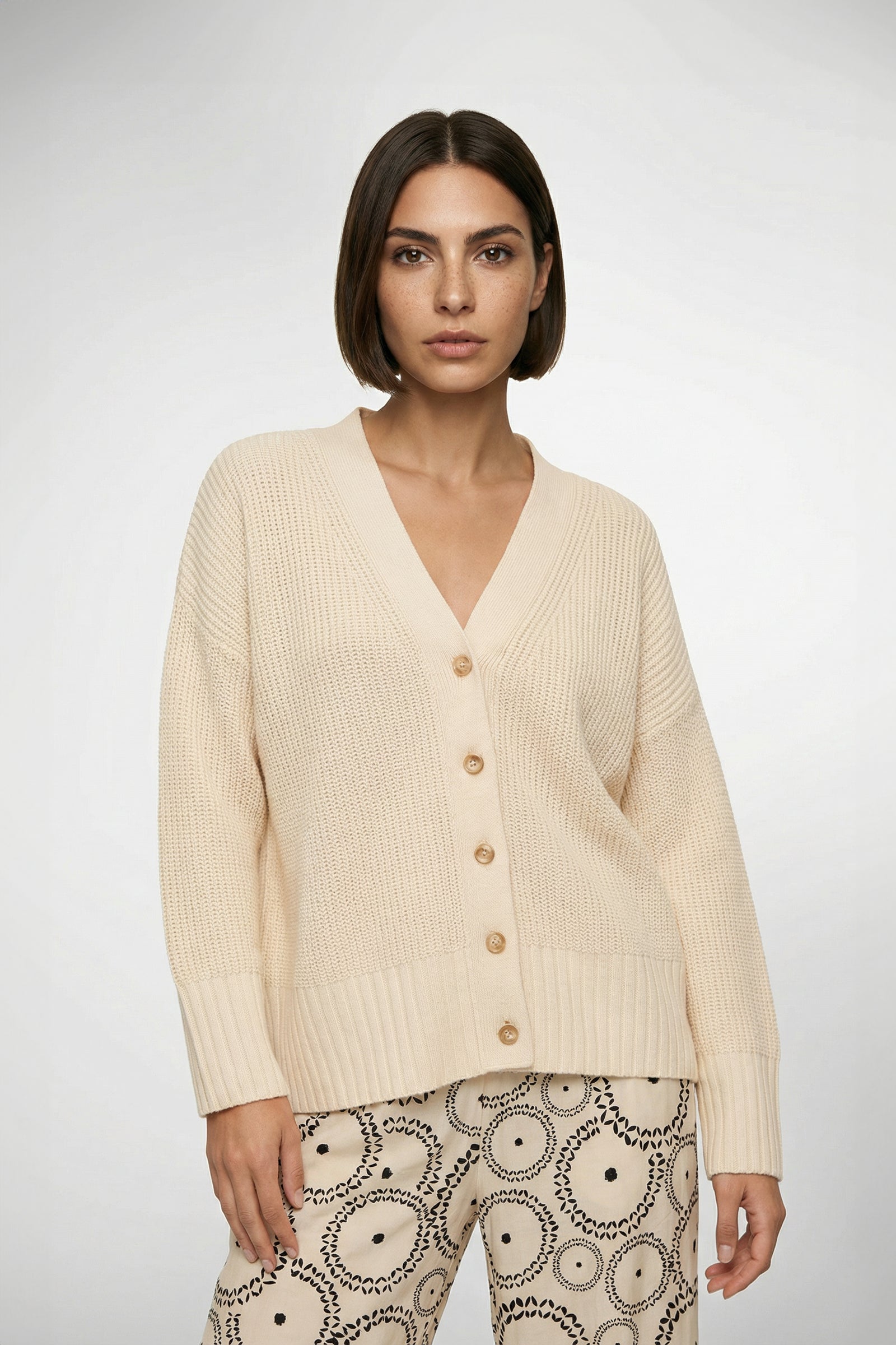 Confectionné en 100% cachemire, notre cardigan SOUL séduit par sa maille texturée qui dessine une allure graphique et moderne. Il arbore une coupe ample, des manches longues, des épaules tombantes et un col V féminin, prolongé par une ligne de jolis boutons en écaille qui accentue son charme intemporel. Des fentes sur les côtés accompagnement naturellement le mouvement et insufflent une élégante fluidité, tandis que ses finitions en bords-côtes structurent l'ensemble avec raffinement.