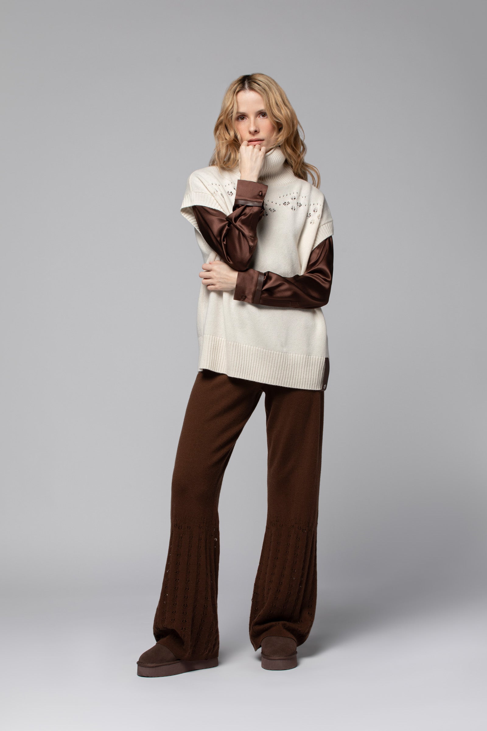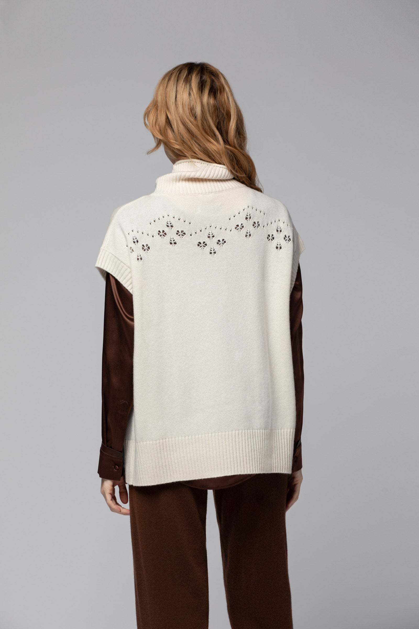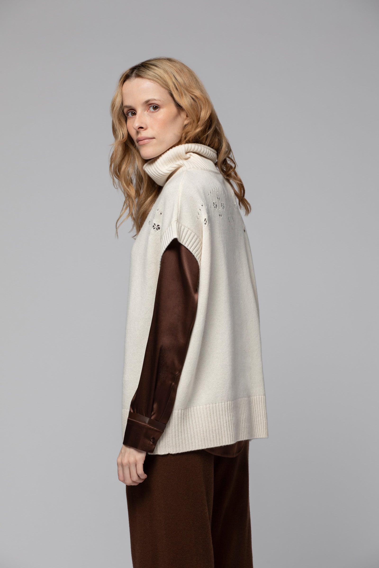 Notre pull sans manches POST est un véritable bijou. Tricoté dans un doux mélange de laine et cachemire, il séduit par son jeu de maille créative ajourée à la poitrine, qui compose une allure élégante et féminine. Sa coupe légèrement amplifiée, structurée par des finitions en maille côtelée, est sublimée par un col roulé aux bords roulottés, qui modernise ses lignes avec finesse. Une patte en cuir, rehaussée d'un œillet métallique estampillés MAX&MOI, signe l'ourlet avec raffinement.