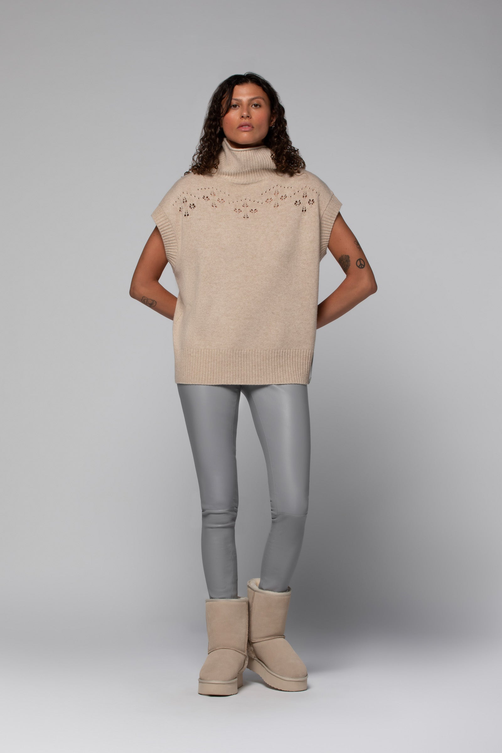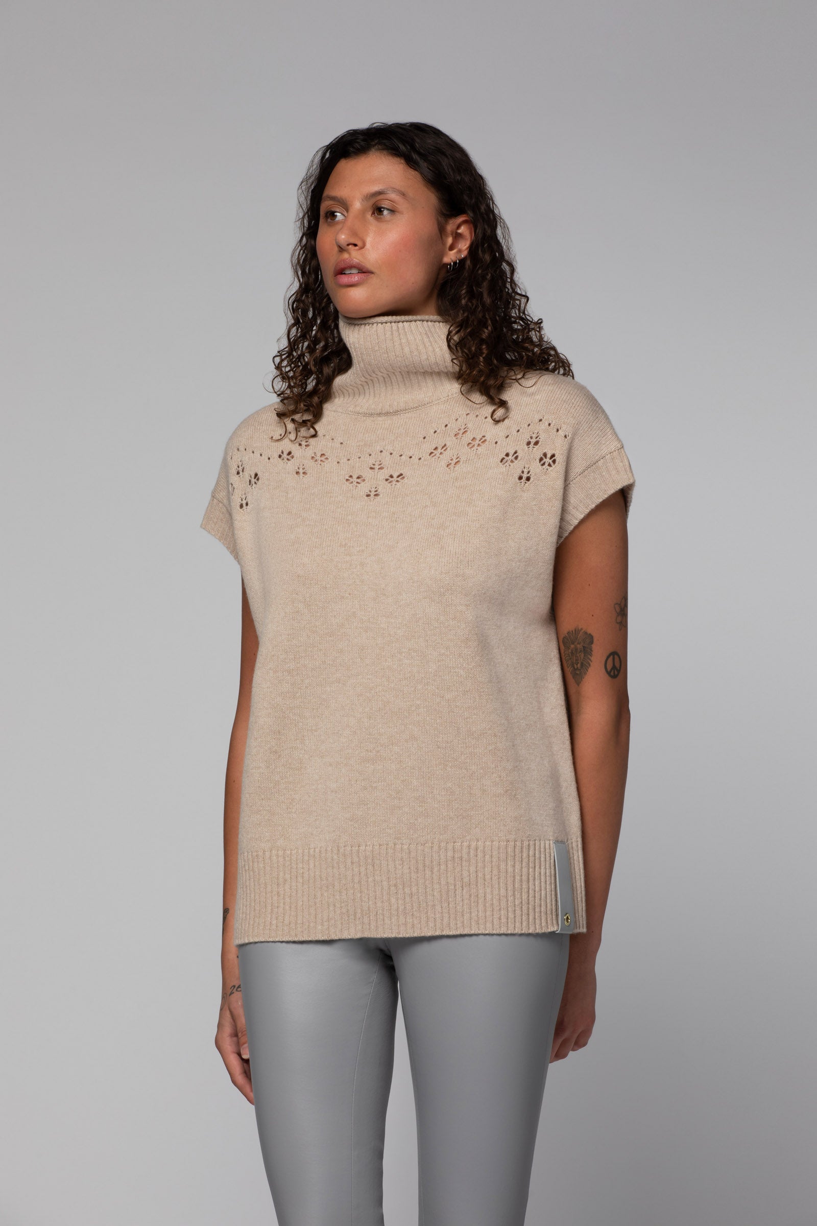 Notre pull sans manches POST est un véritable bijou. Tricoté dans un doux mélange de laine et cachemire, il séduit par son jeu de maille créative ajourée à la poitrine, qui compose une allure élégante et féminine. Sa coupe légèrement amplifiée, structurée par des finitions en maille côtelée, est sublimée par un col roulé aux bords roulottés, qui modernise ses lignes avec finesse. Une patte en cuir, rehaussée d'un œillet métallique estampillés MAX&MOI, signe l'ourlet avec raffinement.